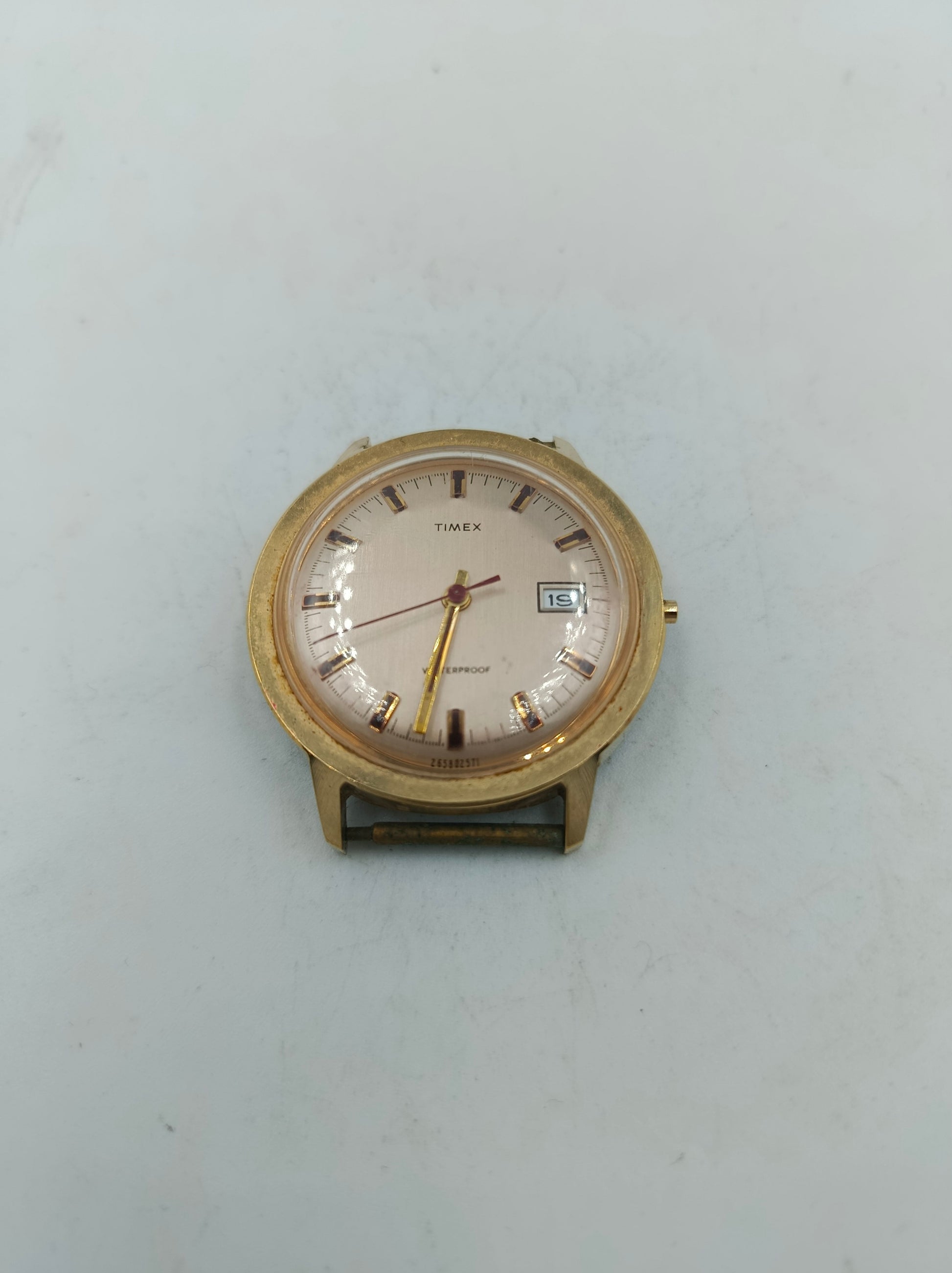 Diese klassische Vintage-Herrenarmbanduhr der Marke Timex verfügt über ein elegantes, goldfarbenes Gehäuse und ein helles Zifferblatt mit markanten, applizierten Stundenmarkierungen und einer Datumsanzeige bei 3 Uhr. Es handelt sich um ein mechanisches Modell mit Handaufzug, das für seine Zuverlässigkeit bekannt ist. Die Uhr hat ein offenes Bandende, sodass sie mit einem Armband Ihrer Wahl ergänzt werden kann.