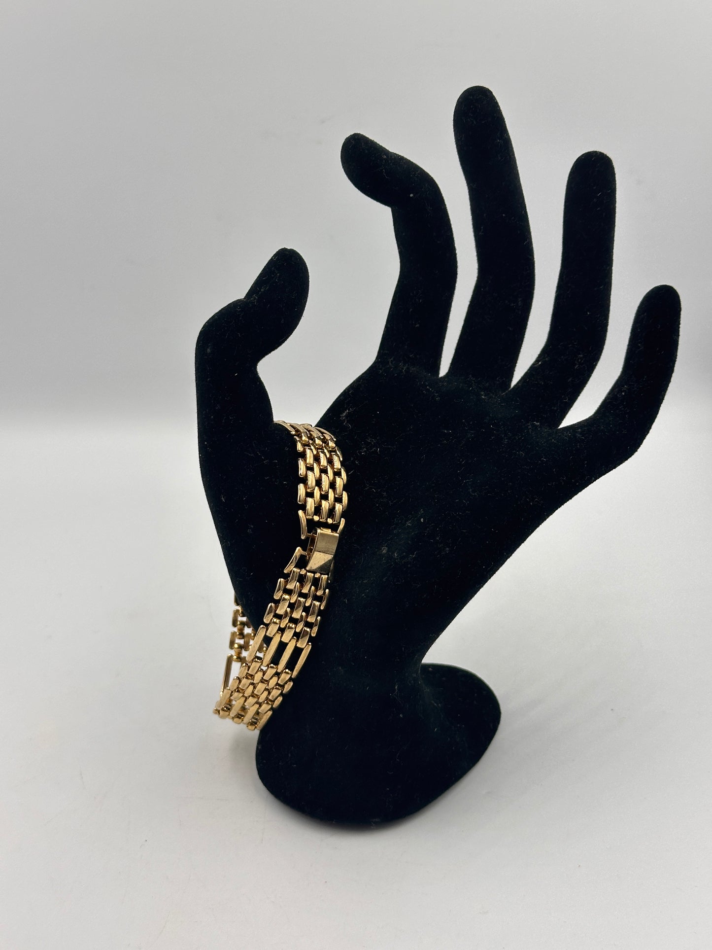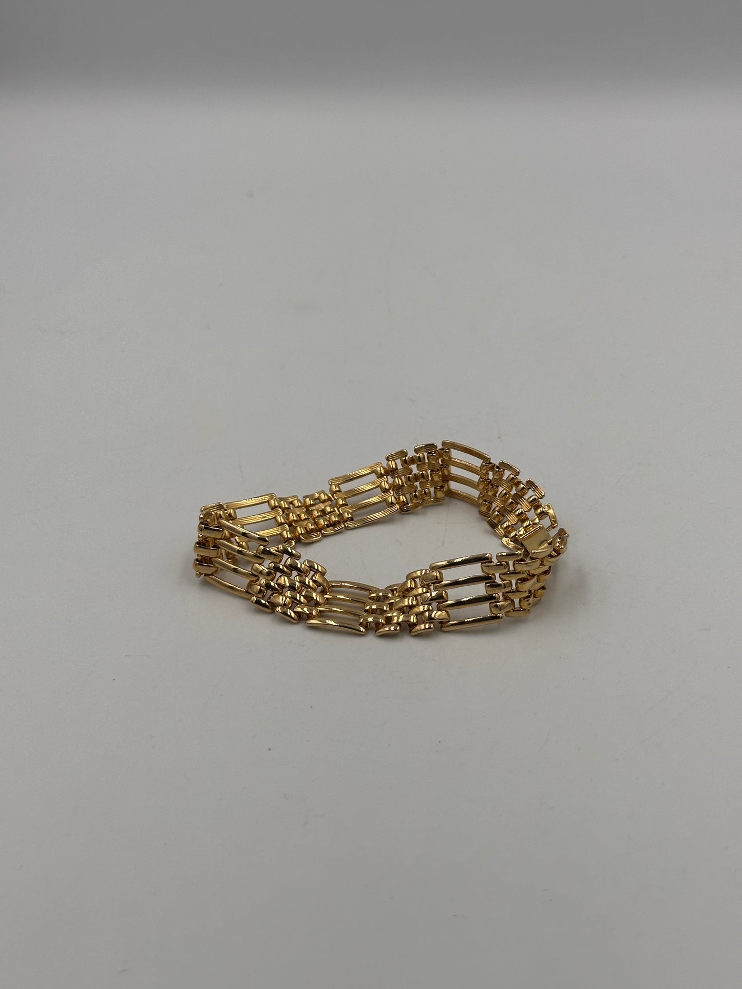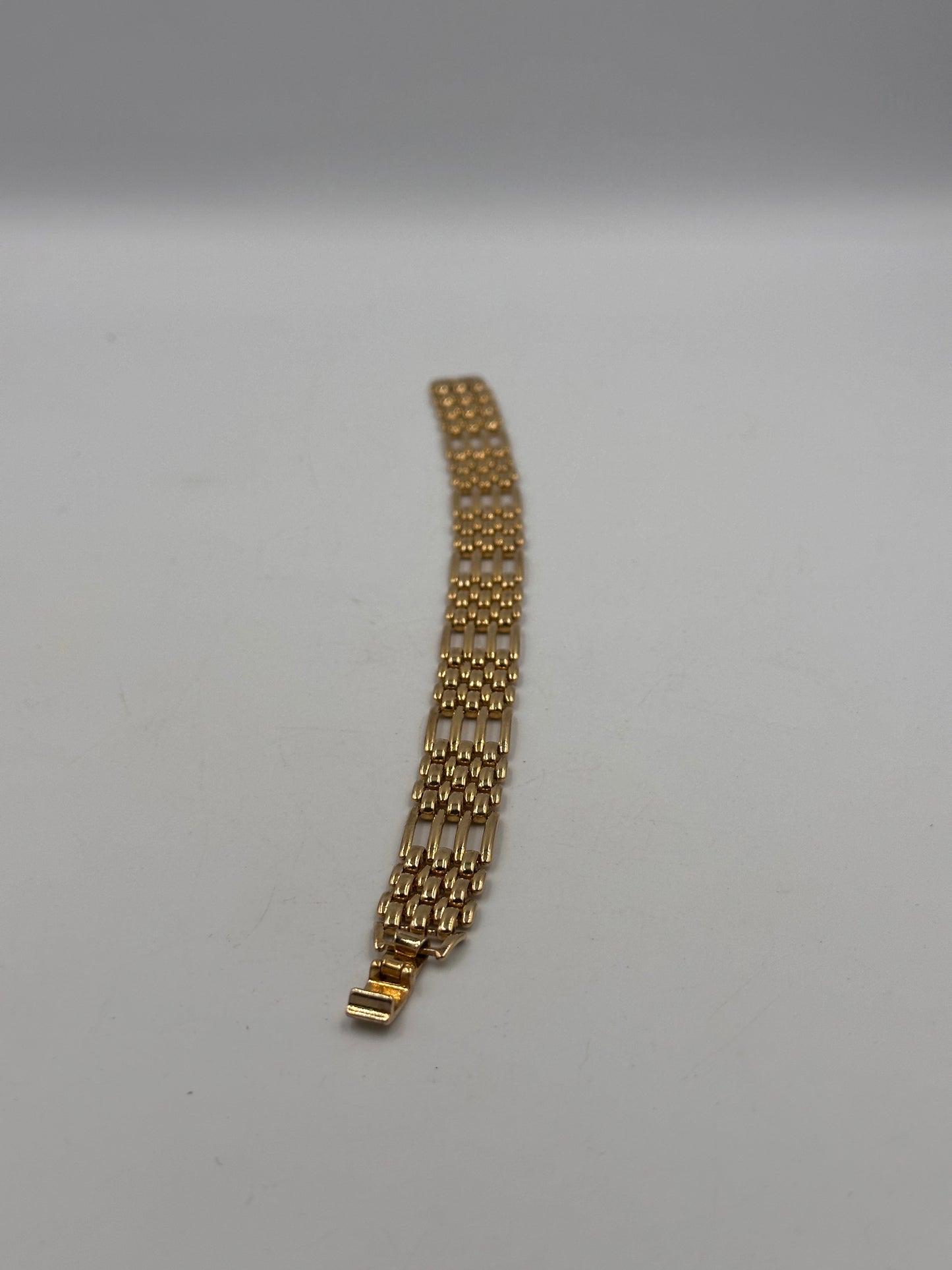Dieses elegante Gliederketten-Armband besticht durch seine hochwertige Vergoldung und zeitlose Optik. Mit einer Länge von 18 cm und einem Gewicht von 16,5 Gramm liegt es angenehm am Handgelenk und ist ein stilvolles Accessoire für jeden Anlass. Der gebrauchte Zustand des Armbands verleiht ihm einen besonderen Charme und macht es zu einem einzigartigen Schmuckstück.