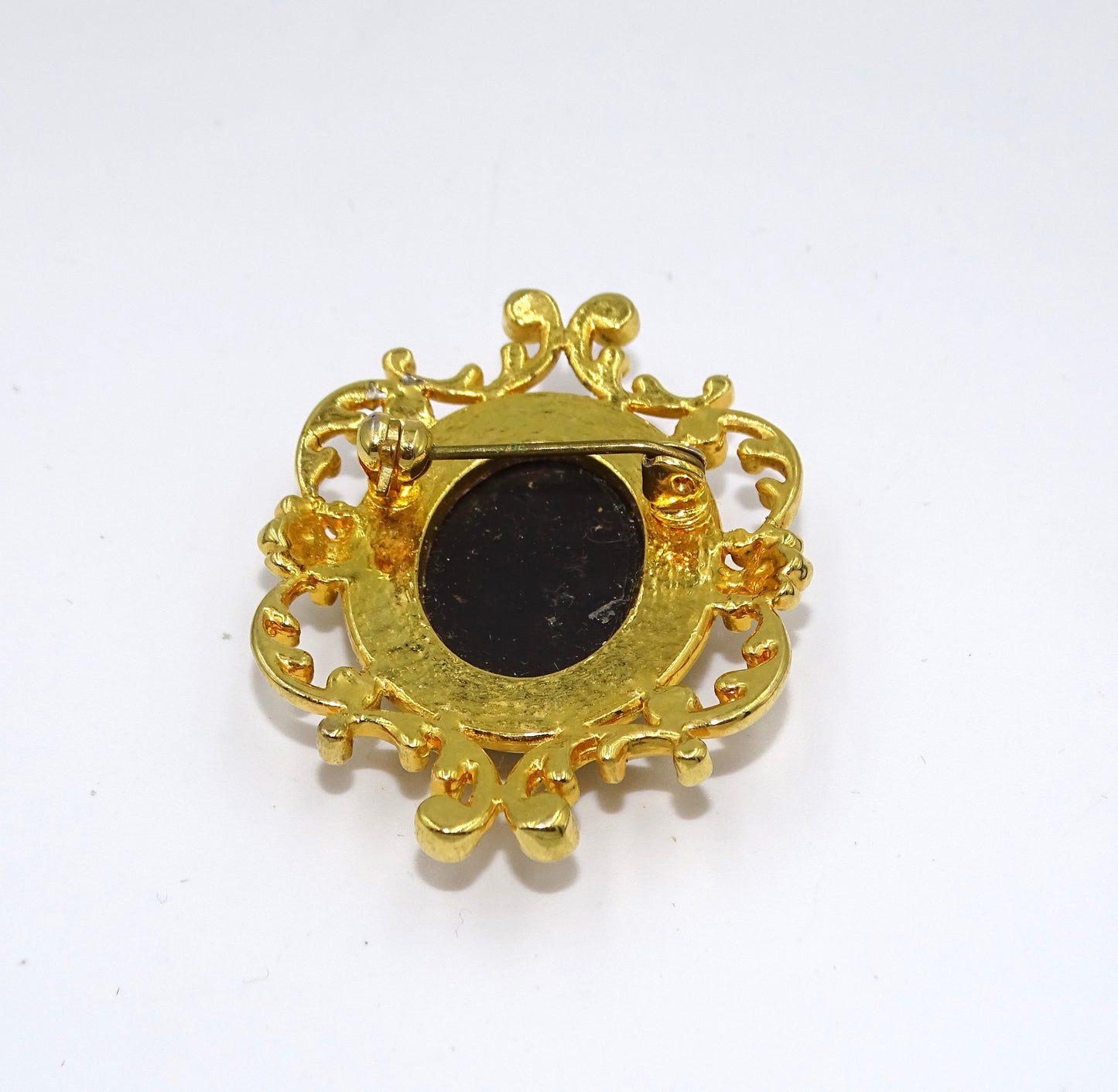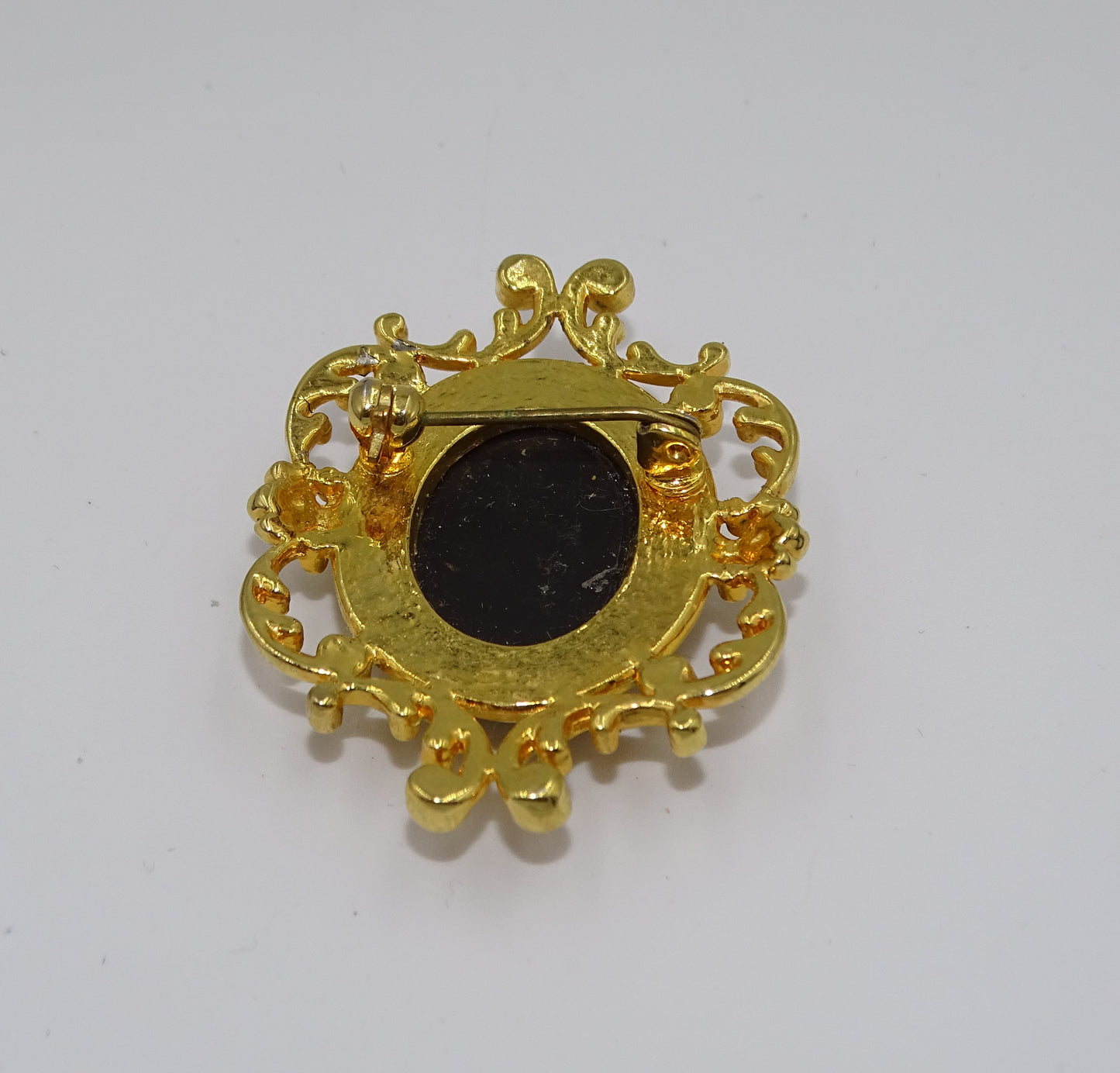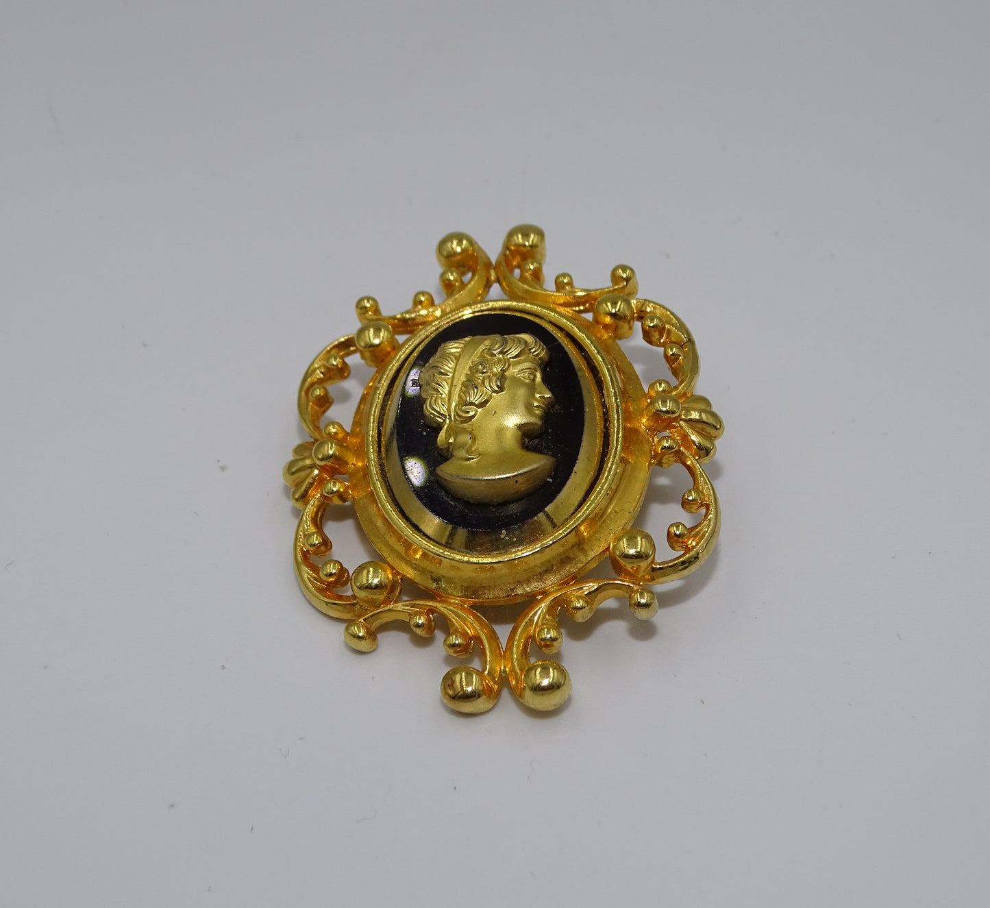 • Cameo-Motiv: Die Brosche zeigt einen nach rechts gerichteten Cameo-Kopf auf schwarzem Glas, der in einer goldfarbenen Fassung ruht.