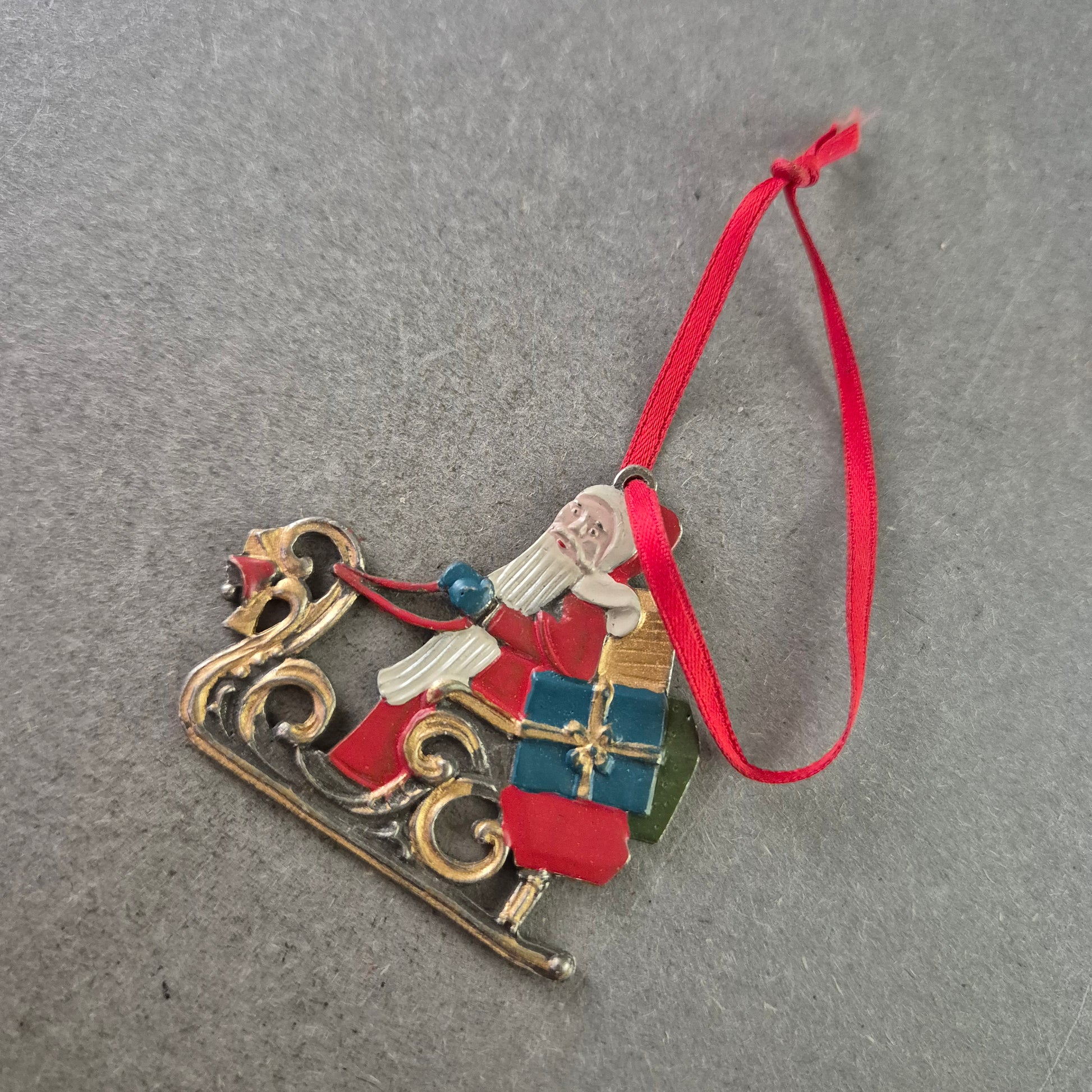 Vintage Weihnachtsbaumanhänger – Weihnachtsmann mit Geschenken (Metall, Emaille)