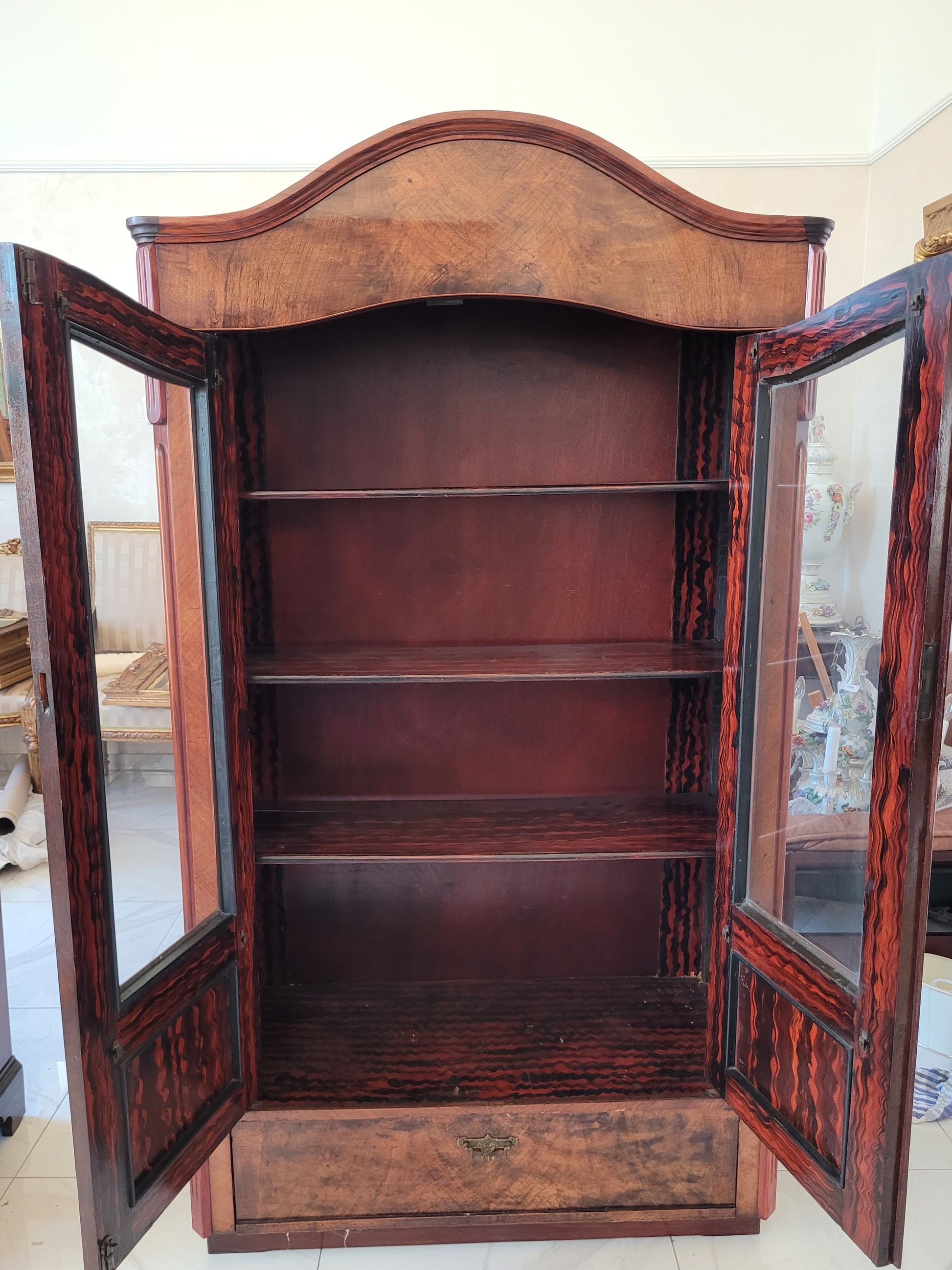 zum Verkauf steht ein eleganter, zweitüriger Vitrinenschrank aus massivem Holz, vermutlich Nussbaum, mit schönen Furnierarbeiten und dekorativen Glaseinsätzen. Der Schrank zeigt eine klassisch geschwungene Krone, aufwendig profilierte Lisenen sowie fein gearbeitete, ornamentierte Messingschlüsselschilder und Beschläge. Im Inneren befinden sich zwei Ablageböden und eine großzügige Schublade im Sockelbereich. Die Innenflächen sind in markantem Maserholzdekor ausgeführt