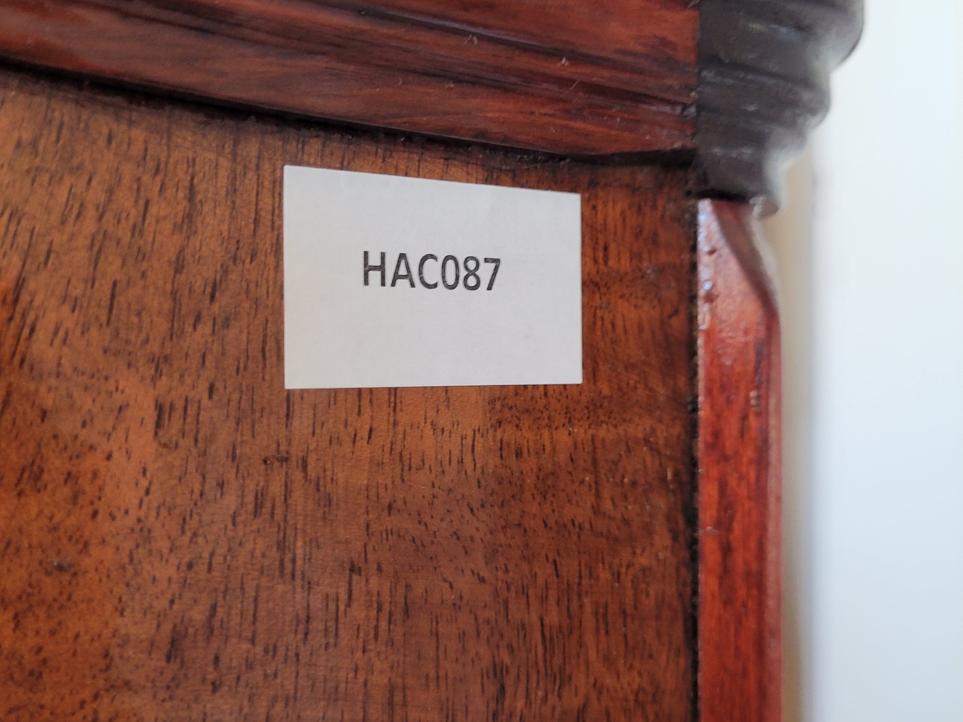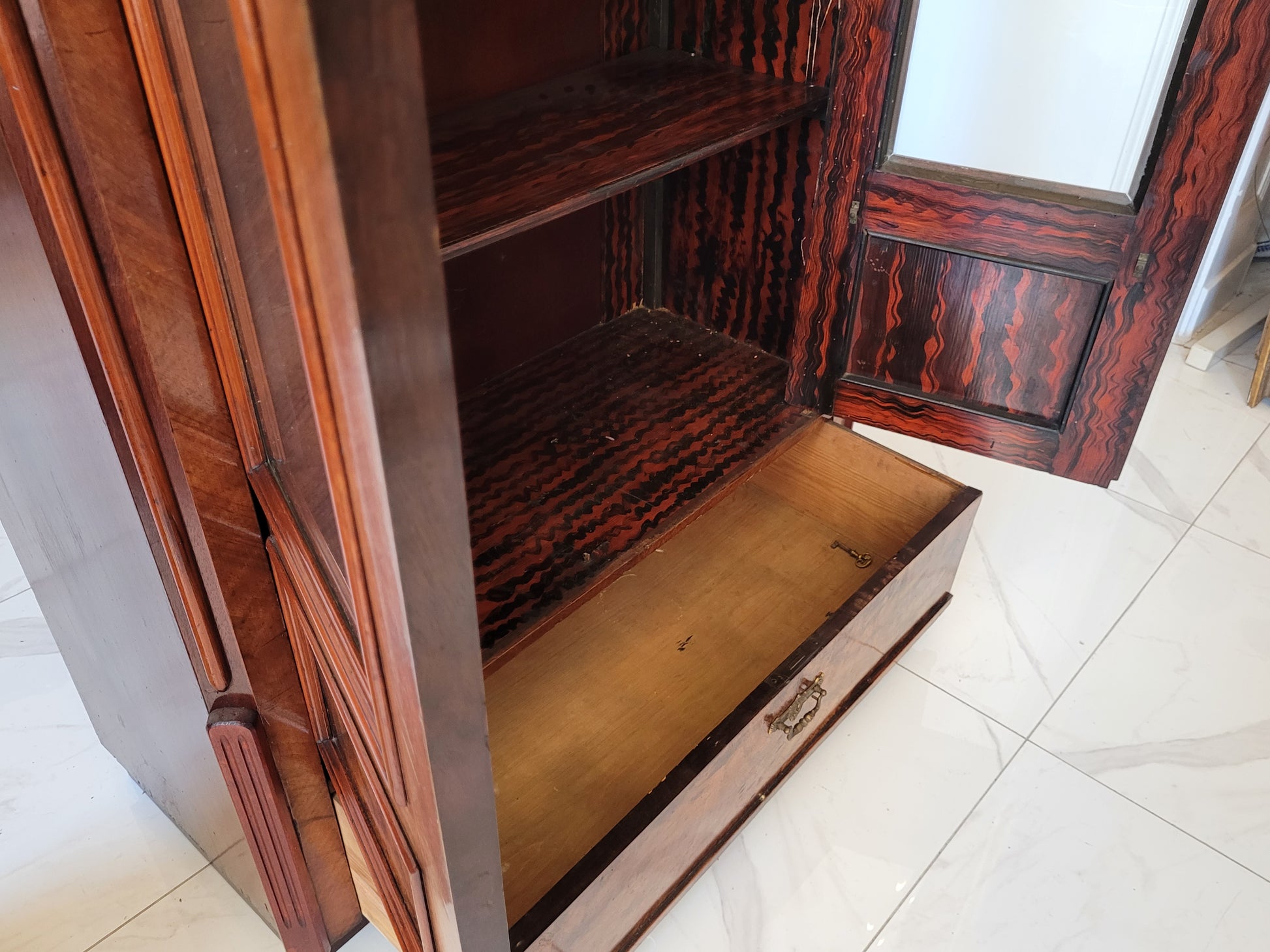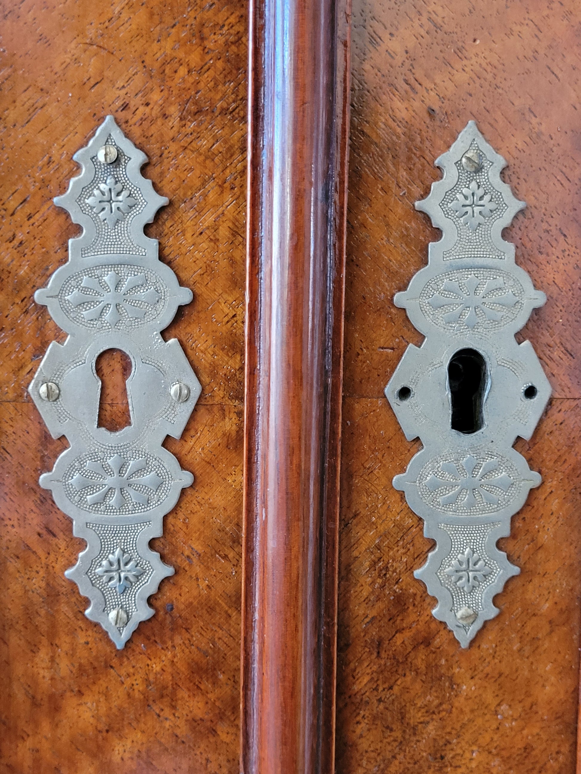 Dekor: Profilierte Krone, florale Beschläge, furnierte Felder mit feiner Maserung