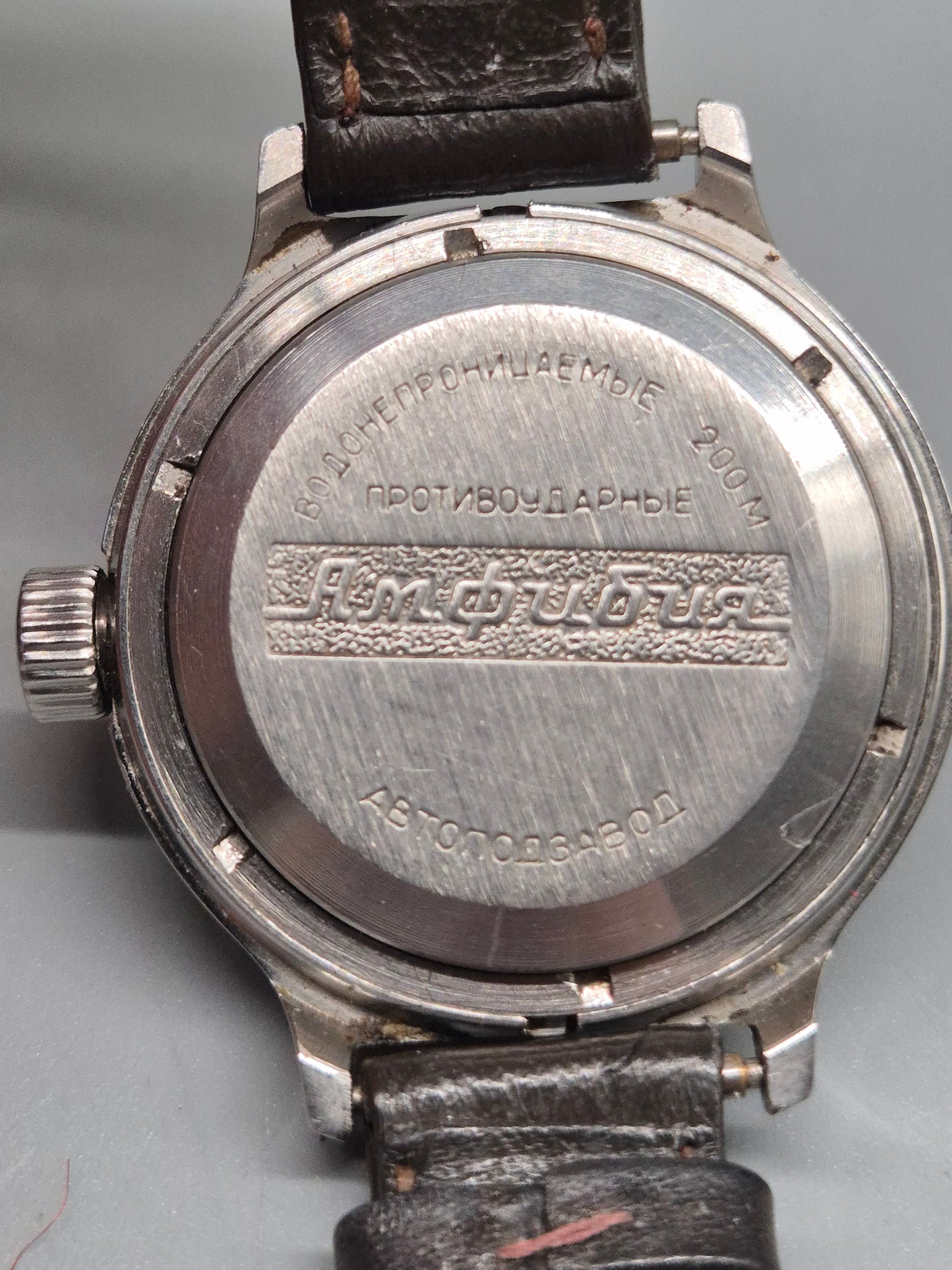 Diese klassische Vostok Amphibia Taucher Uhr stammt aus der Sowjetzeit und überzeugt durch ihr zeitloses Design und solide Technik. Das massive Edelstahlgehäuse mit markantem Lünetten-Design sowie das charakteristische Zifferblatt mit Tauchermotiv machen sie zu einem echten Hingucker. Der robuste Boden zeigt die Gravur „Amphibia“, „водонепроницаемые 200 m“ (wasserdicht 200 m) sowie „автоподзавод“ (Automatik) – echte Markenzeichen der Amphibia-Serie. Die automatische 2416‑Werkkonstruktion mit 21 Steinen und Datum schaltet zuverlässig und macht die Uhr alltagstauglich.
