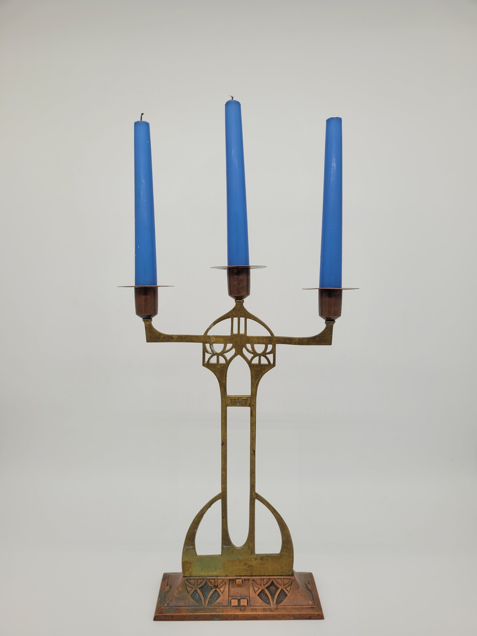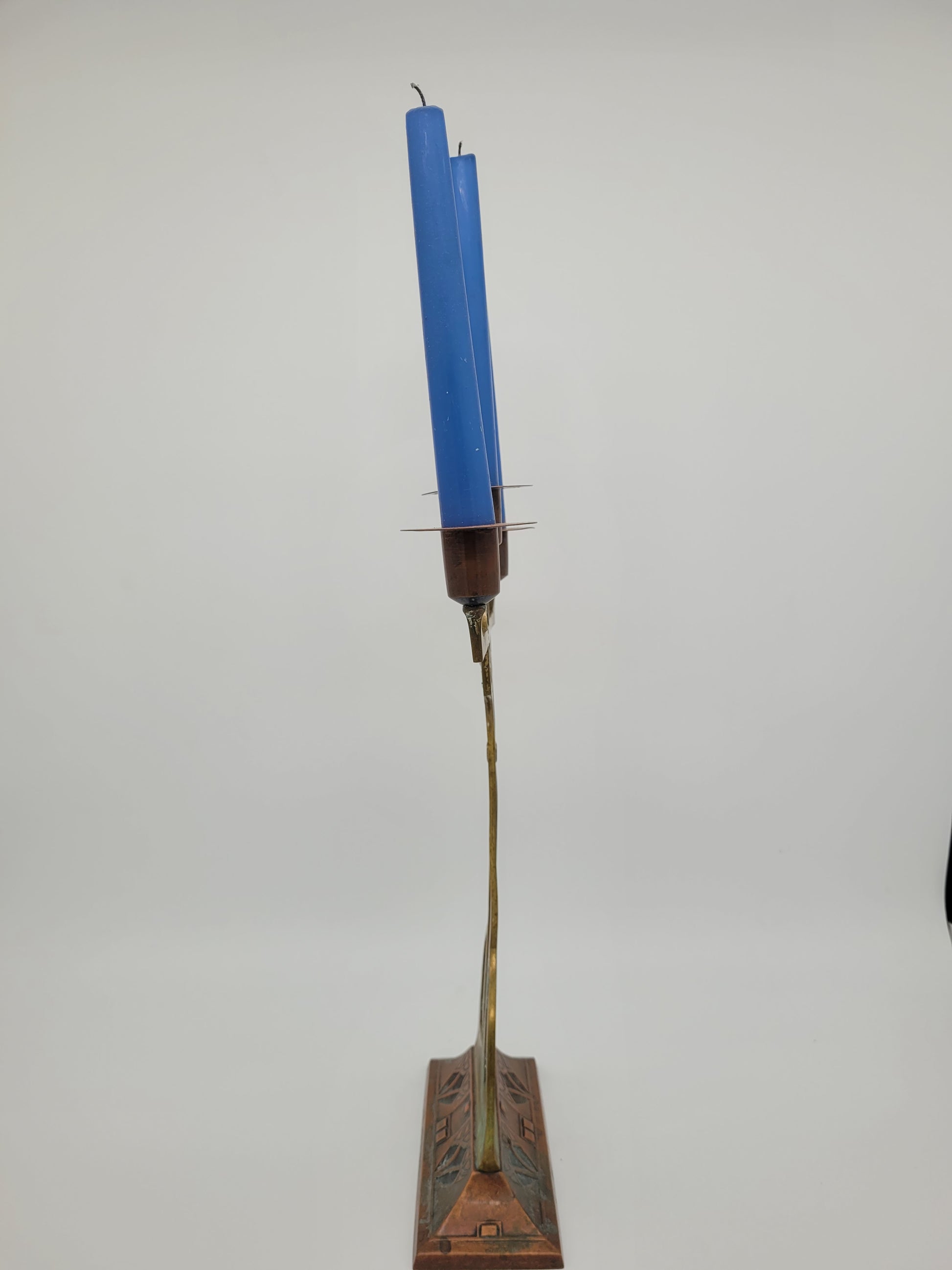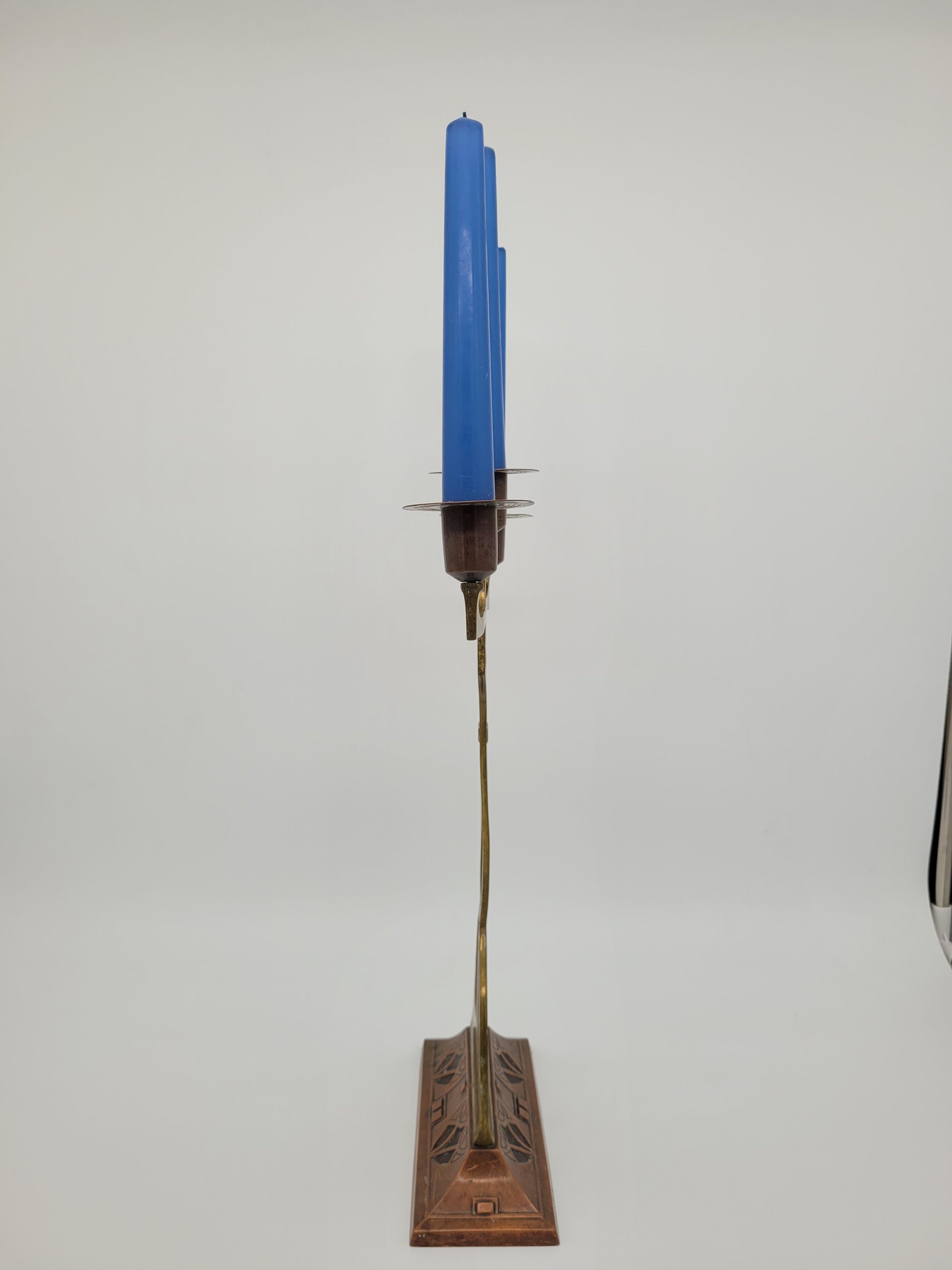 Gefertigt wurden die Leuchter aus Messing und Kupfer, was ihnen eine warme Ausstrahlung verleiht. Mit Kerzen bestückt entfalten sie eine besonders stimmungsvolle Wirkung und sind nicht nur ein schönes Sammlerobjekt, sondern auch ein dekorativer Akzent für den Wohnbereich.