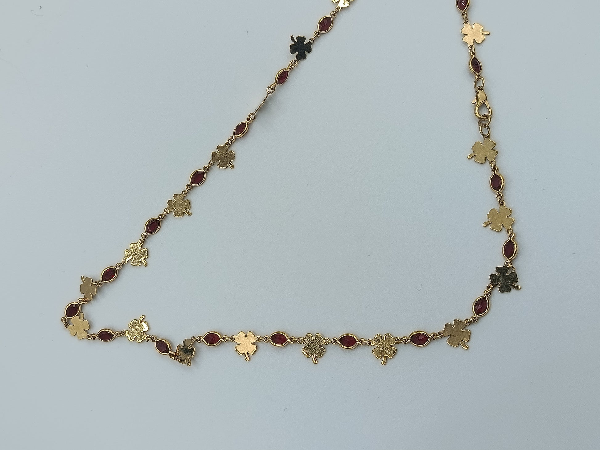 Zarte Goldfarbene Kette mit Kleeblatt- und Rubinroten Elementen
