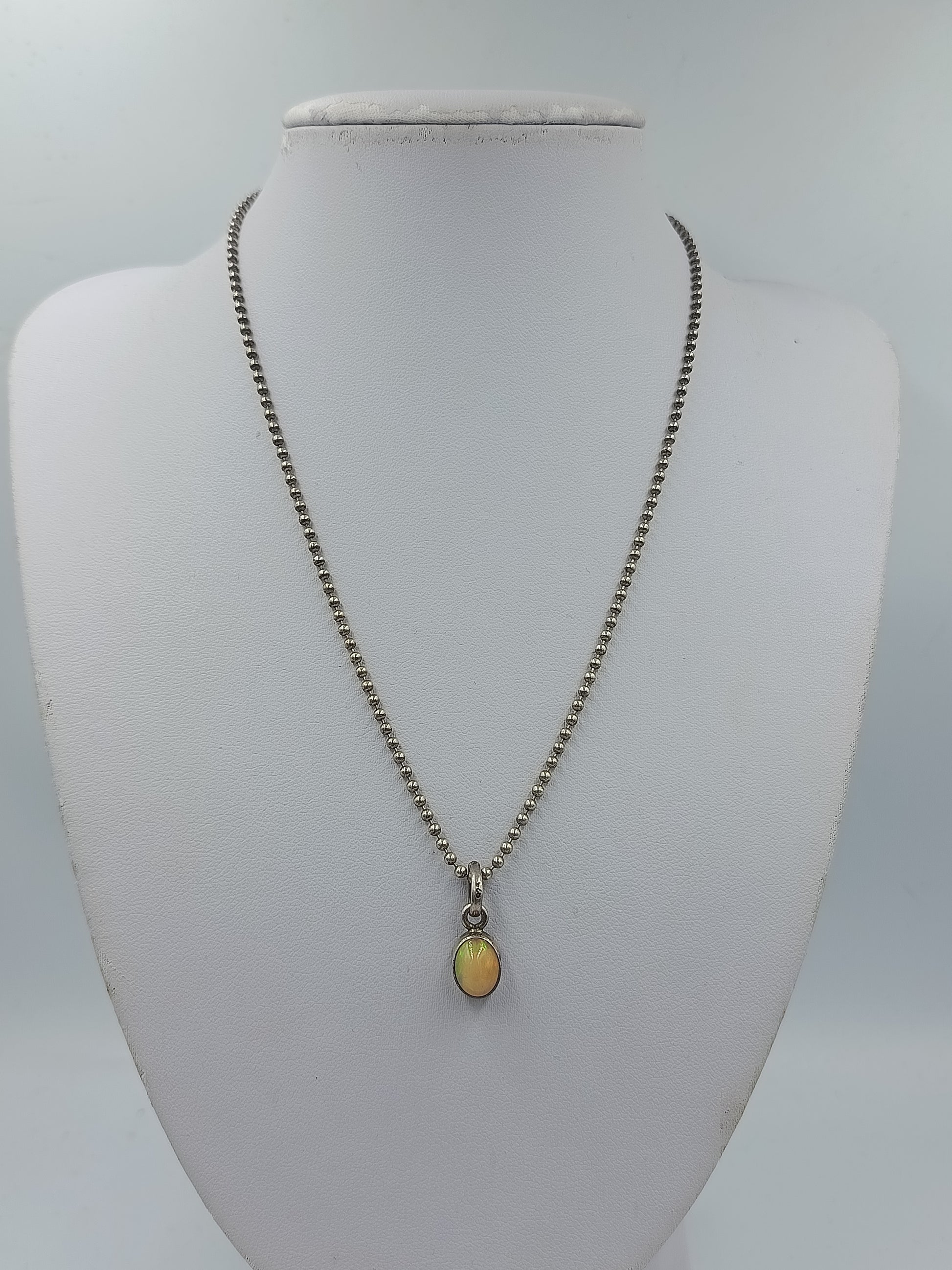 Diese feine Kette aus echtem 925 Silber überzeugt durch ihren dezenten ovalen Opal Anhänger der in warmen Gelb und Grüntönen schimmert. Die klassische Kugelkette wirkt schlicht und elegant und setzt den Stein stilvoll in Szene. Durch ihr leichtes Tragegefühl eignet sich die Kette ideal für den Alltag ebenso wie für besondere Anlässe und lässt sich vielseitig kombinieren.