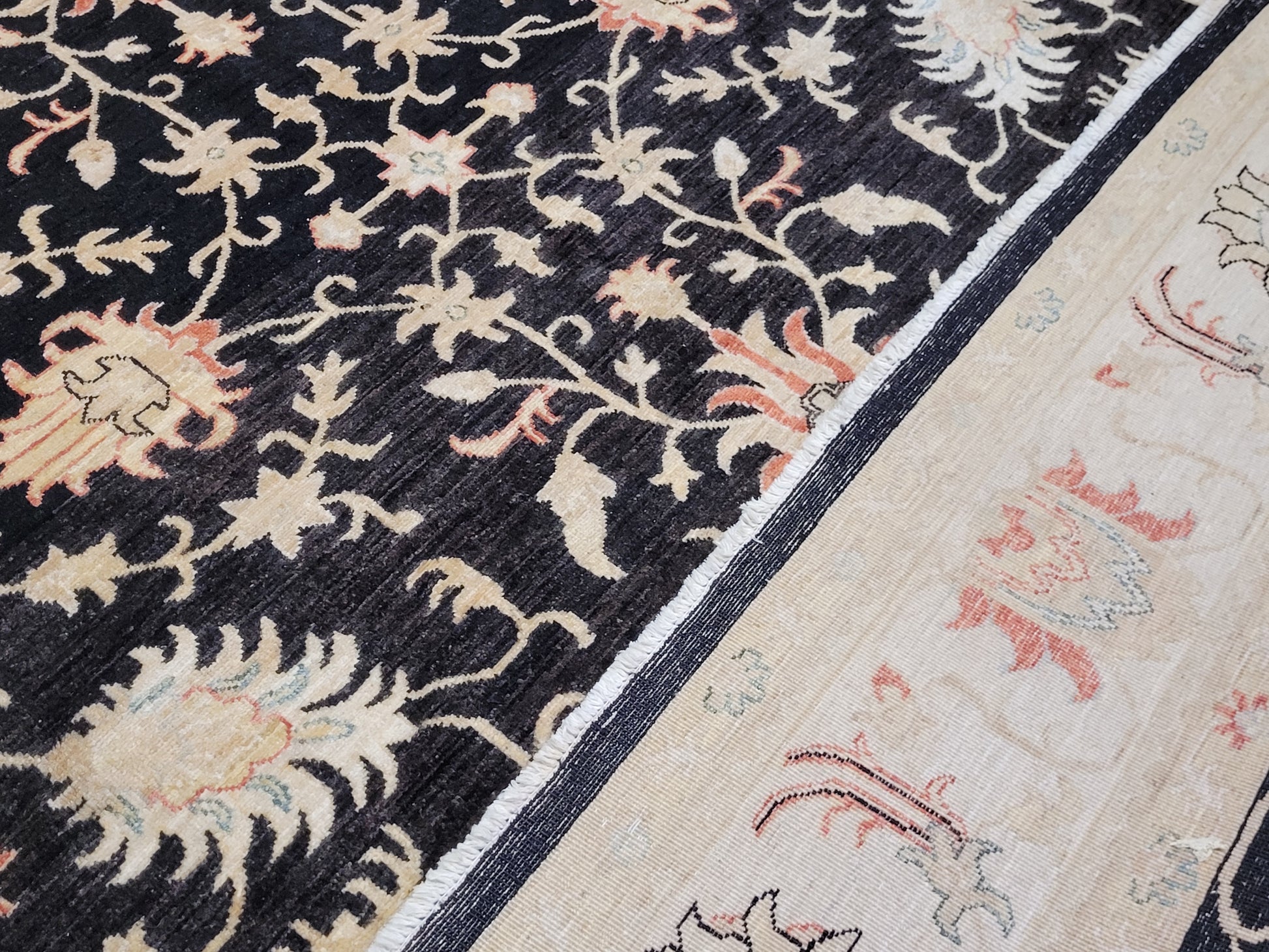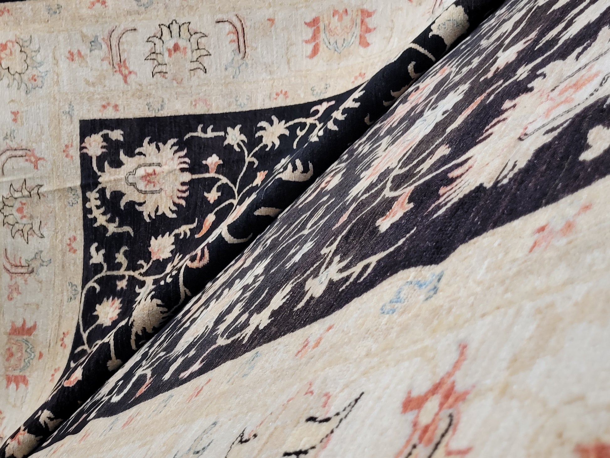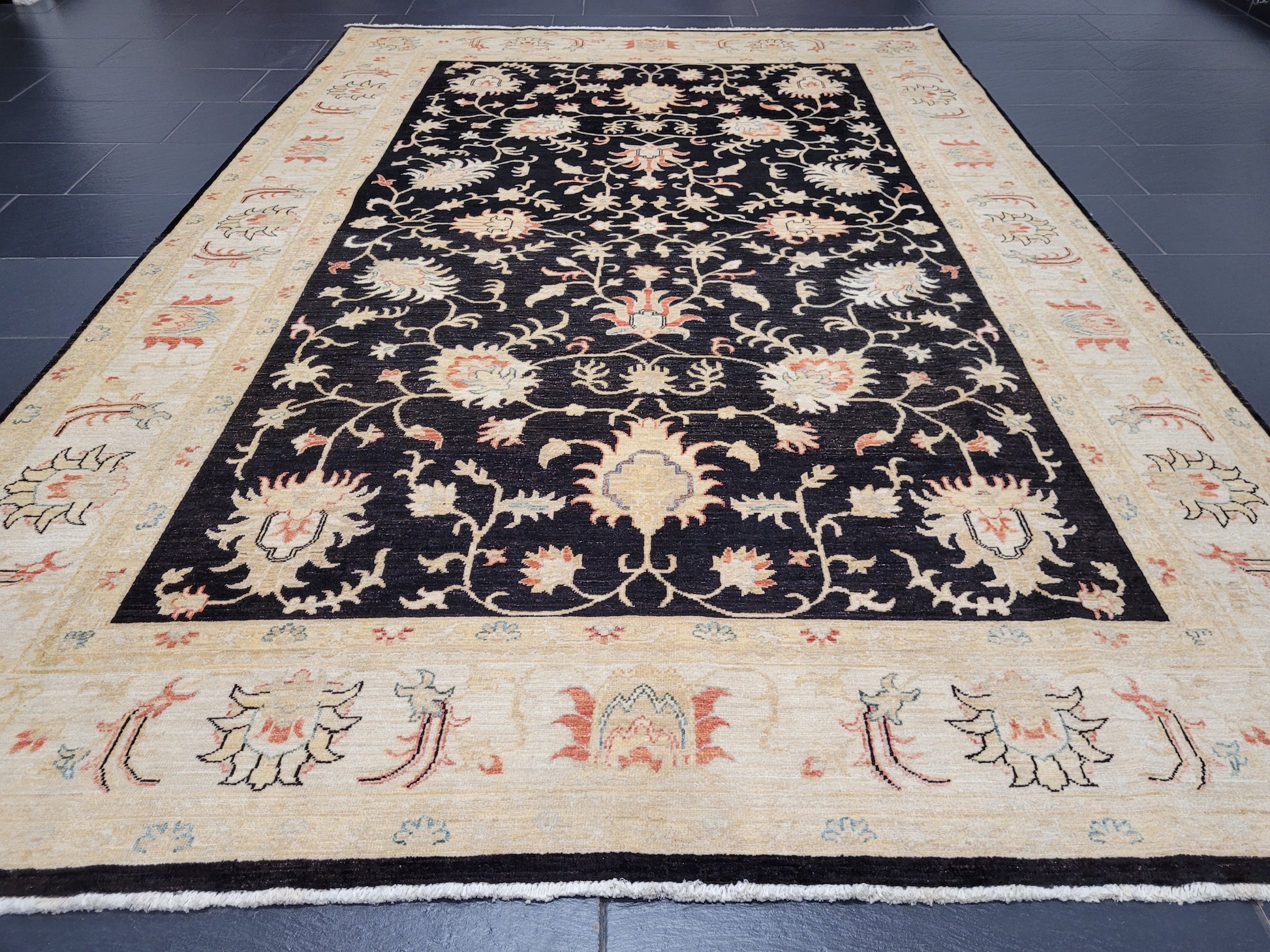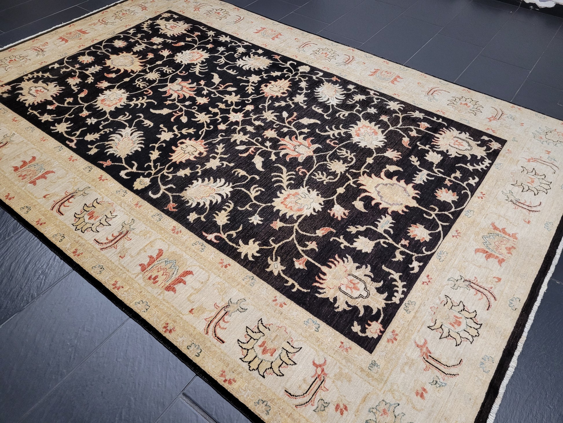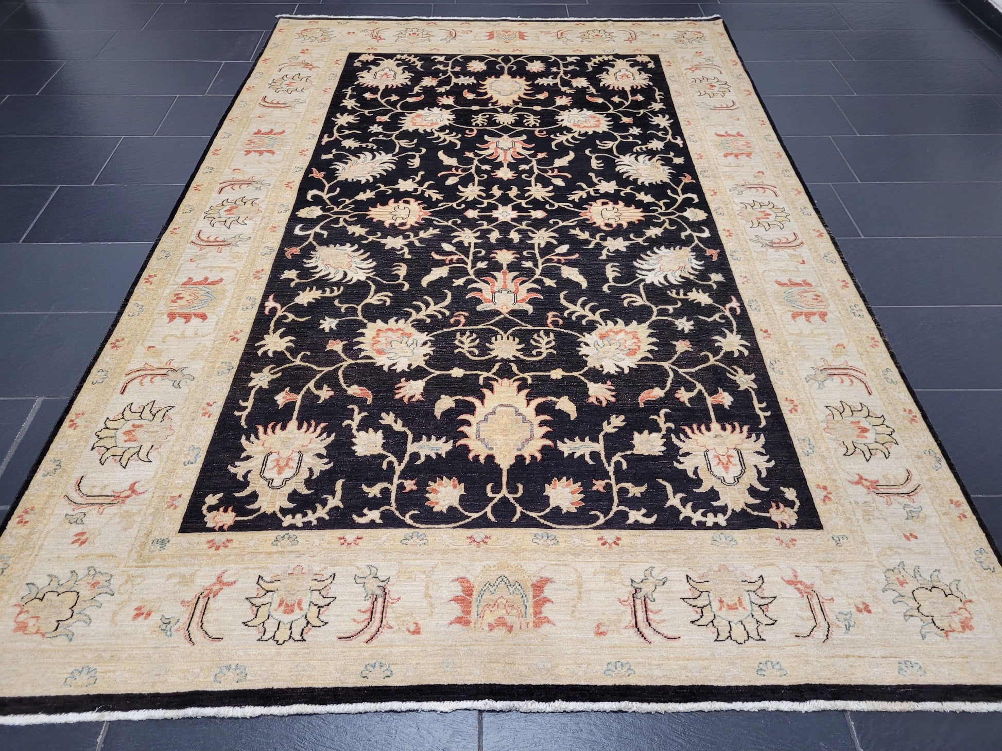 zum Verkauf steht ein hochwertiger, handgeknüpfter Ziegler Teppich aus 100 % reiner Ghazni-Wolle mit den Maßen 300 × 200 cm und einem Gewicht von etwa 18 kg. Der Teppich zeigt ein klassisches florales Allover-Muster auf tiefschwarzem Fond, eingerahmt von einer breiten, hellbeigen Bordüre mit fein ausgearbeiteten Ornamenten in zarten Rot- und Türkistönen. Die Kombination aus dunklem Grund und hellen, lebendigen Akzenten verleiht dem Stück eine edle und zugleich moderne Wirkung. Die Ghazni-Wolle sorgt für eine besonders dichte, weiche Oberfläche und hohe Strapazierfähigkeit.