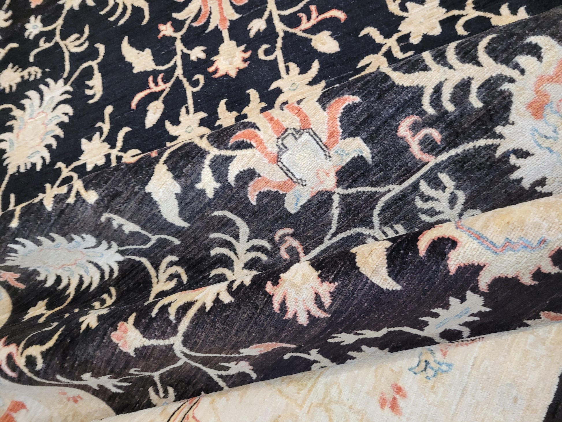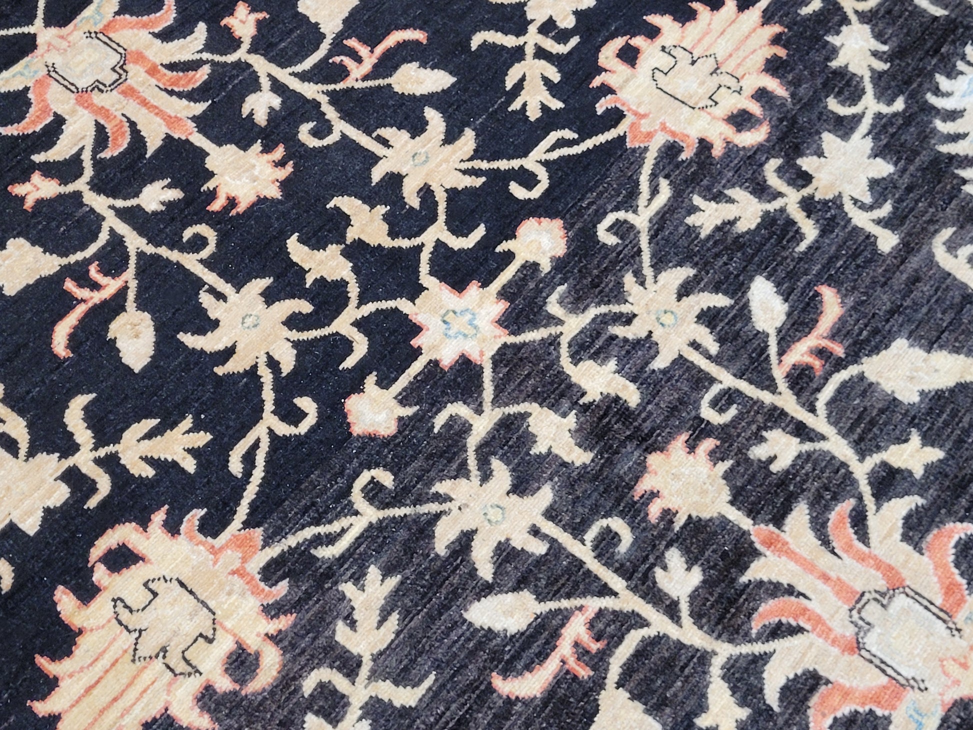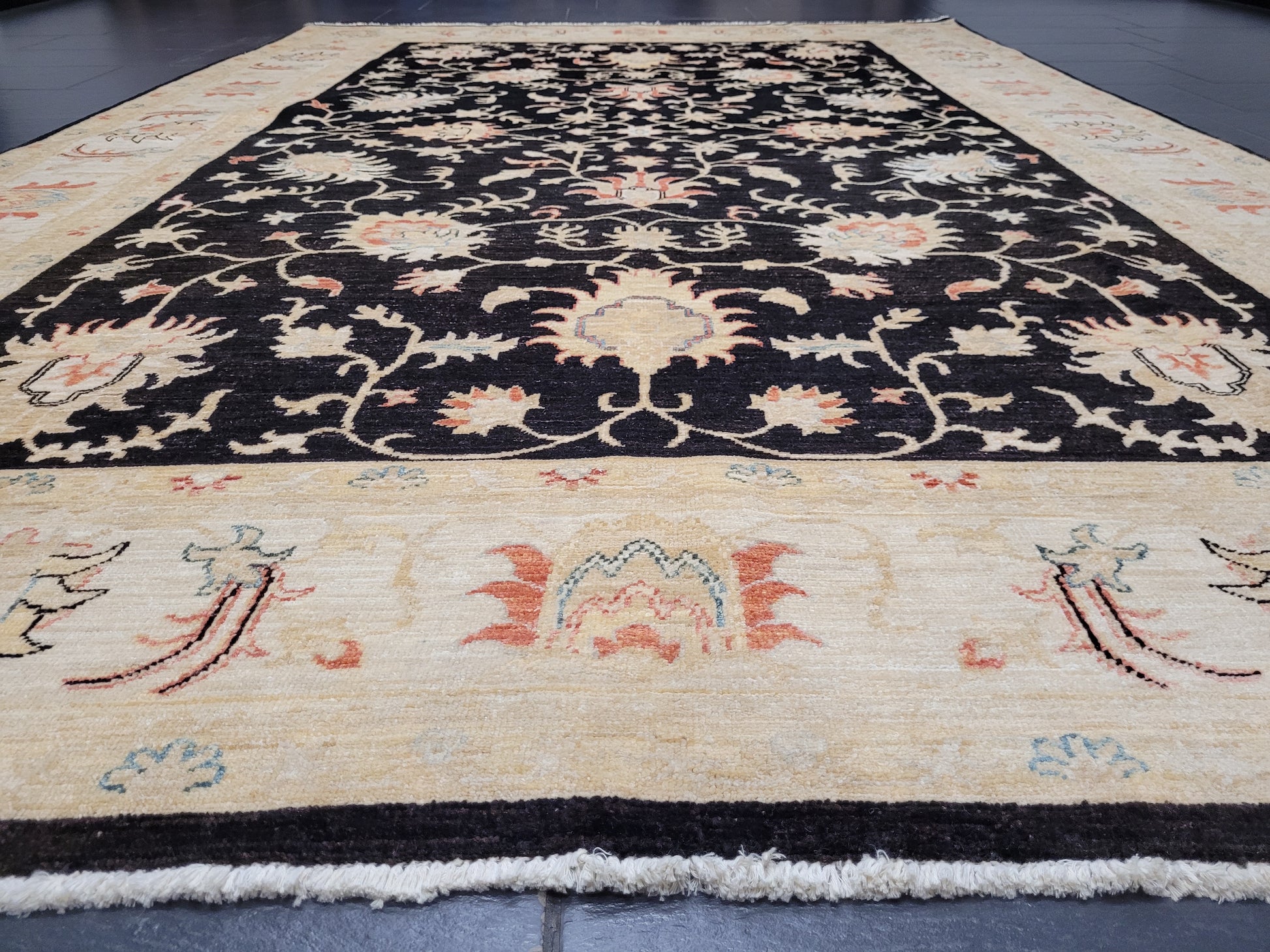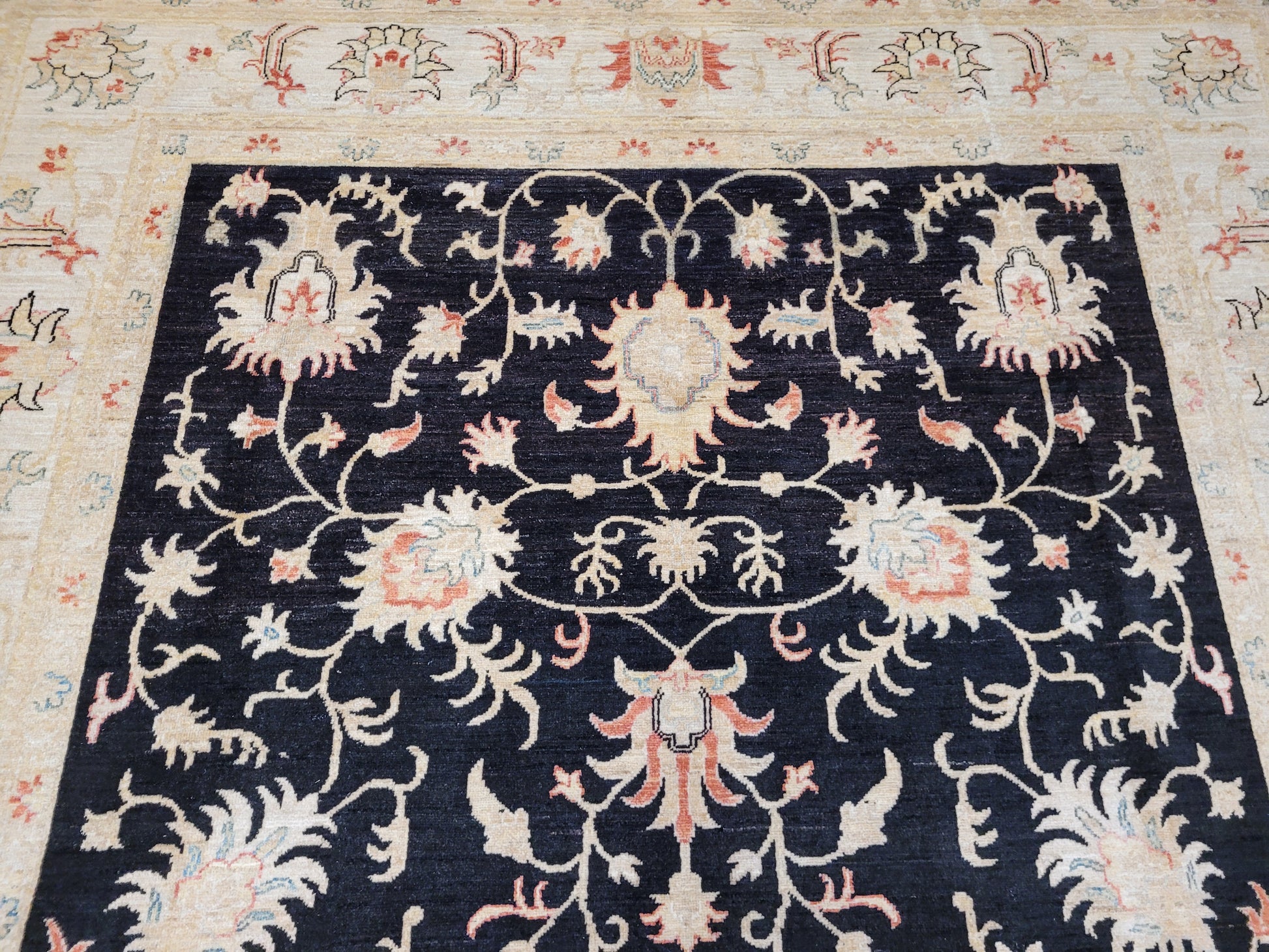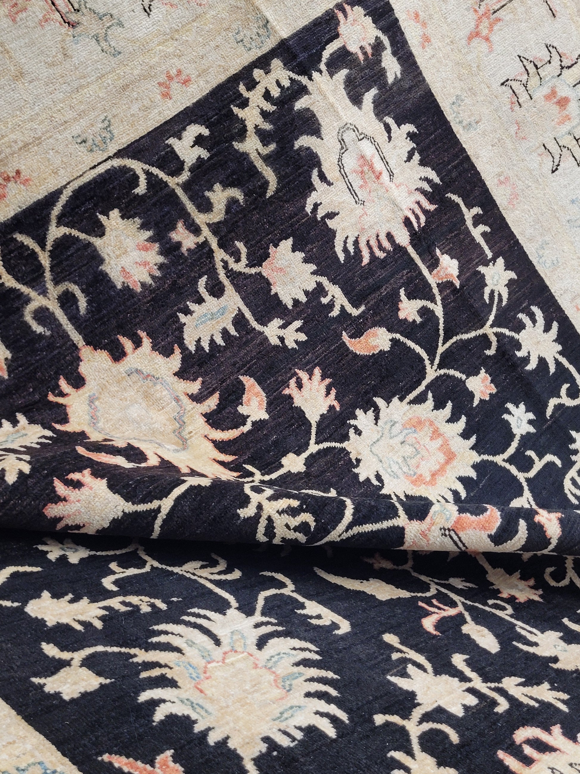 zum Verkauf steht ein hochwertiger, handgeknüpfter Ziegler Teppich aus 100 % reiner Ghazni-Wolle mit den Maßen 300 × 200 cm und einem Gewicht von etwa 18 kg. Der Teppich zeigt ein klassisches florales Allover-Muster auf tiefschwarzem Fond, eingerahmt von einer breiten, hellbeigen Bordüre mit fein ausgearbeiteten Ornamenten in zarten Rot- und Türkistönen. Die Kombination aus dunklem Grund und hellen, lebendigen Akzenten verleiht dem Stück eine edle und zugleich moderne Wirkung. Die Ghazni-Wolle sorgt für eine besonders dichte, weiche Oberfläche und hohe Strapazierfähigkeit.