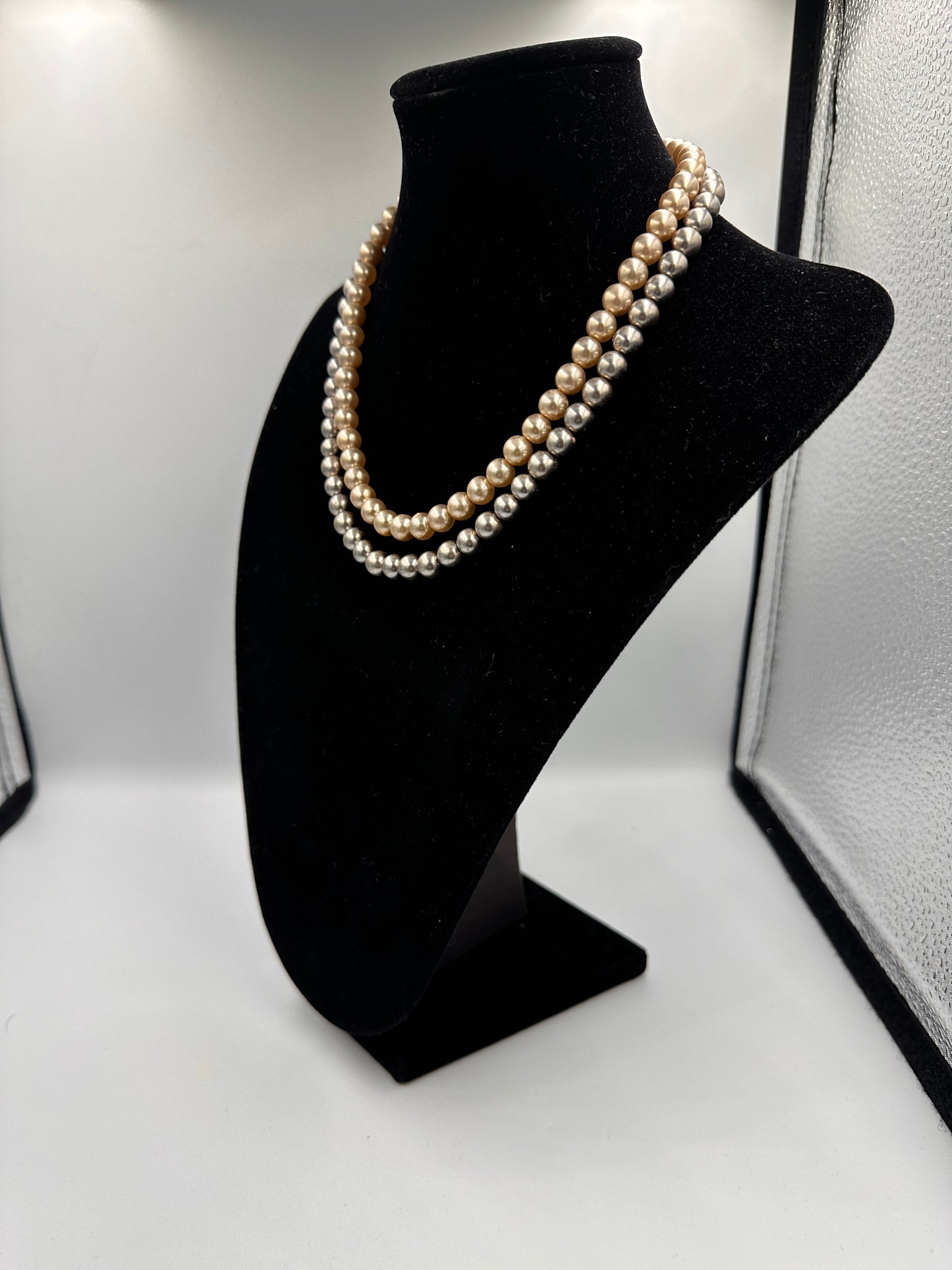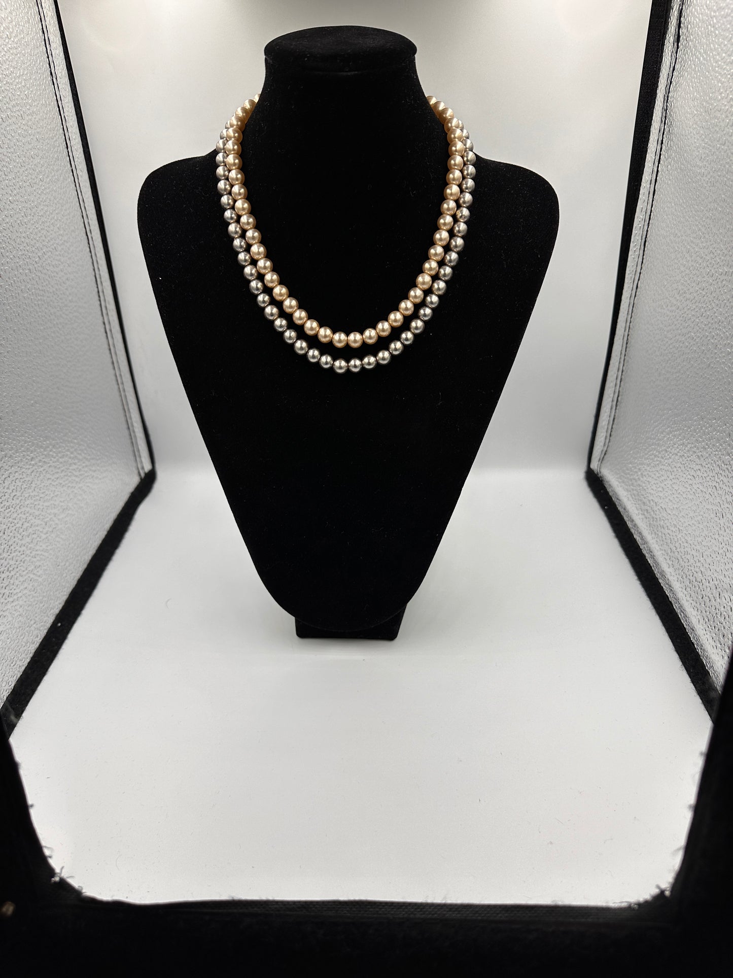 Diese exquisite zweireihige Perlenkette besticht durch ihre elegante Kombination aus zwei harmonierenden Farben. Die Perlen sind sorgfältig ausgewählt und kunstvoll aufgereiht, um einen luxuriösen und zeitlosen Look zu kreieren.