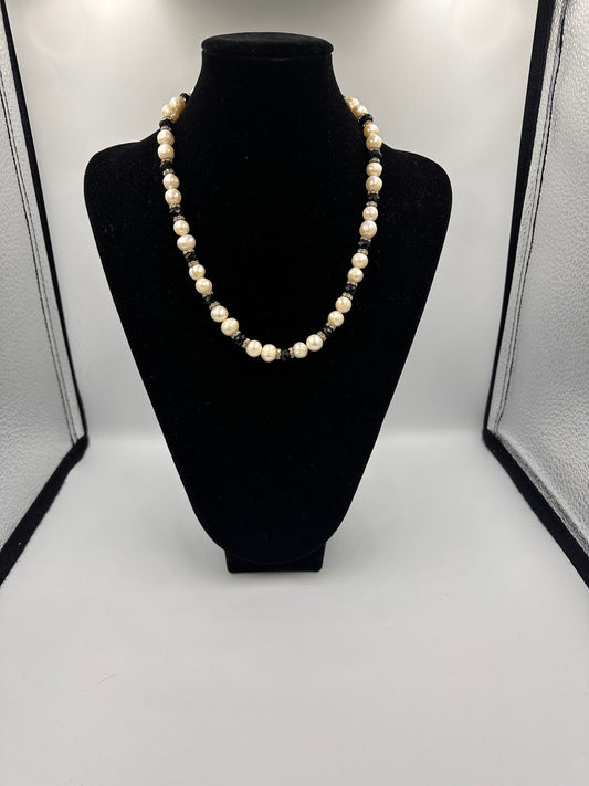 Echte Perlenkette mit Zirkoniasteinen und schwarzen glänzenden Edelsteinen