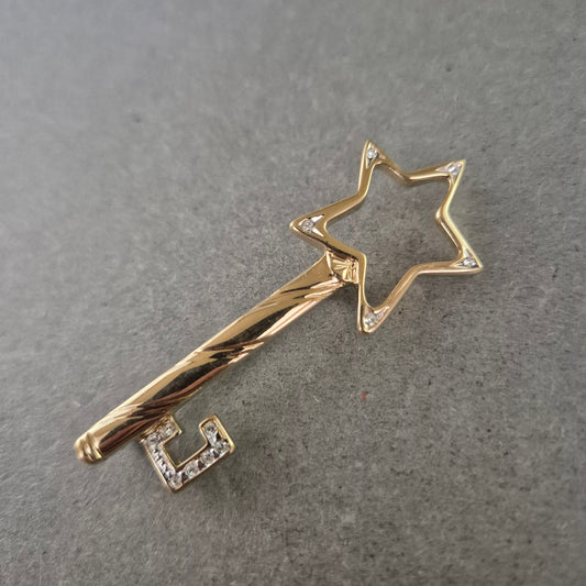 Verspielte Stern-Schlüssel-Brosche im Gold-Look mit Strass