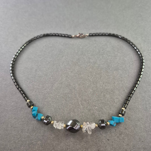 Schwarze Perlenkette mit bunten Schmucksteinen und Magnetoptik