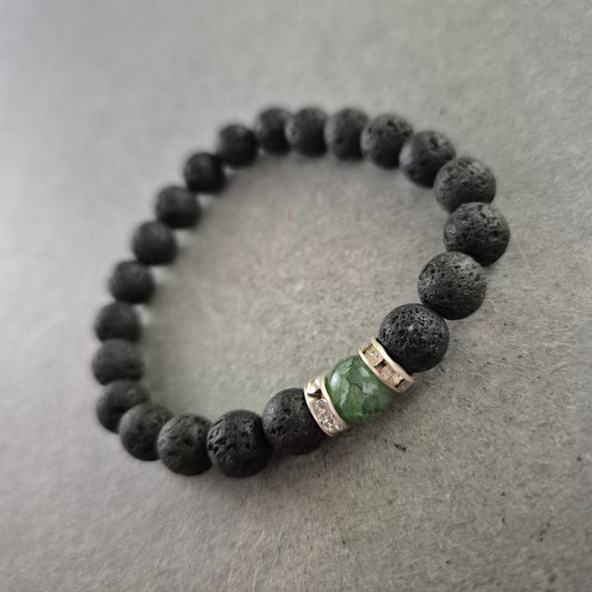 Elastisches Lavaperlen-Armband mit grünem Zierstein