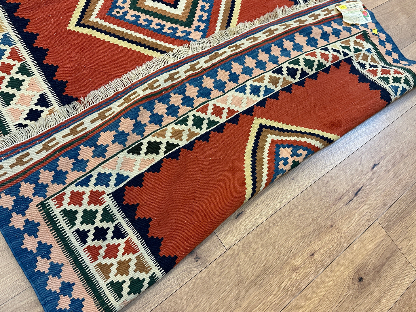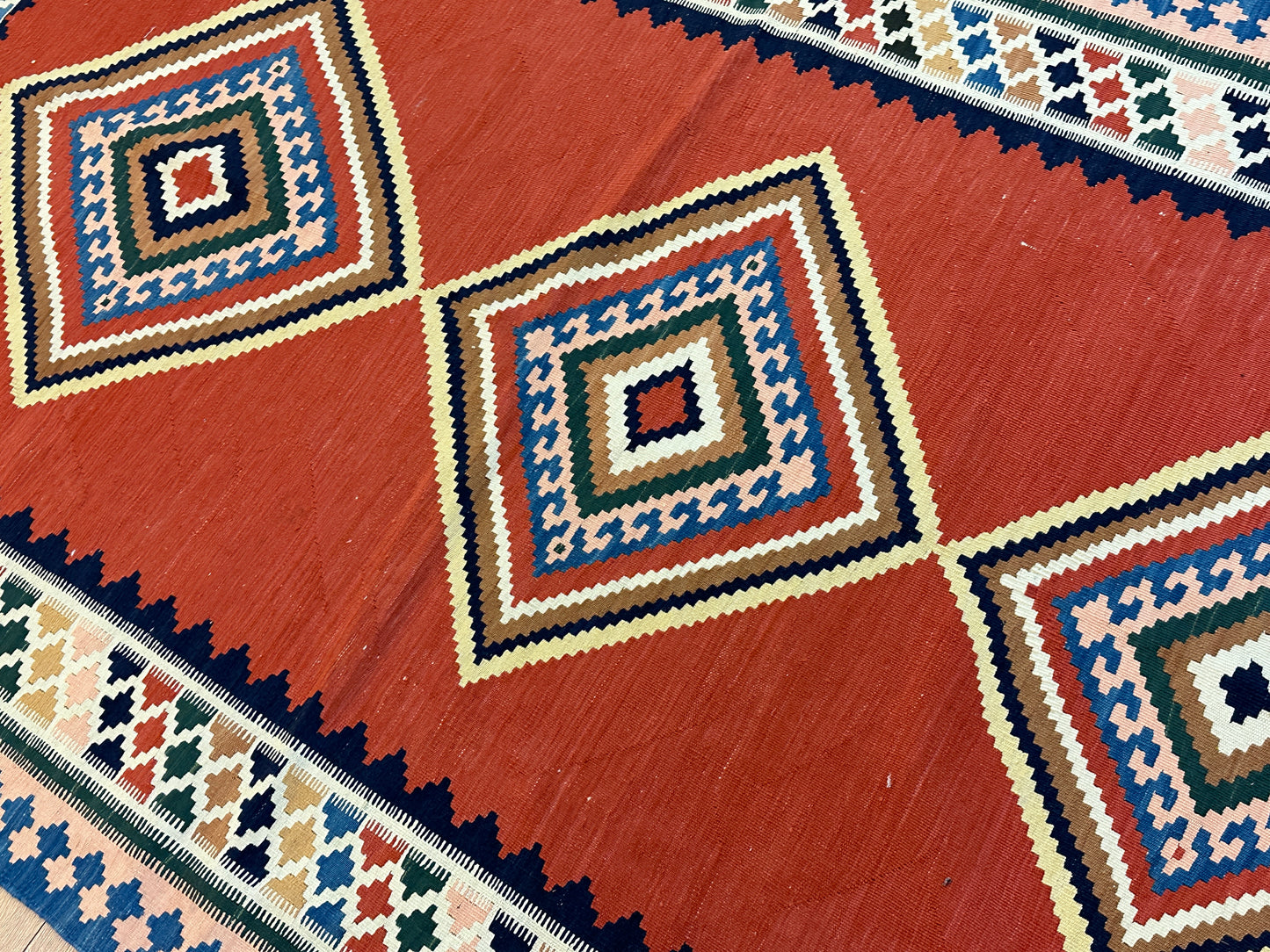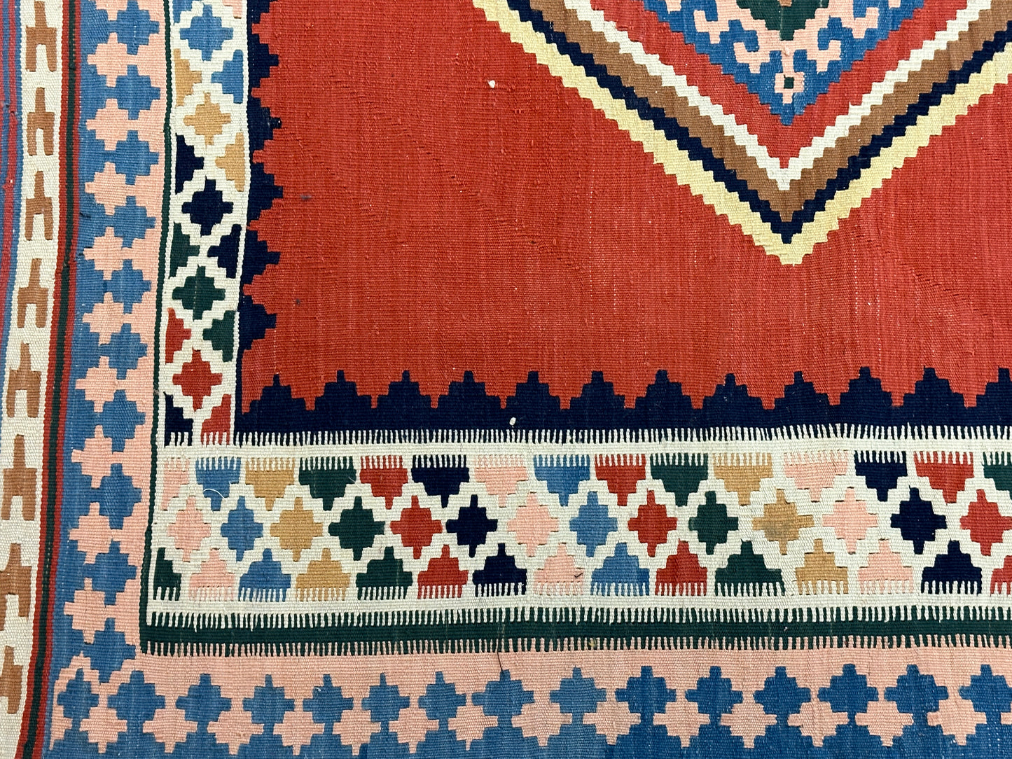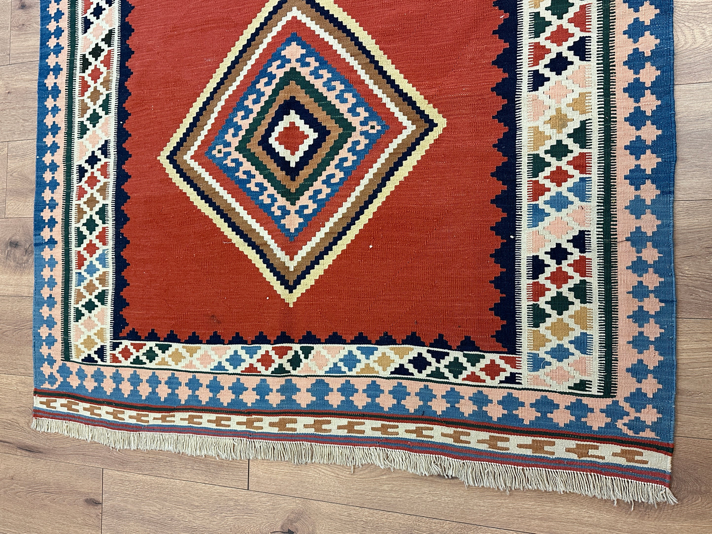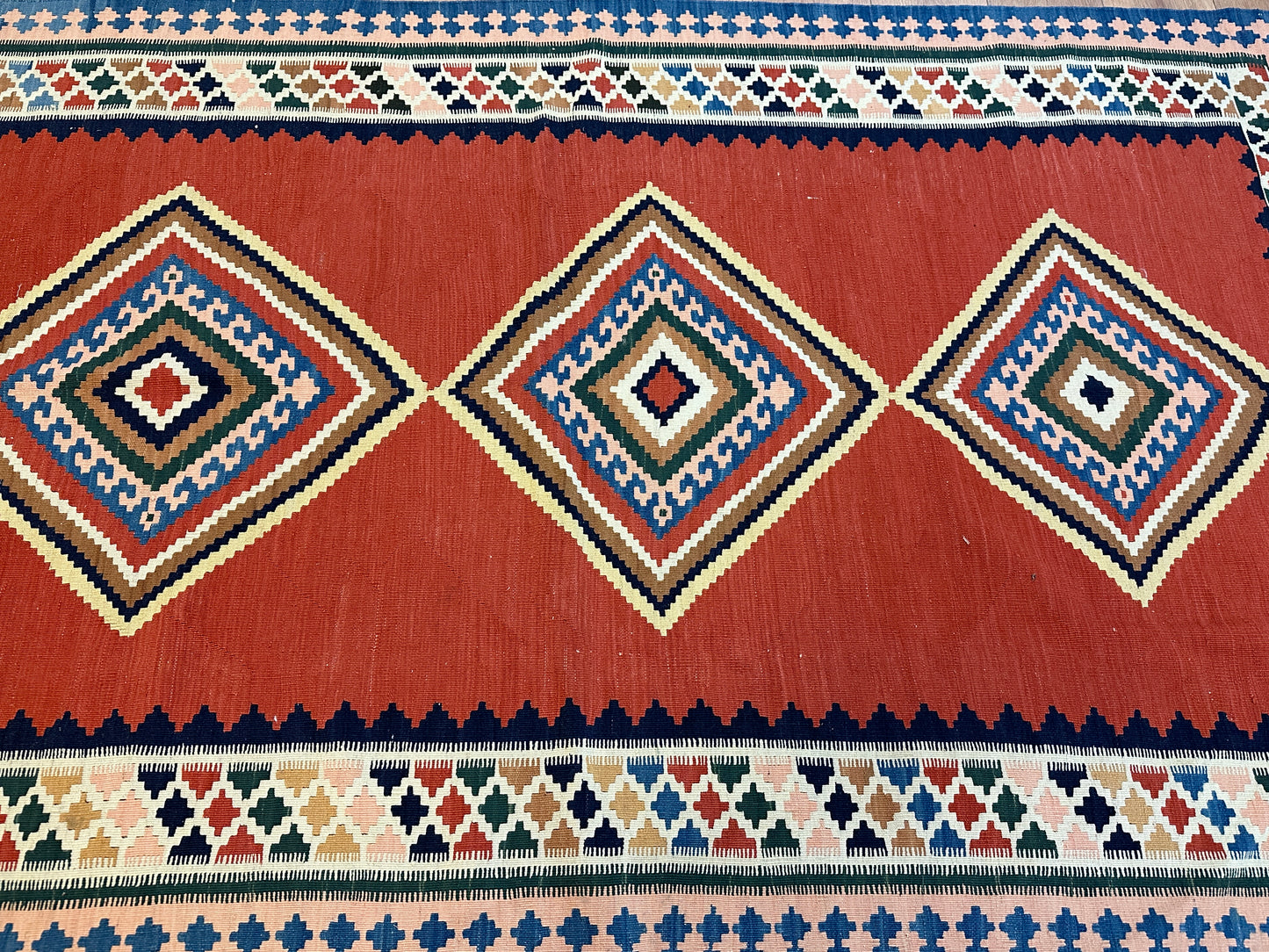 Dieser handgeknüpfte persische Kelim ist mehr als nur ein Teppich; er ist ein Ausdruck von Kultur, Geschichte und meisterhafter Handwerkskunst. Perfekt für Liebhaber von traditionellen Designs und als Blickfang in jedem Raum.