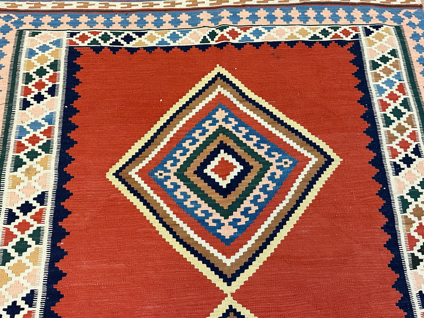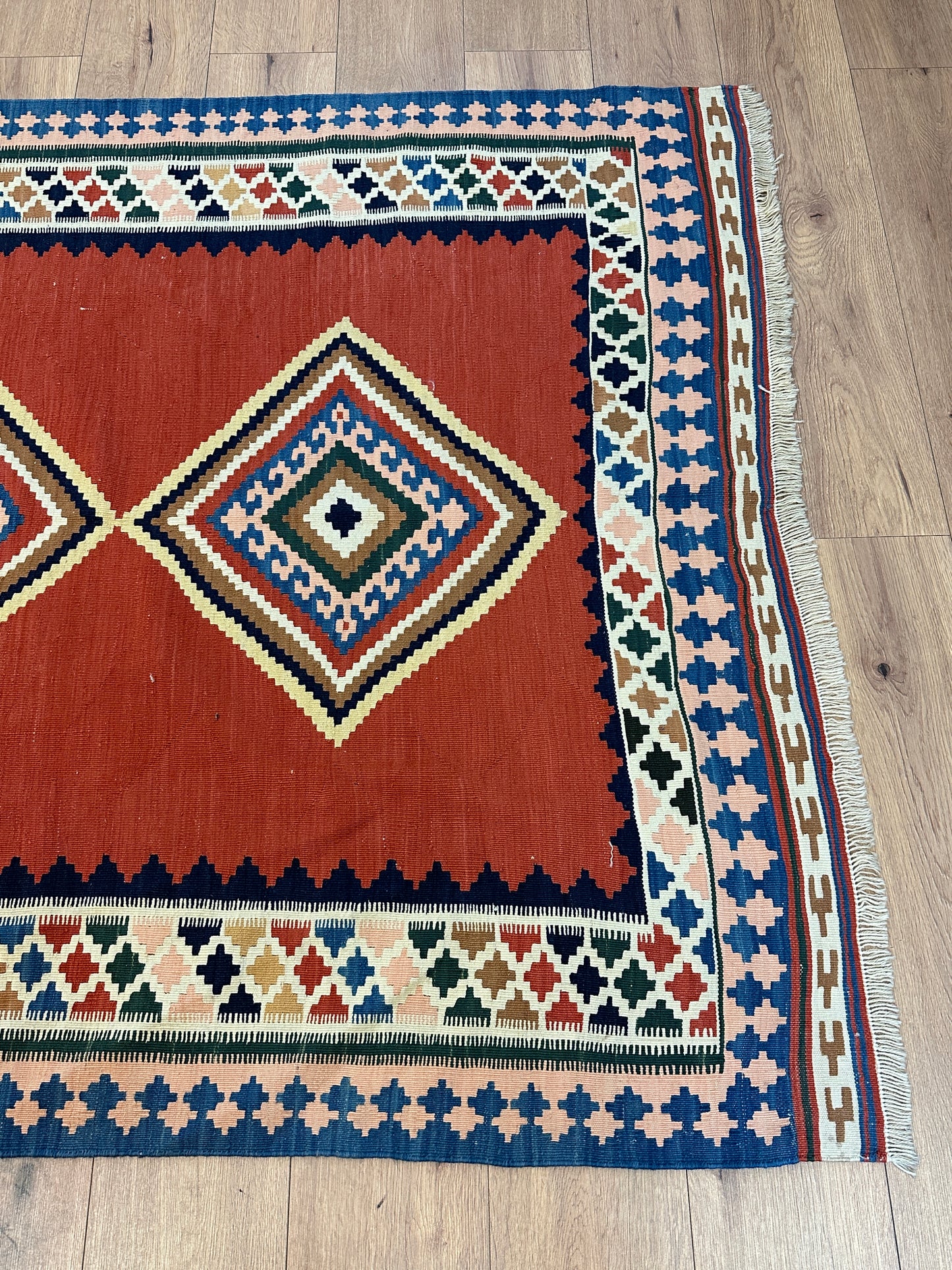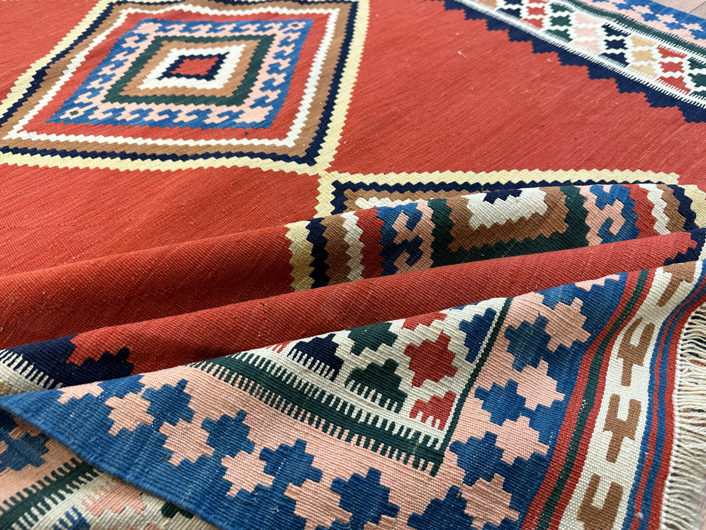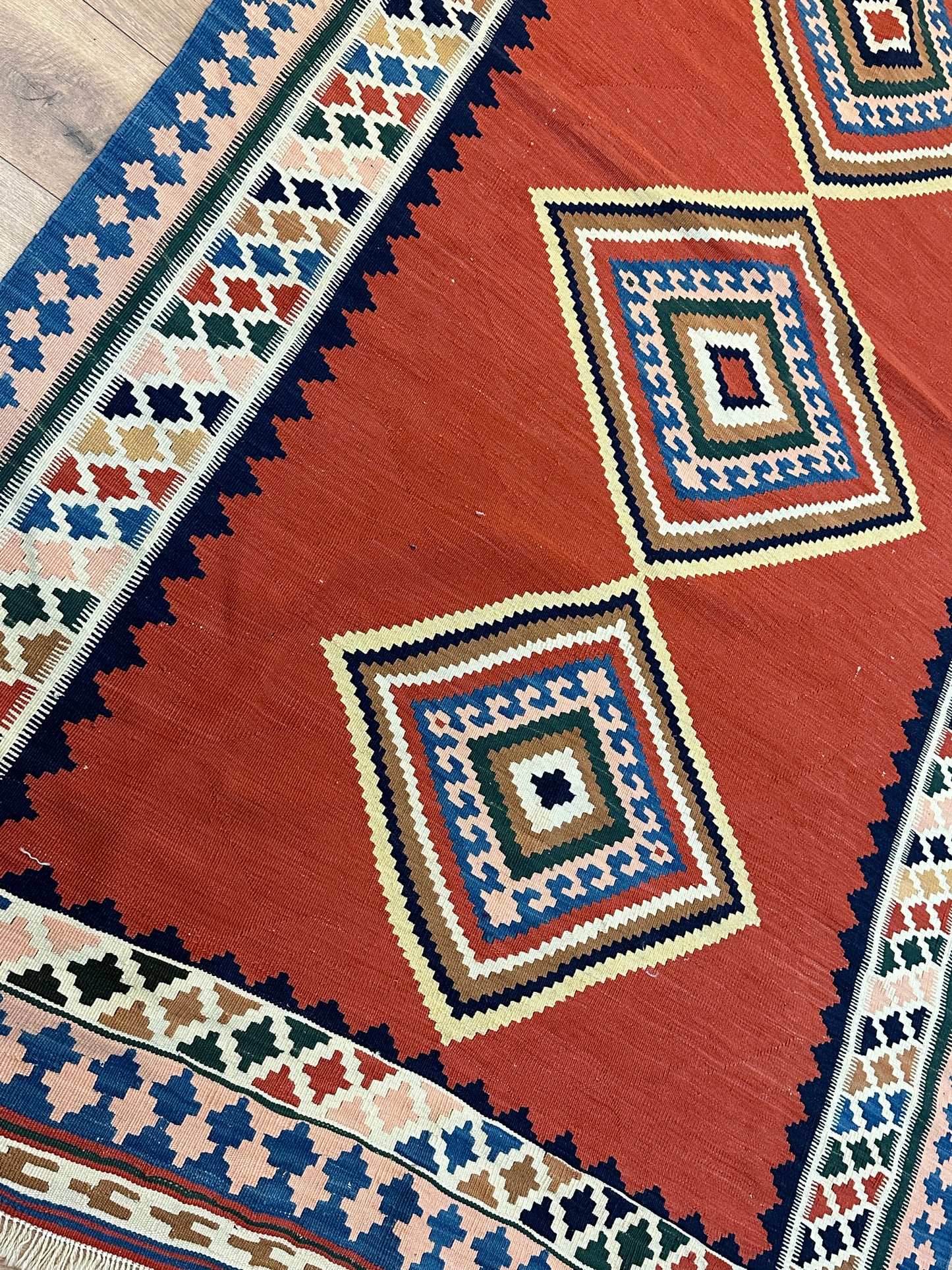 Dieser handgeknüpfte persische Kelim ist mehr als nur ein Teppich; er ist ein Ausdruck von Kultur, Geschichte und meisterhafter Handwerkskunst. Perfekt für Liebhaber von traditionellen Designs und als Blickfang in jedem Raum.