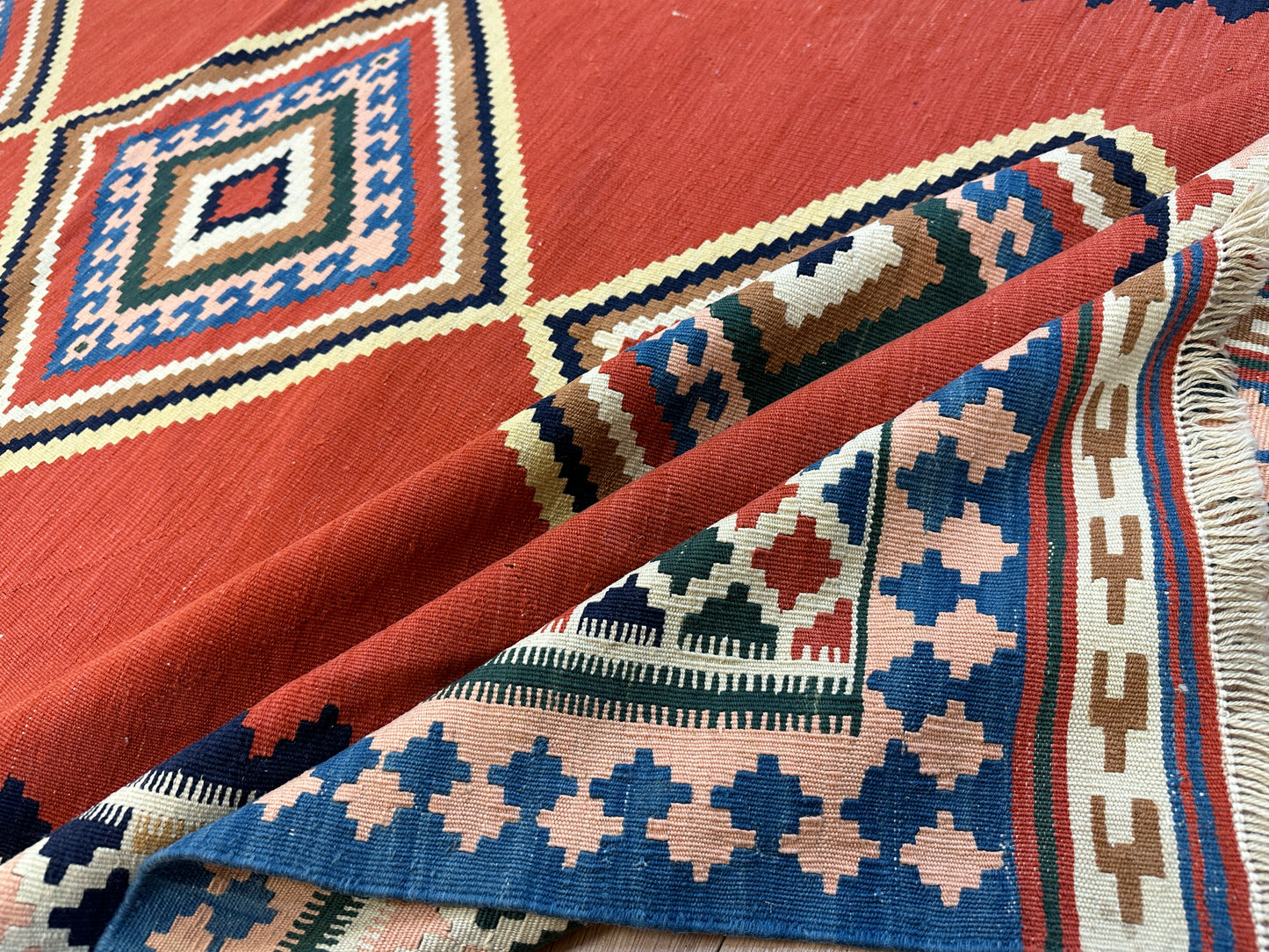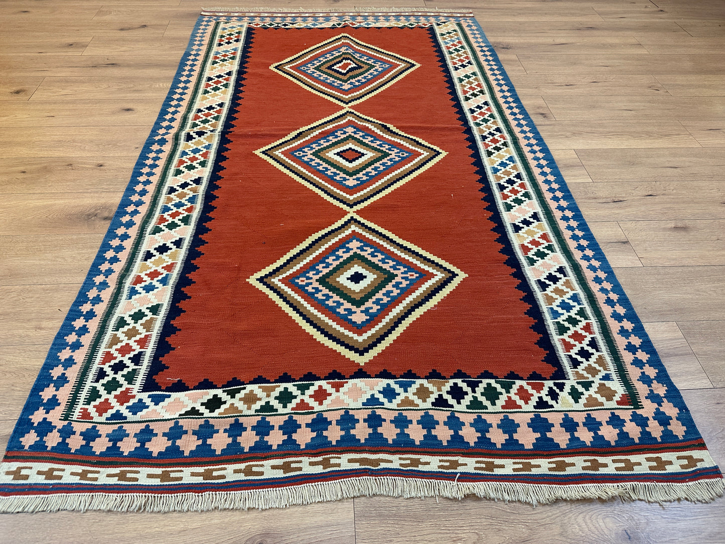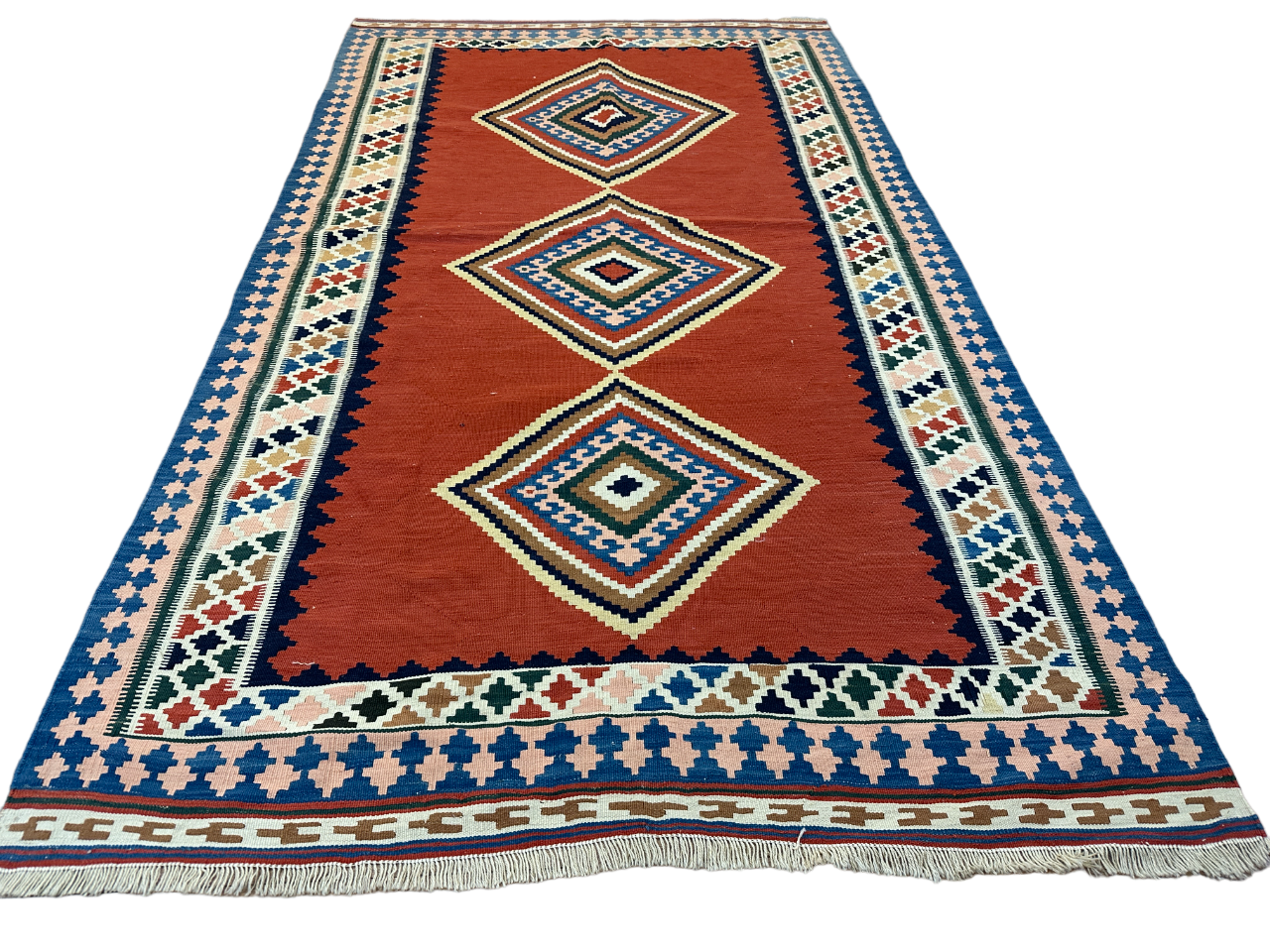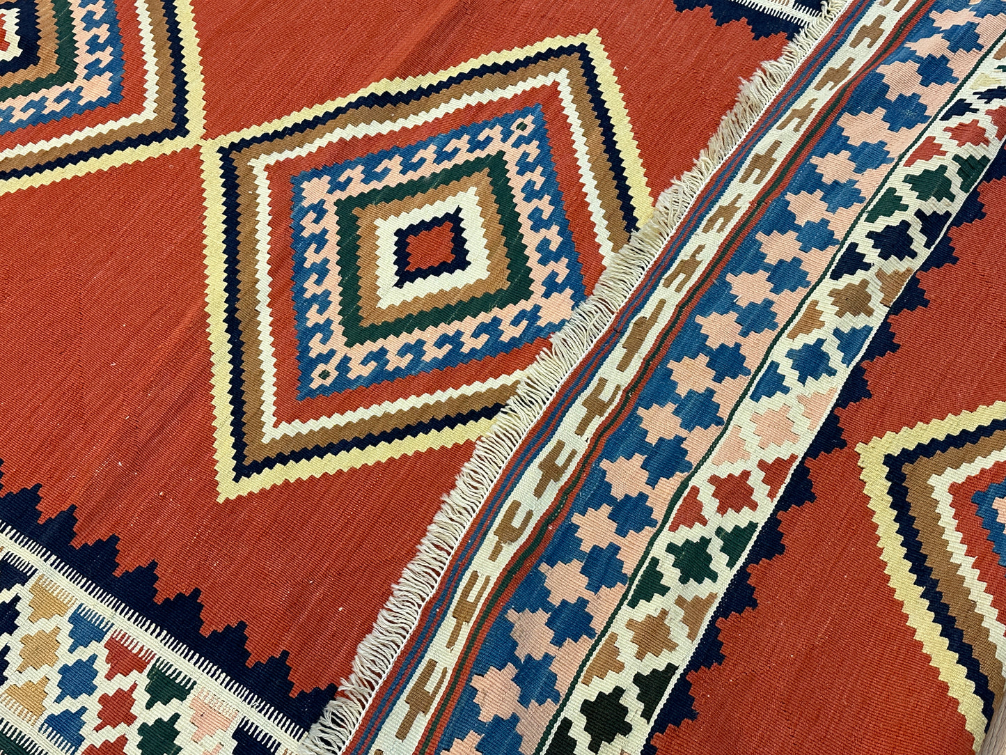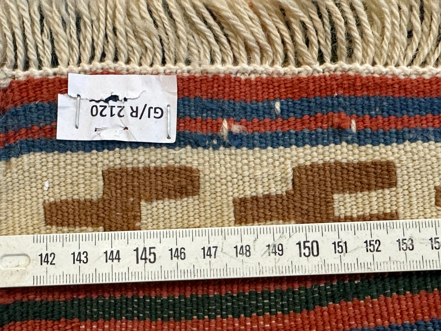 Dieser handgeknüpfte persische Kelim ist mehr als nur ein Teppich; er ist ein Ausdruck von Kultur, Geschichte und meisterhafter Handwerkskunst. Perfekt für Liebhaber von traditionellen Designs und als Blickfang in jedem Raum.