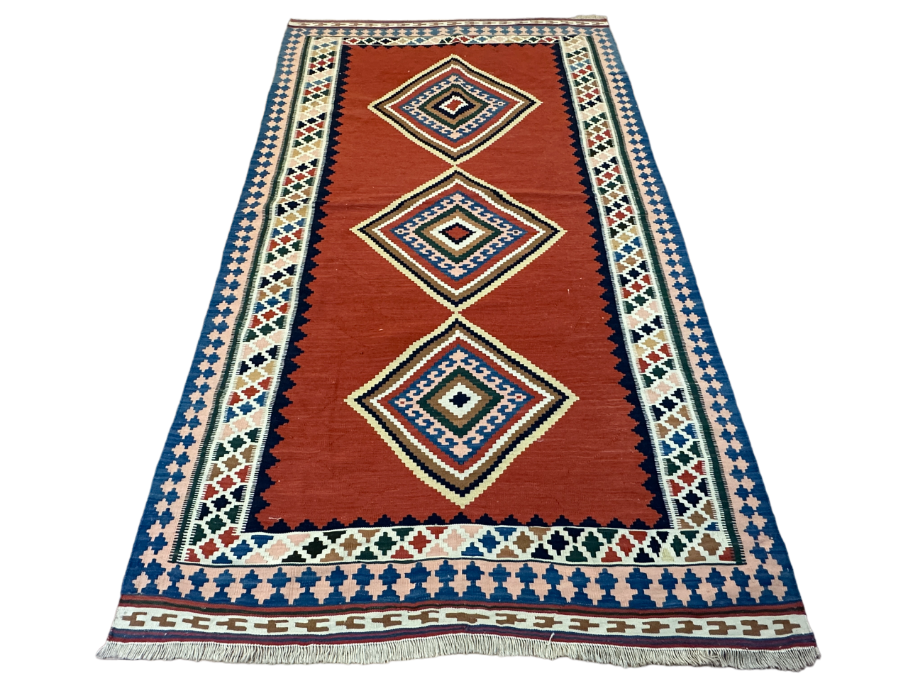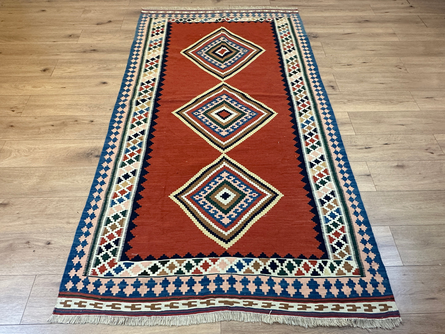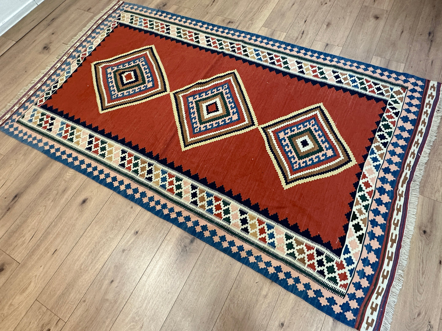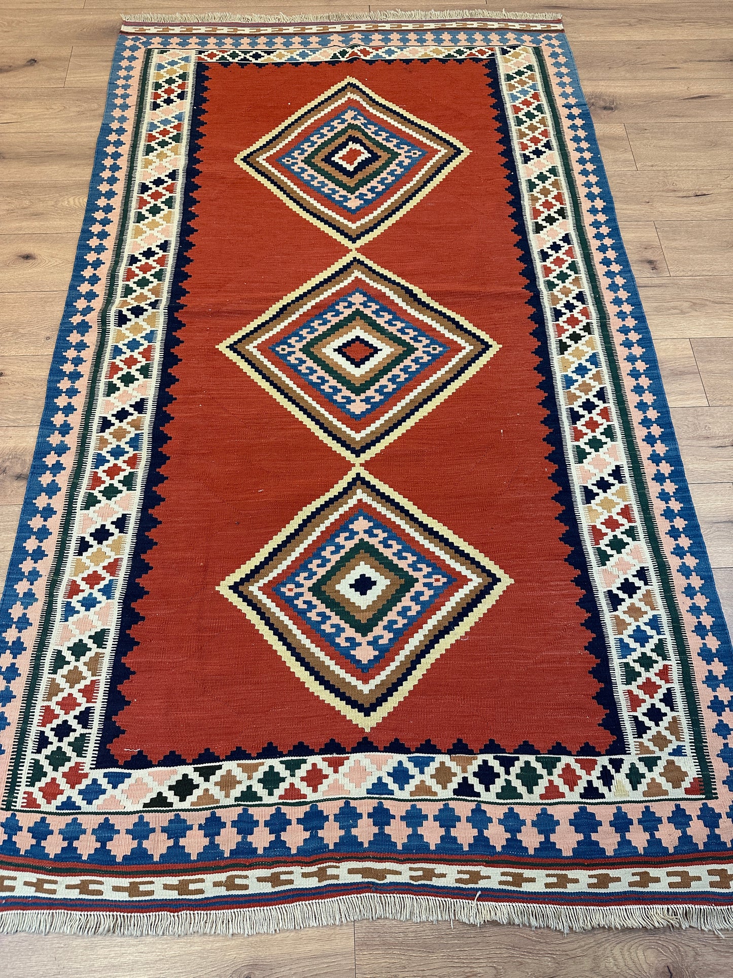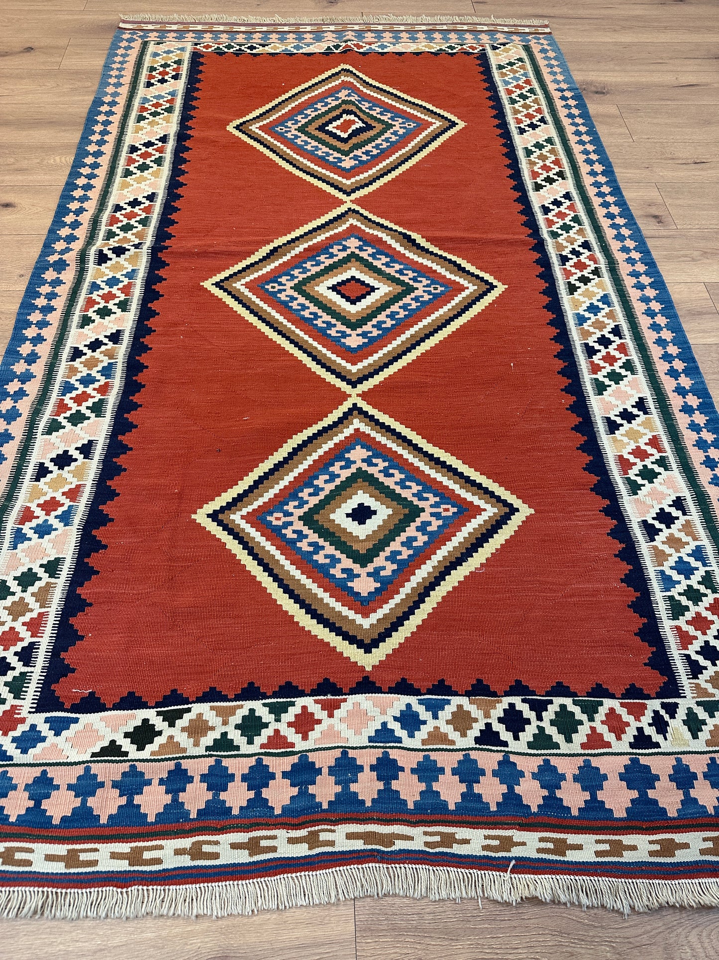 Dieser handgeknüpfte persische Kelim ist mehr als nur ein Teppich; er ist ein Ausdruck von Kultur, Geschichte und meisterhafter Handwerkskunst. Perfekt für Liebhaber von traditionellen Designs und als Blickfang in jedem Raum.