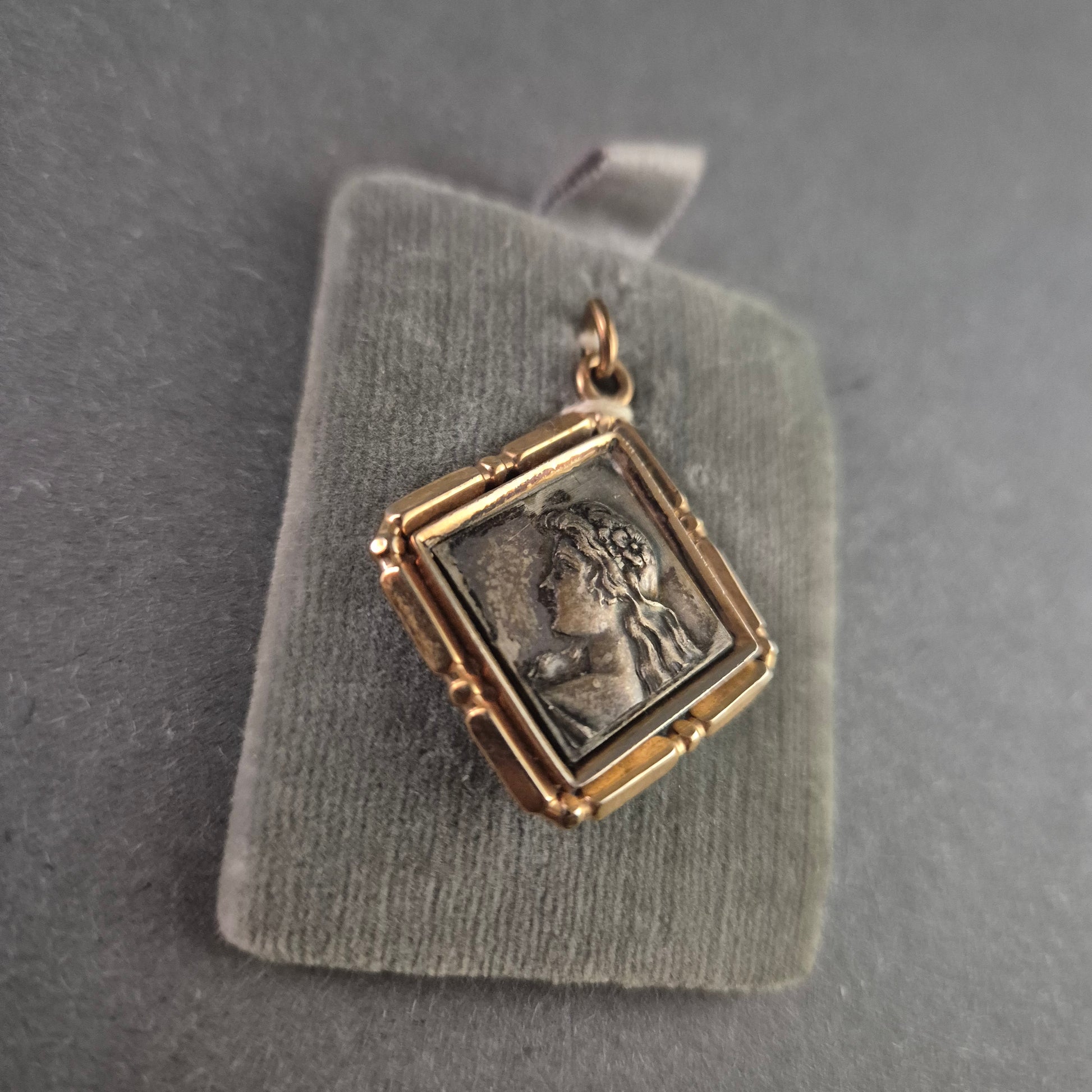 Dieser faszinierende antike Medaillon-Anhänger besticht durch sein kunstvolles Design. Das detaillierte Frauenprofil auf der oxidierten Silberfläche verleiht dem Schmuckstück einen historischen Charakter, während die verzierte goldfarbene Rahmung für eine elegante Kontrastwirkung sorgt. Ein zeitloses Sammlerstück, das Geschichte und Stil vereint – ideal für Liebhaber antiker Schmuckkunst.