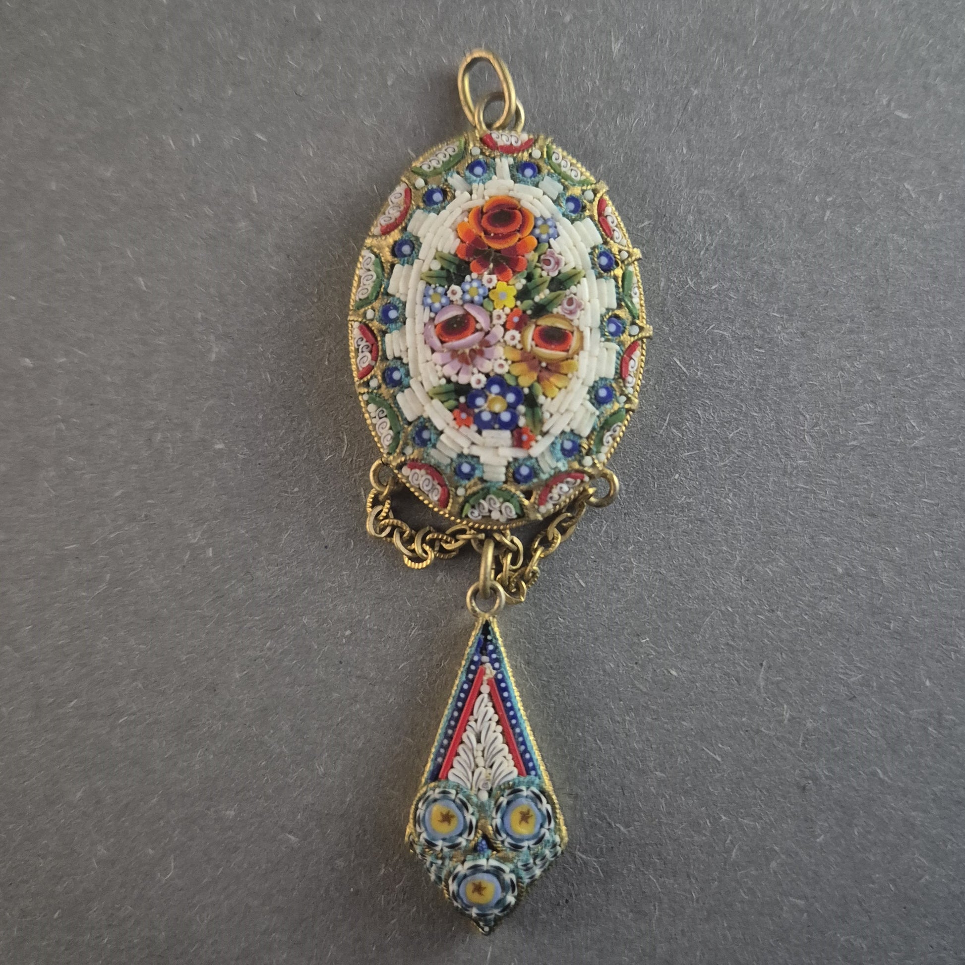 Dieser exquisite antike Mikromosaik-Anhänger fasziniert mit seinem kunstvollen floralen Design. Die feinen Glassteinchen wurden in aufwendiger Handarbeit zu einem detailreichen Blumenmotiv zusammengesetzt. Der Anhänger besticht durch seine ovale Form und eine goldfarbene Metallfassung, die mit einer beweglichen, tropfenförmigen Verzierung ergänzt wird. Ein außergewöhnliches Schmuckstück mit historischem Charme, das Sammler und Liebhaber antiker Accessoires begeistert.