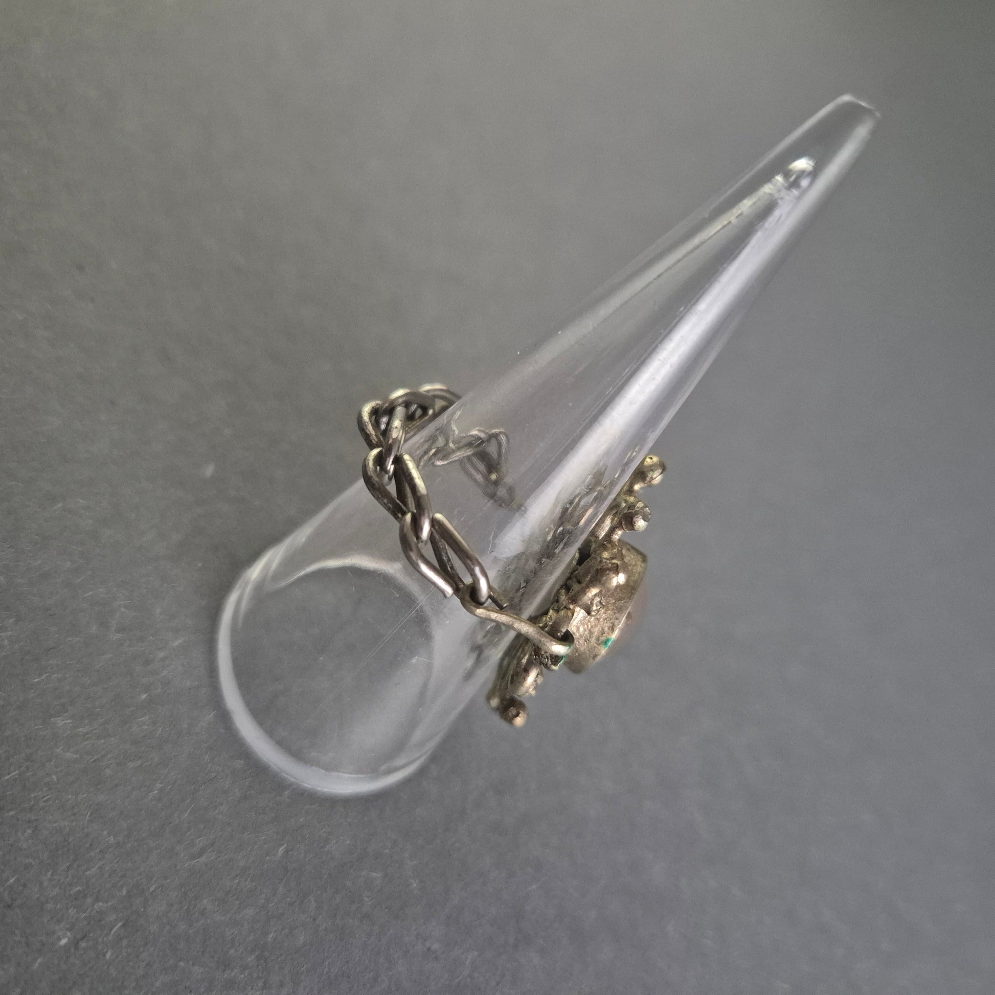 Dieser einzigartige antike Ring besticht durch sein kunstvolles Design mit filigranen floralen Elementen und einem zentralen Steinbesatz. Die feinen Details und die leichte Patina verleihen ihm einen charmanten Vintage-Look. Die Gliederstruktur des Rings sorgt für ein angenehmes Tragegefühl und macht ihn zu einem besonderen Schmuckstück für Liebhaber historischer Accessoires.