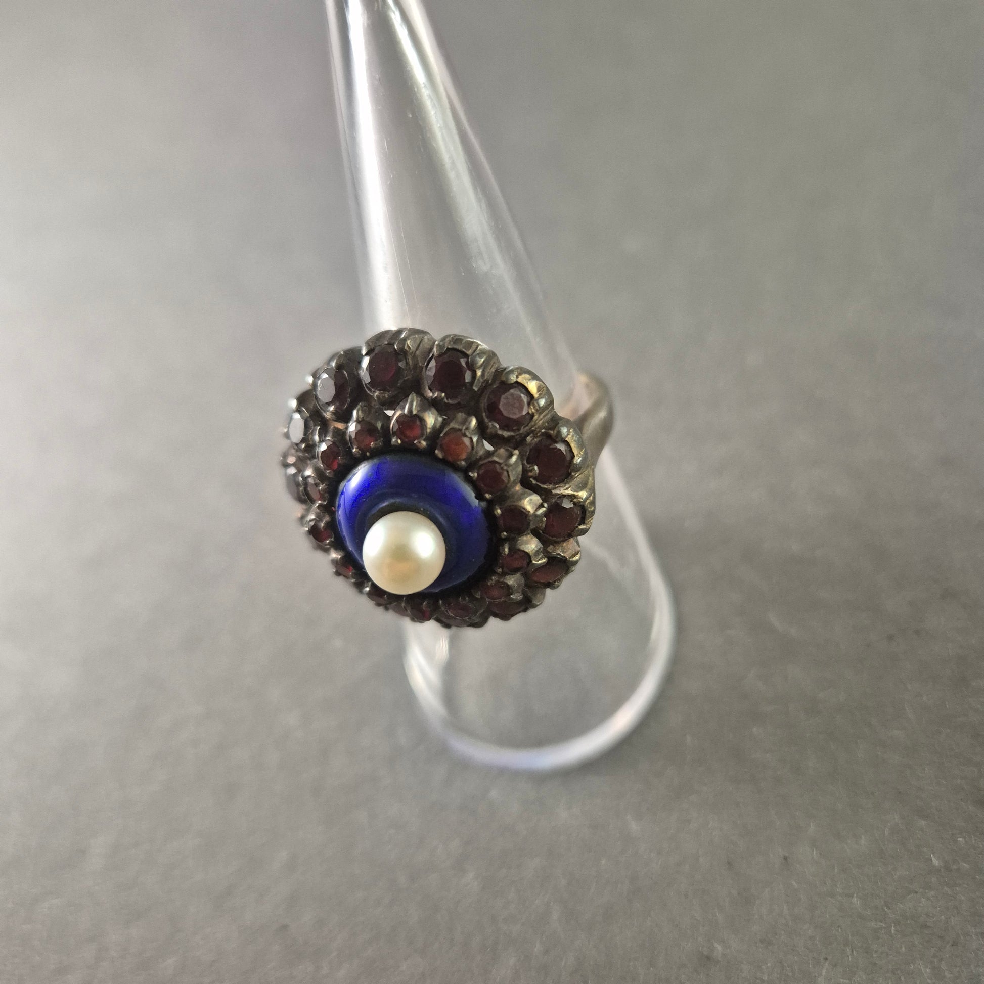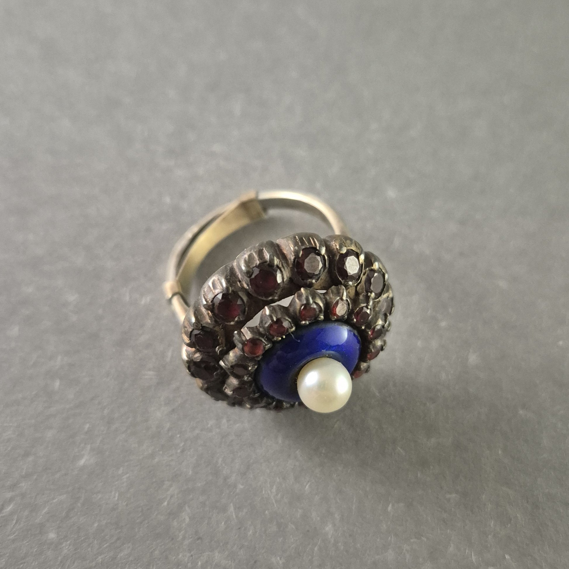 Antiker Silberring mit Granat, Lapislazuli & Perle – Exquisite Handwerkskunst