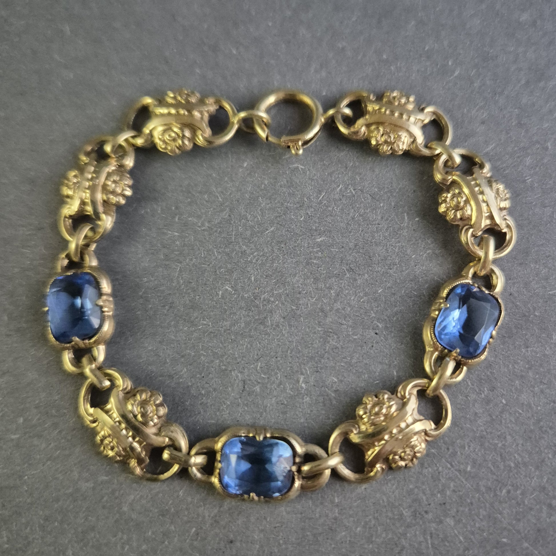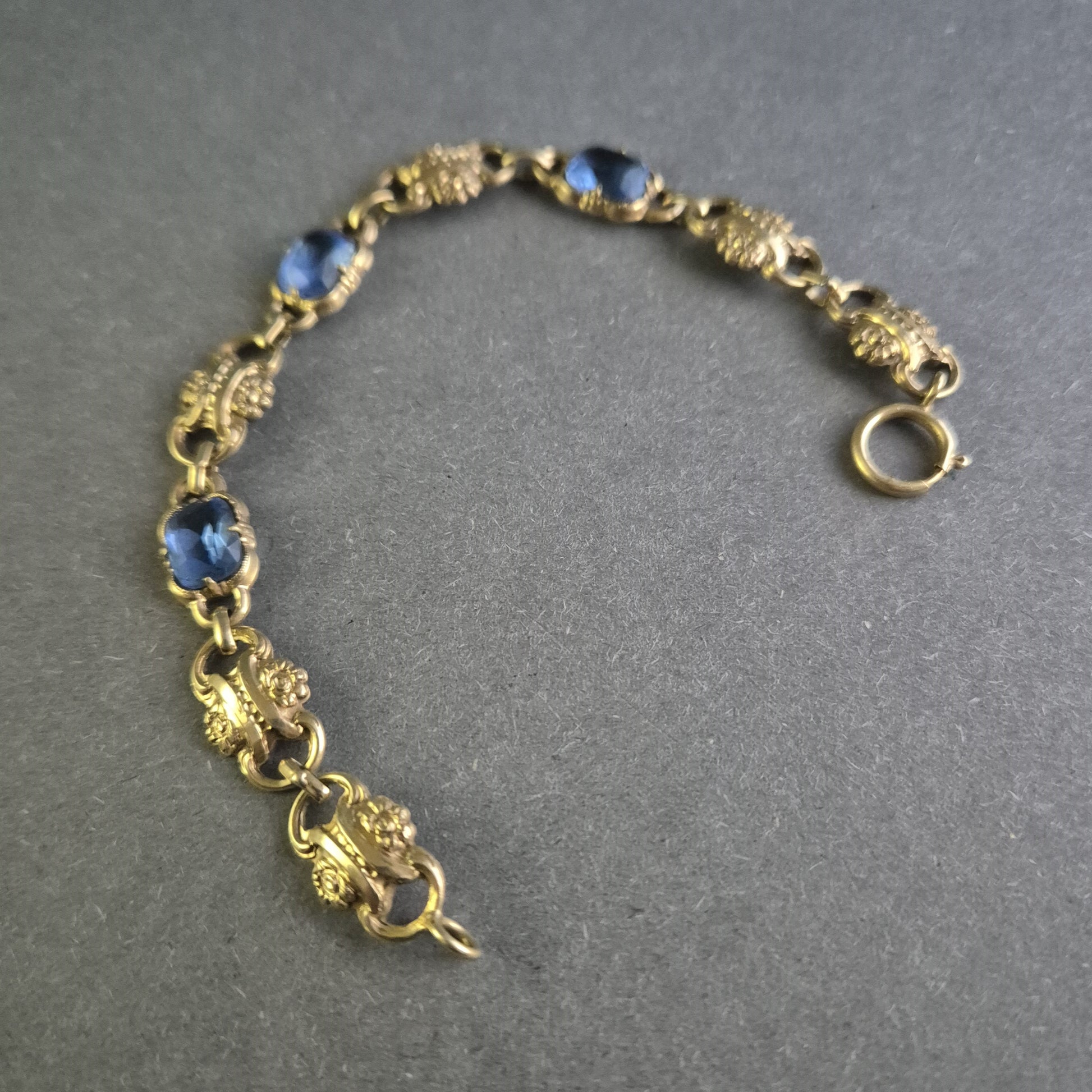 Dieses wunderschöne antike Armband besticht durch seine detailreiche Verarbeitung und die tiefblauen, facettierten Schmucksteine. Die vergoldeten Glieder sind kunstvoll mit floralen Ornamenten verziert und verleihen dem Schmuckstück einen eleganten Vintage-Charme. Ein einzigartiges Accessoire für Liebhaber antiker Schmuckkunst.