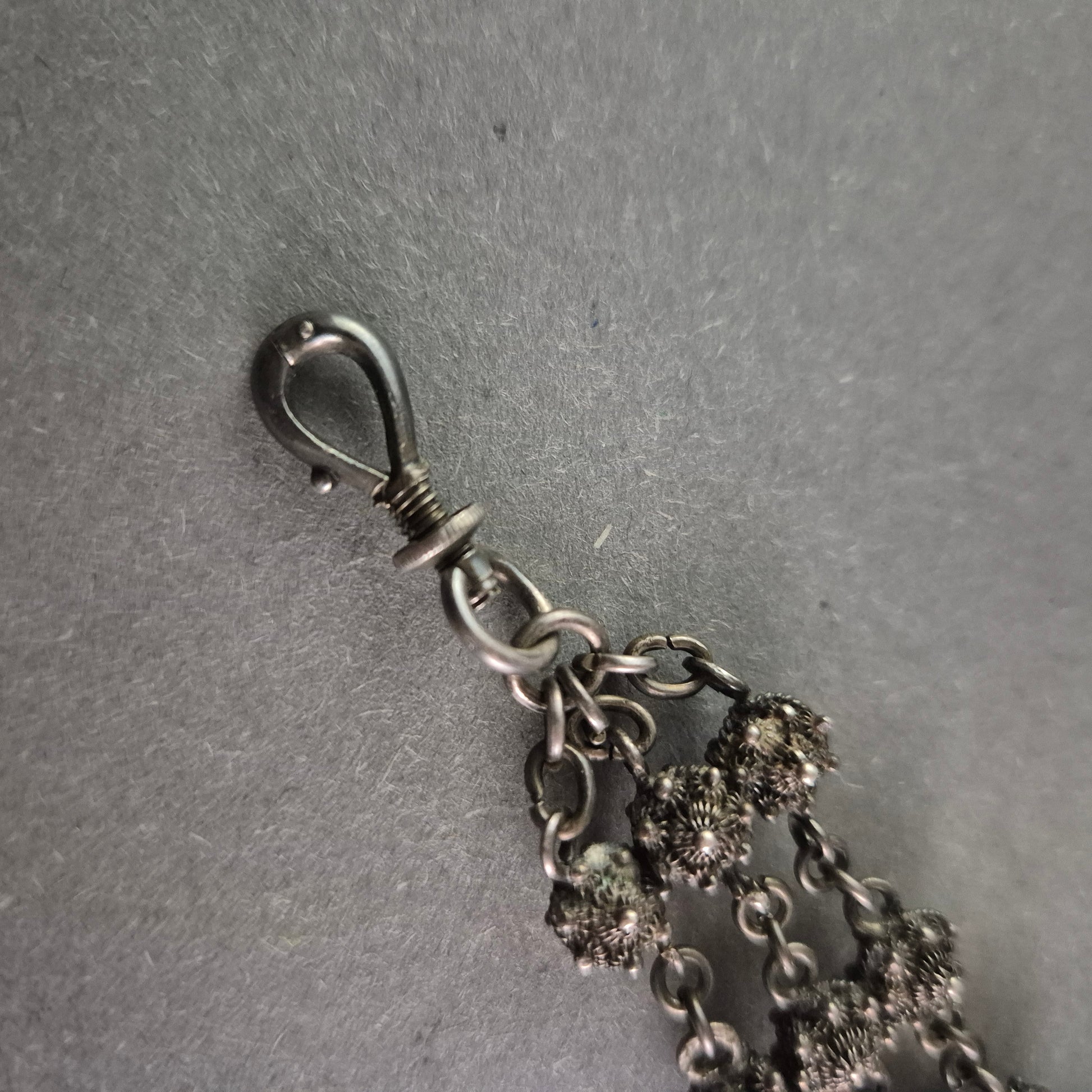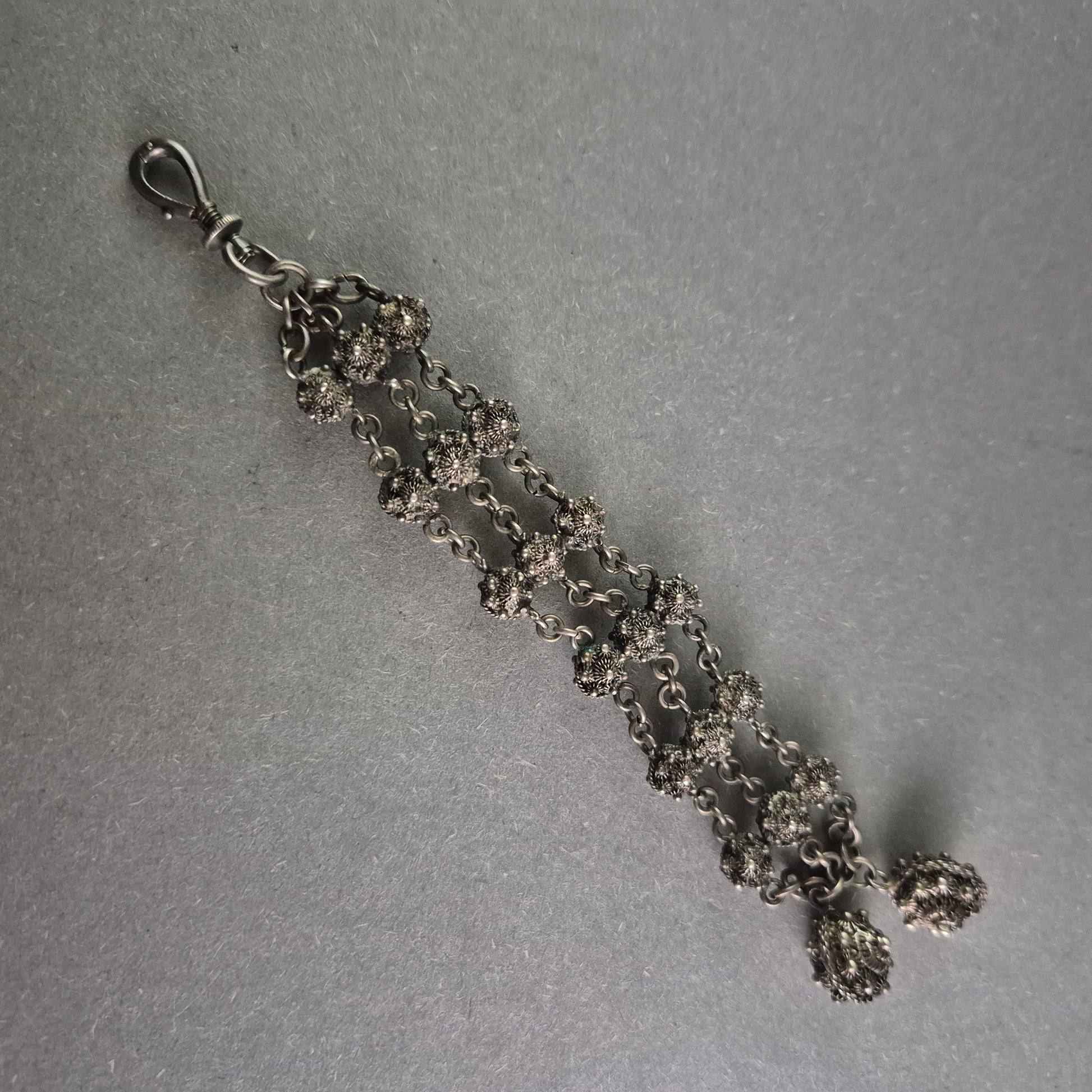 Dieses exquisite antike Silberarmband besticht durch seine filigranen Kugeldetails und das elegante Kettendesign. Die aufwendig gearbeiteten Silberkugeln verleihen dem Schmuckstück eine einzigartige Textur und nostalgische Ausstrahlung. Ein stilvolles Accessoire für Liebhaber von Vintage-Schmuck und zeitloser Eleganz.