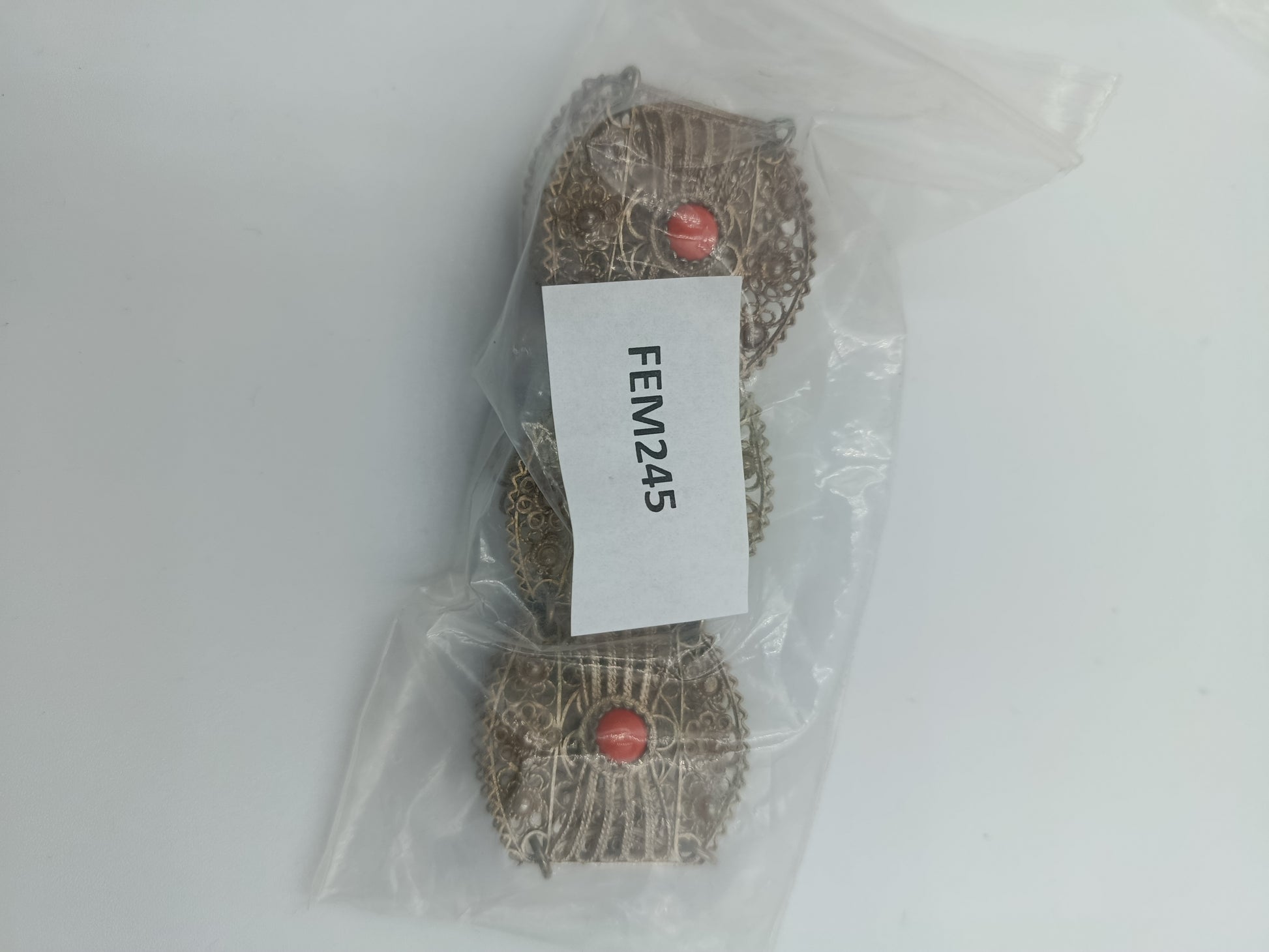 Wunderschönes, handgearbeitetes Silberarmband in feiner Filigrantechnik. Die zarten, ornamental verzierten Glieder sind mit leuchtend roten Korallenkabochons besetzt, die dem Schmuckstück einen edlen Farbakzent geben. Ein echtes Sammlerstück, das traditionelle Handwerkskunst zeigt.