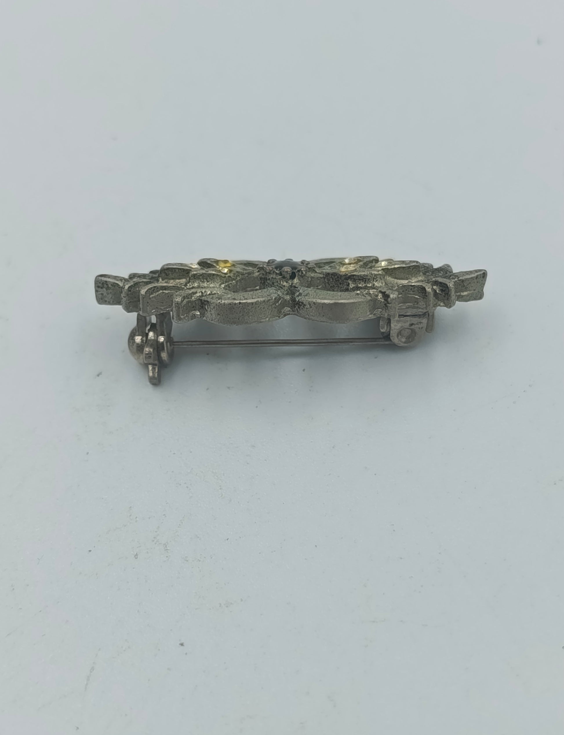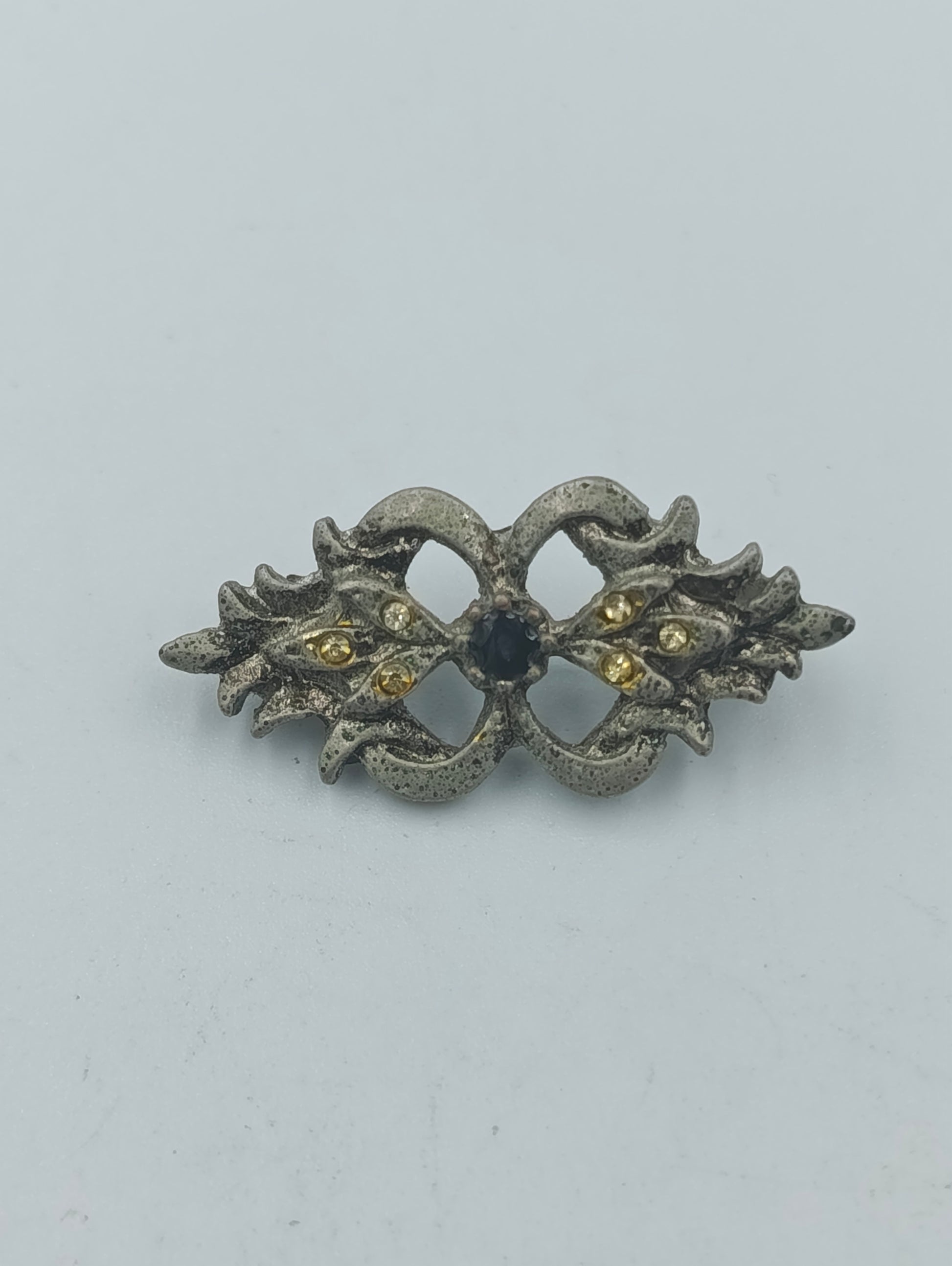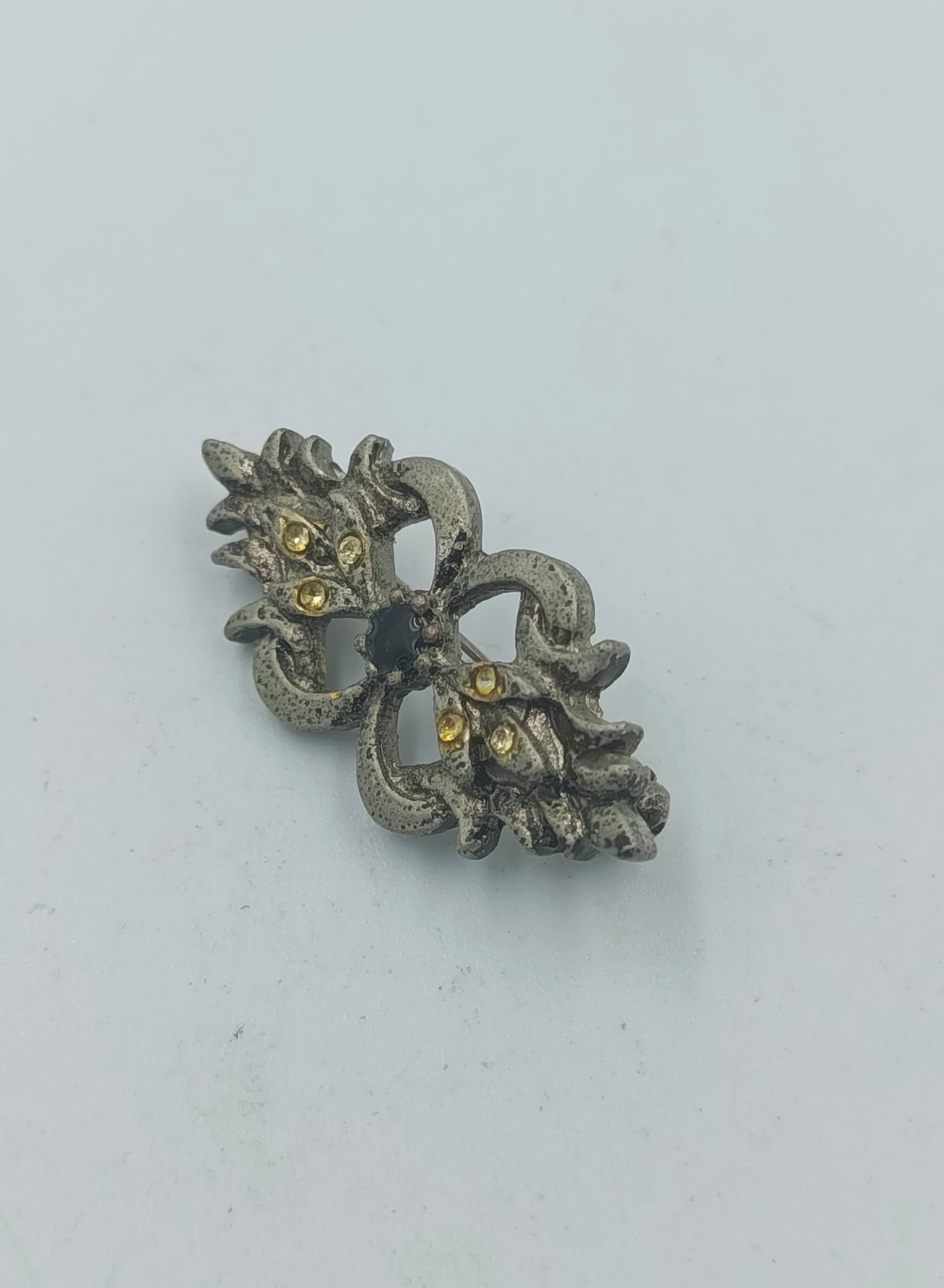 Elegante Vintage-Brosche im antiken Stil mit aufwendig gearbeiteter, ornamentaler Form. In der Mitte sitzt ein dunkler Strassstein, umgeben von kleinen gelben Glitzersteinen, die der Brosche einen dezenten, warmen Glanz verleihen. Ein stilvolles Accessoire für Blusen, Schals oder Jacken.