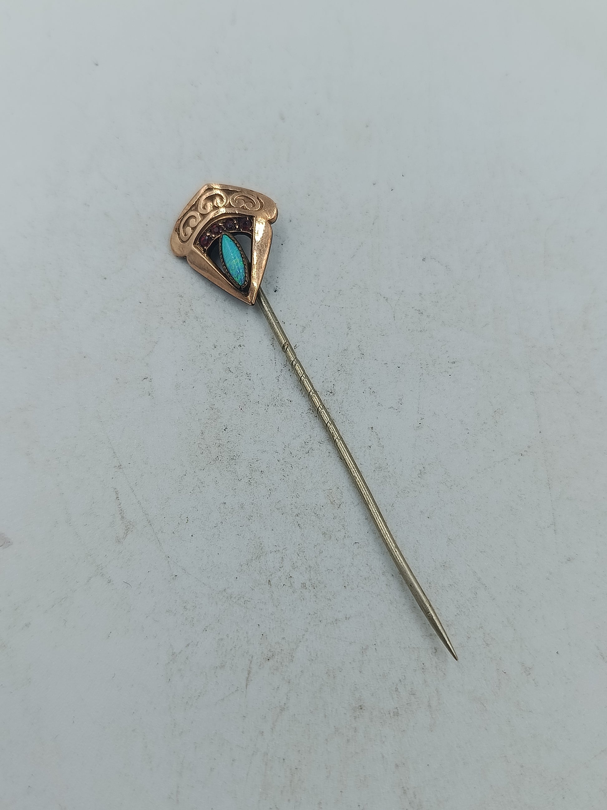 Art déco Nadel mit schimmerndem Opal und roten Akzenten