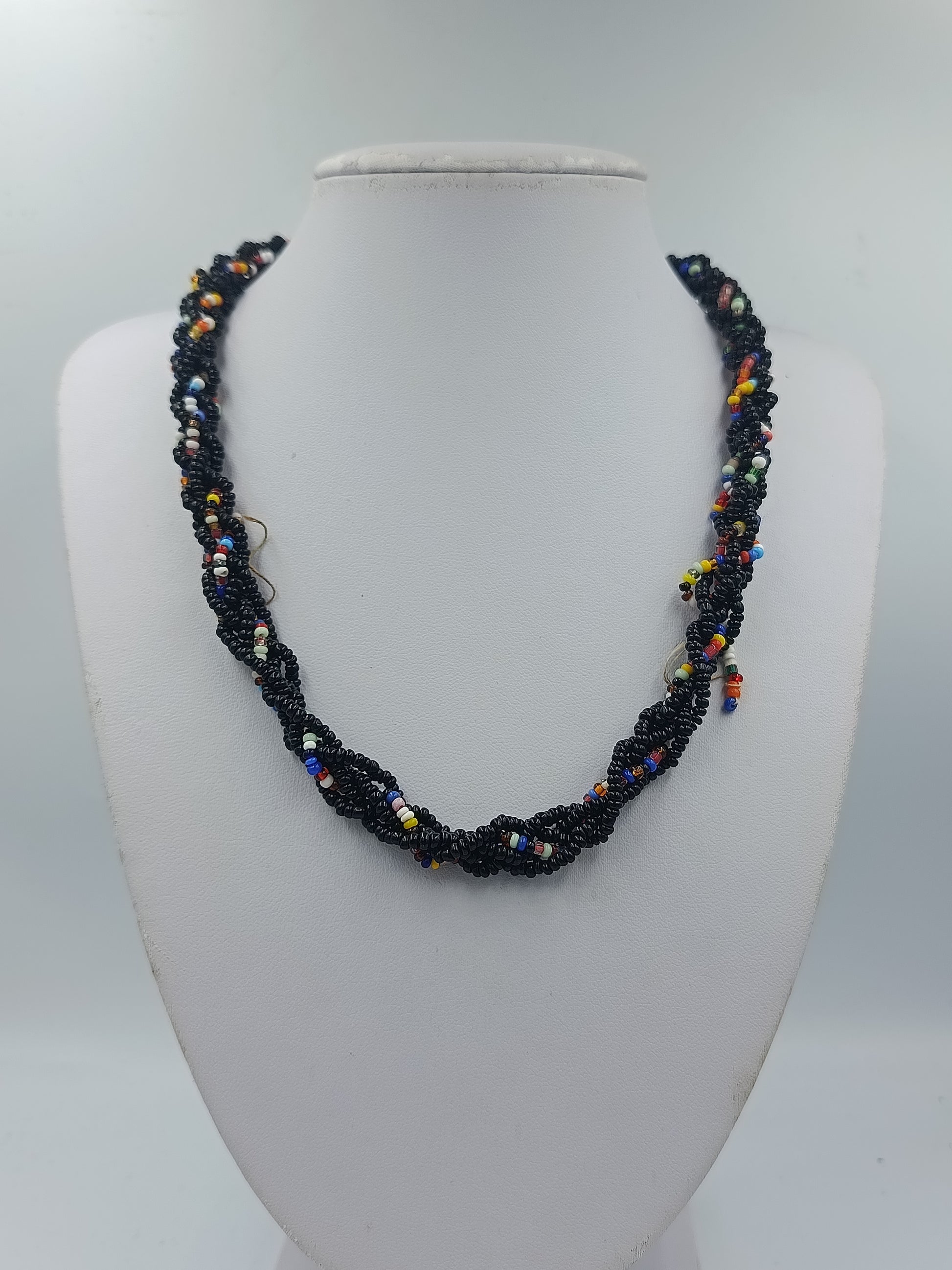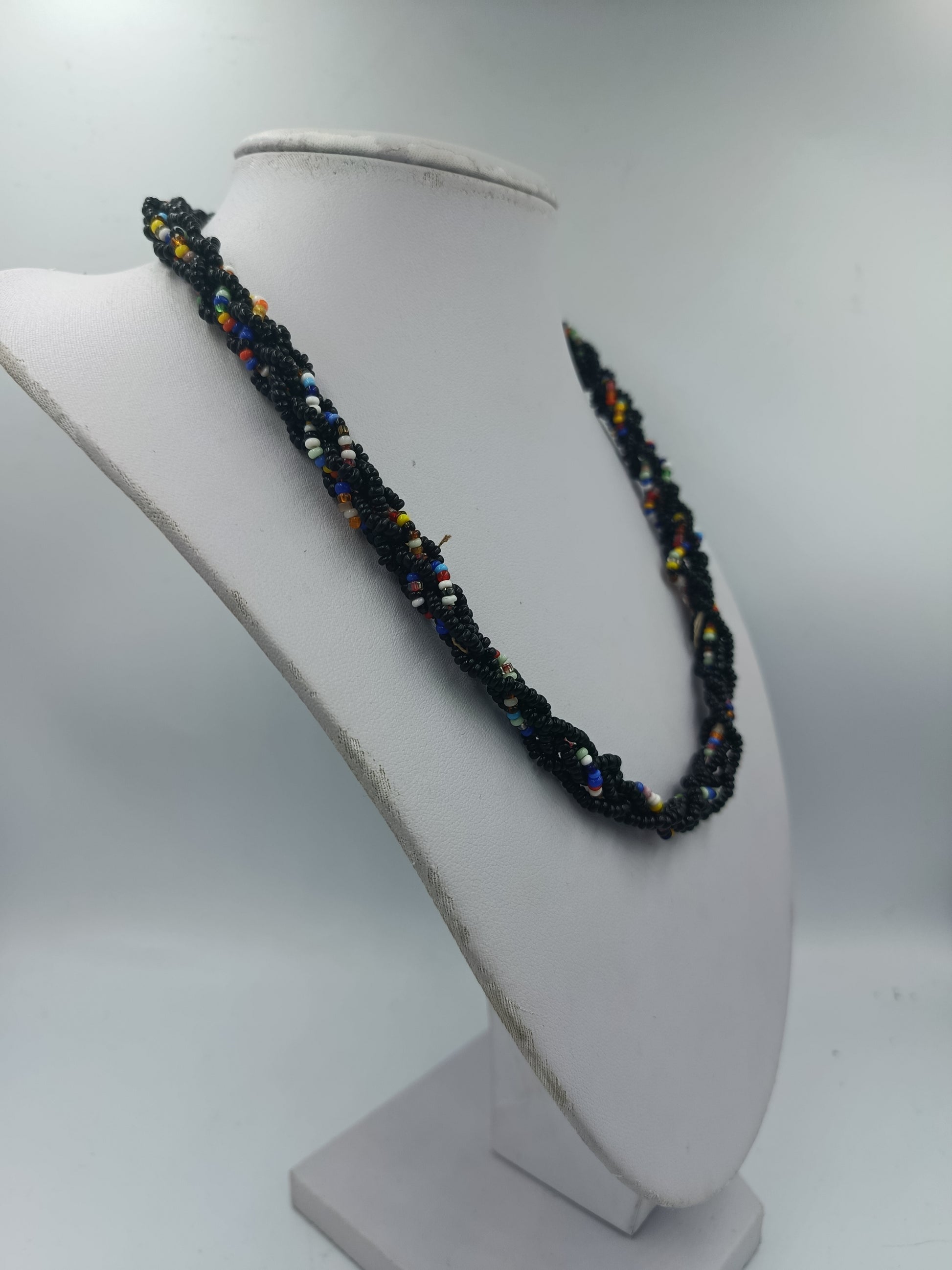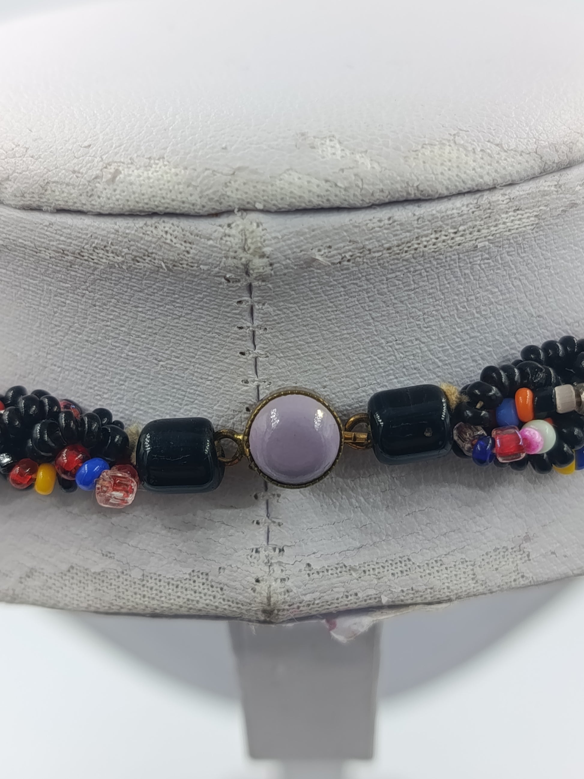 Bunte Glasperlenkette mit schwarzer Grundfarbe und dekorativem Mittelstein