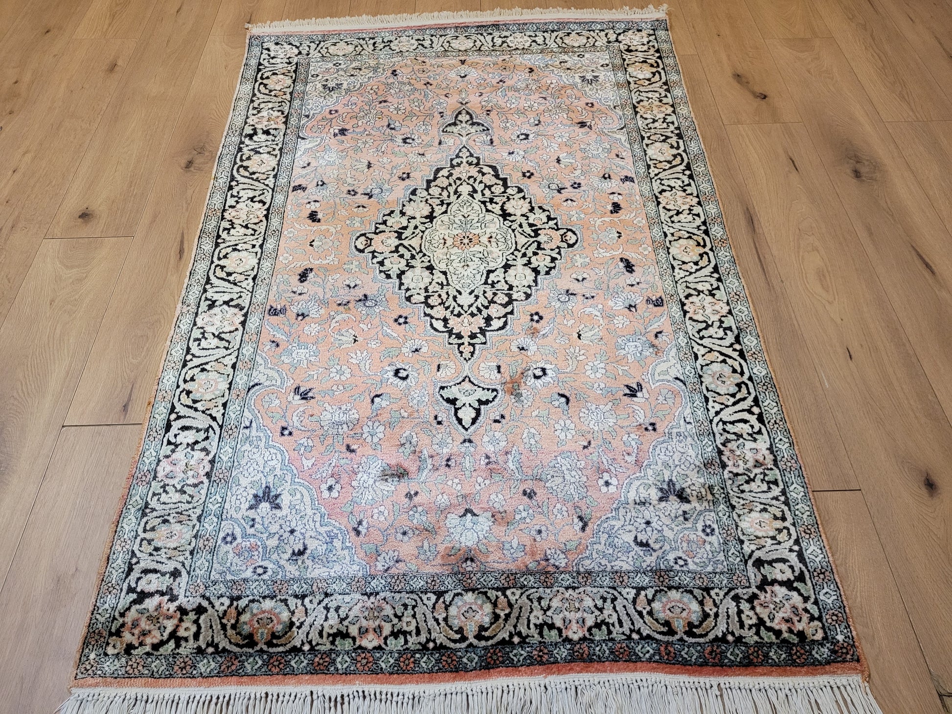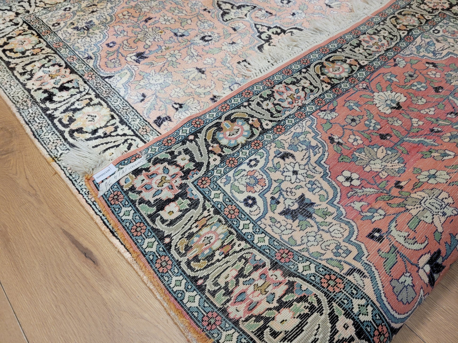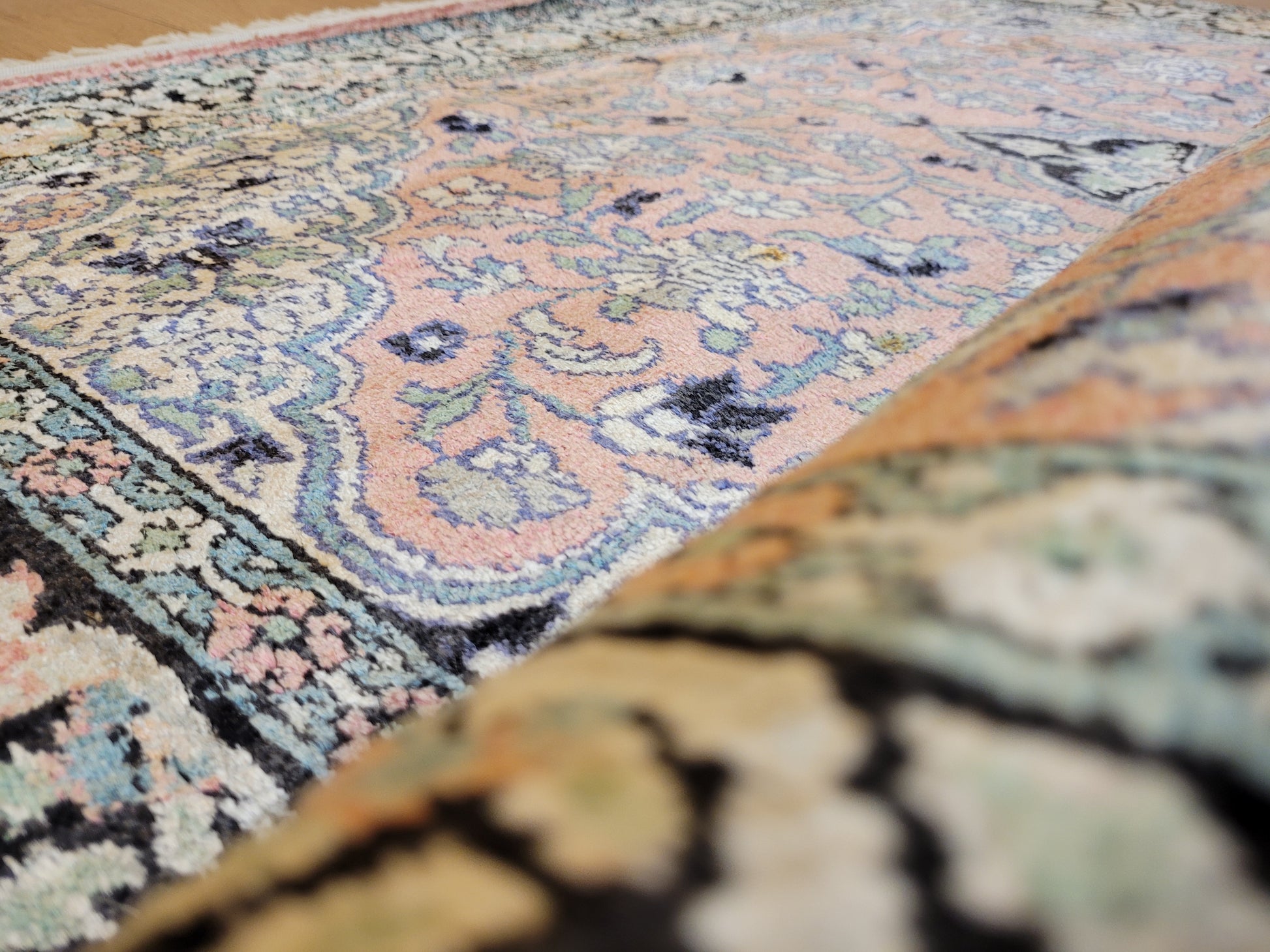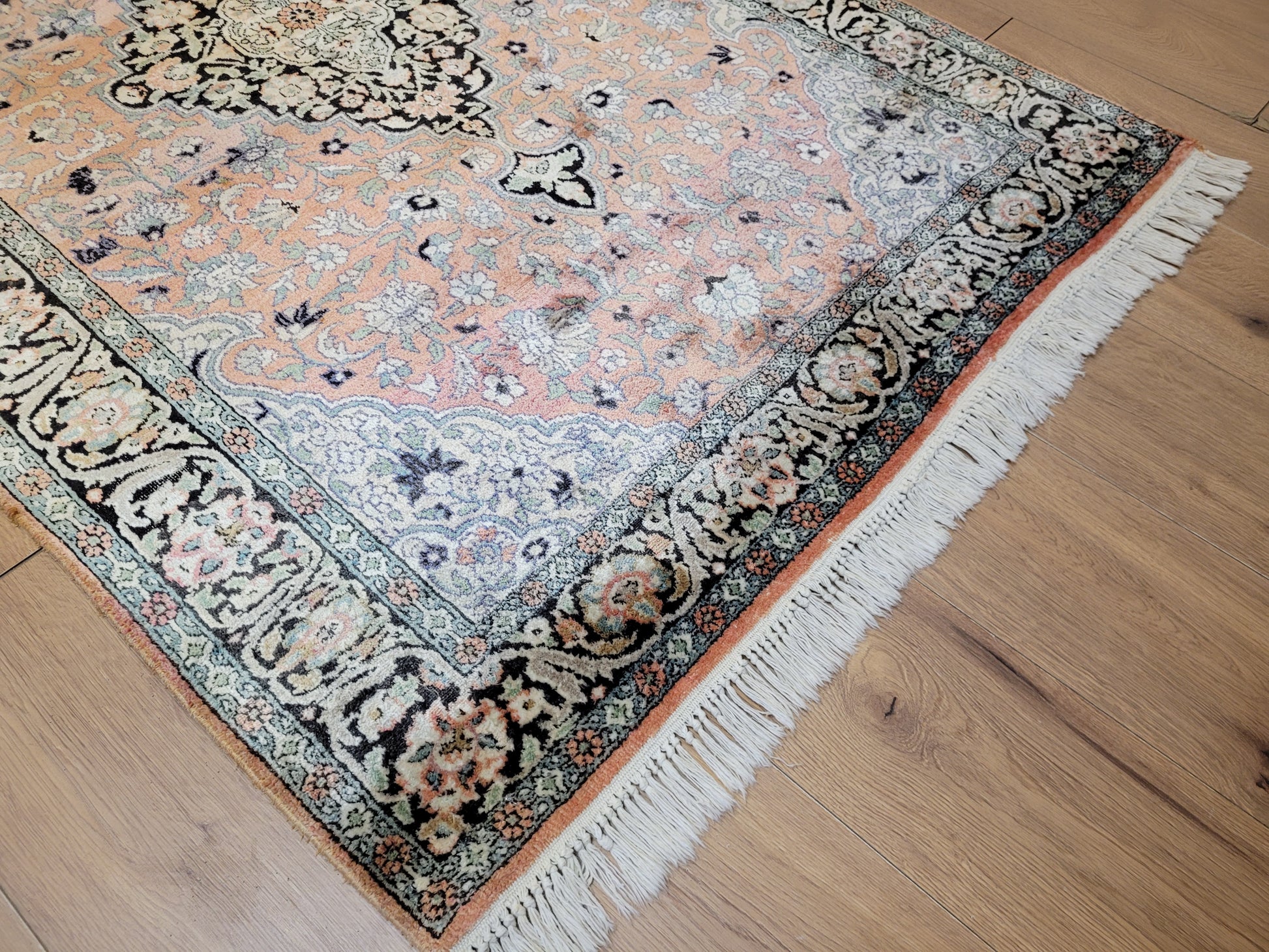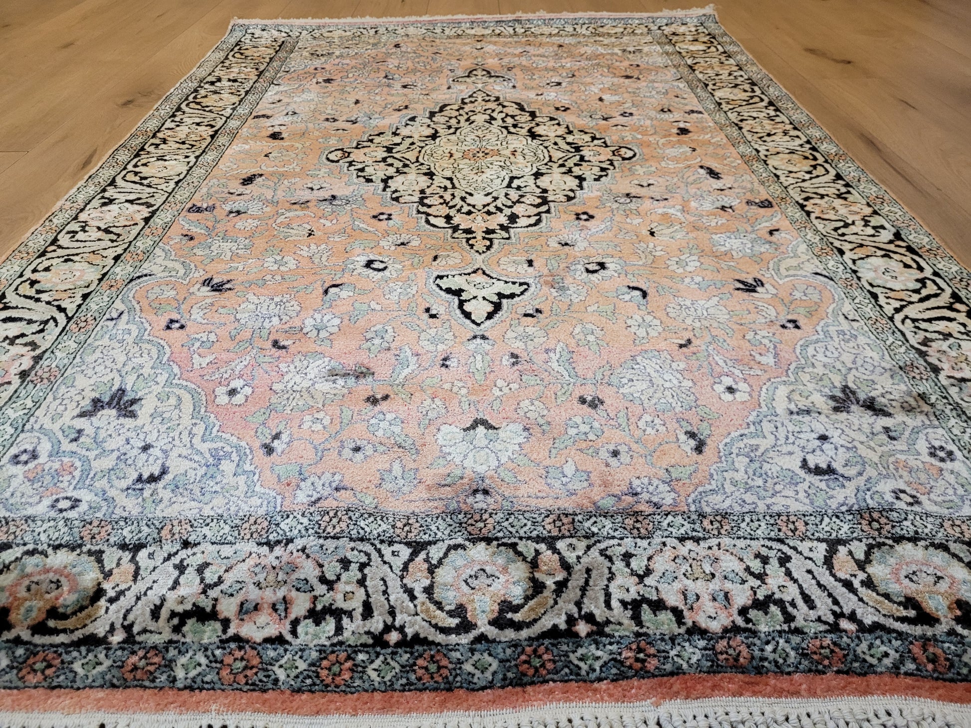 angeboten wird ein feiner Ghom Kaschmir Teppich aus reiner Seide, handgeknüpft in detailreicher Ausführung. Das zentrale Medaillon hebt sich eindrucksvoll vom zart roséfarbenen Fond ab und wird von einem üppigen Blütenmeer umrahmt. Die elegante Farbkomposition mit feinen Kontrasten verleiht dem Teppich eine edle Ausstrahlung und macht ihn zu einem künstlerisch wertvollen Stück.