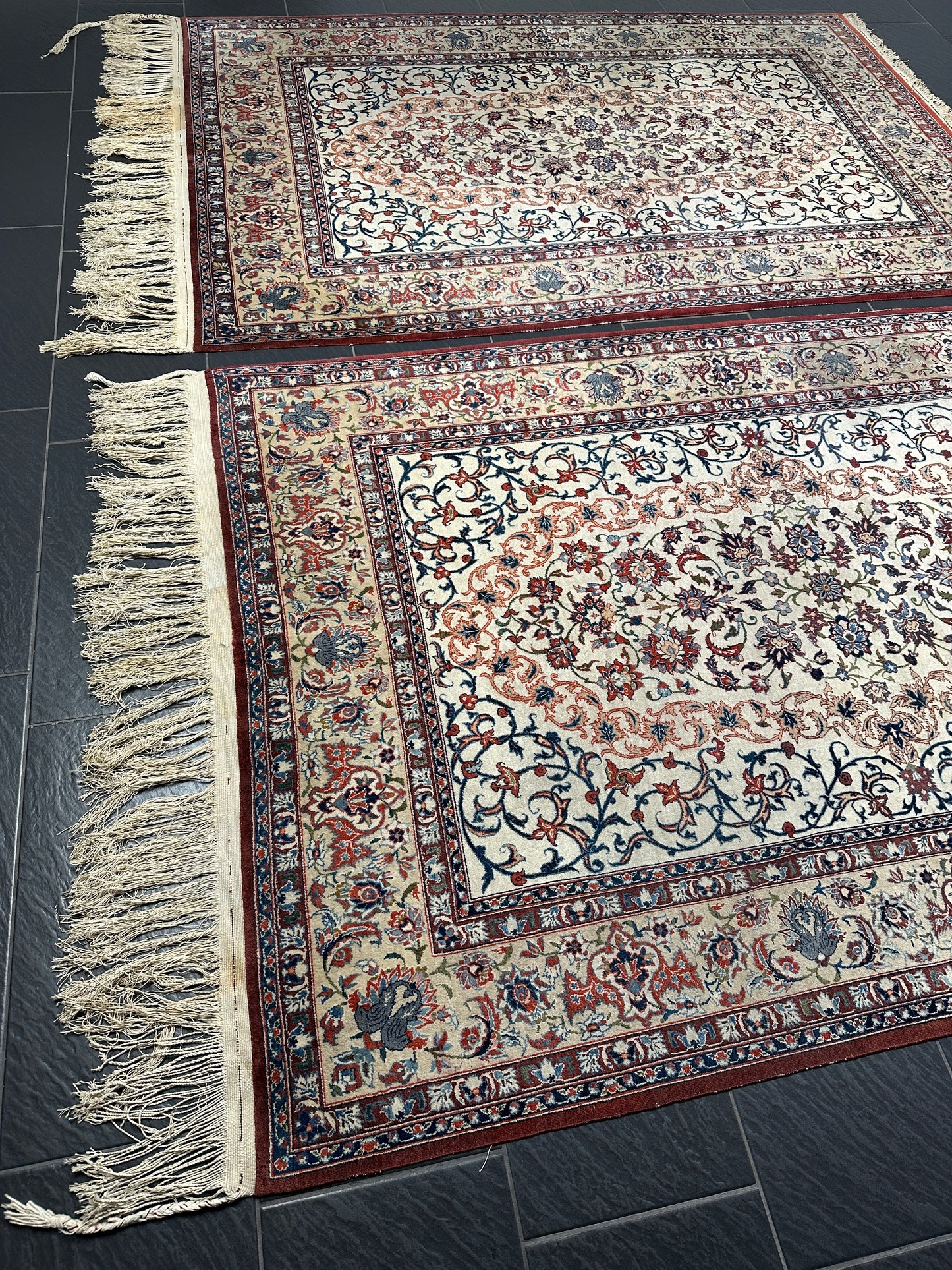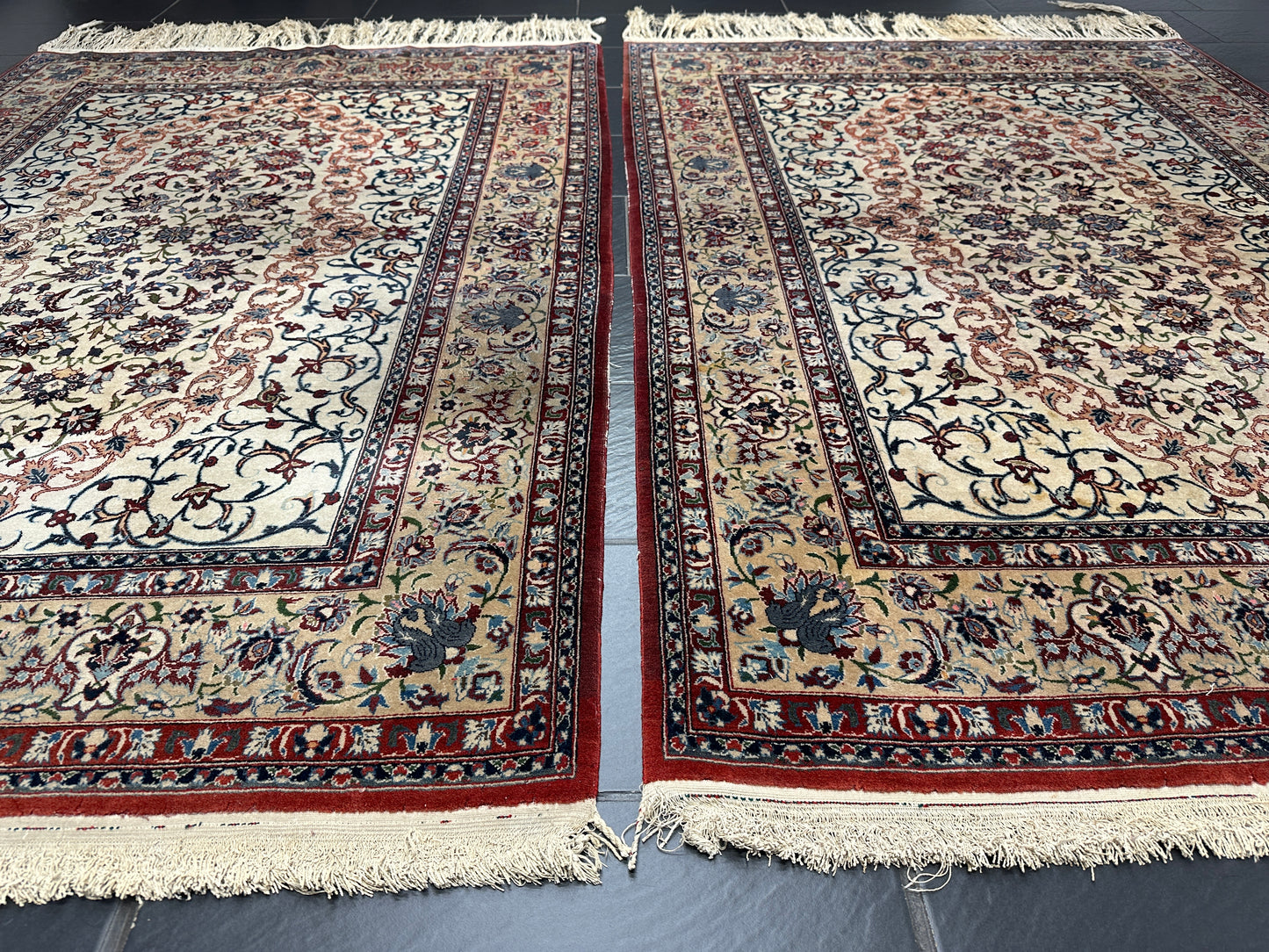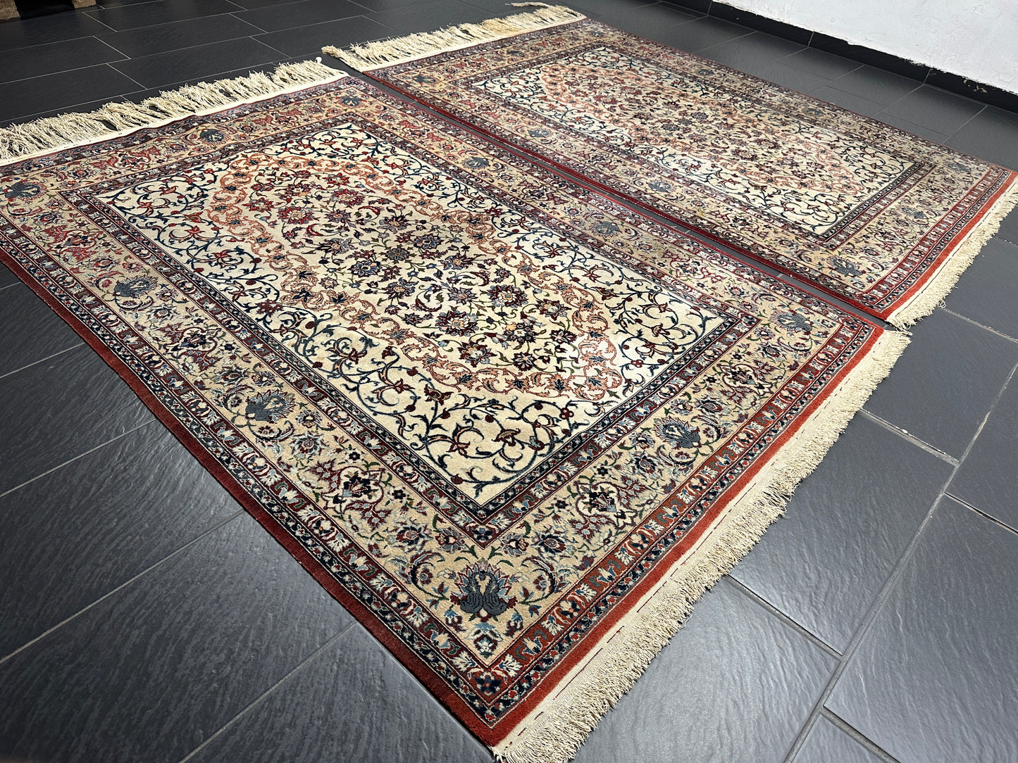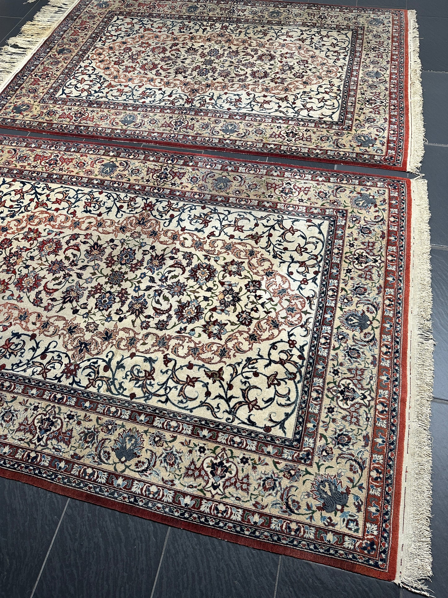 • Zustand: Trotz ihres Alters befinden sich diese Teppiche in einem bemerkenswert guten gebrauchten Zustand. Sie wurden liebevoll gepflegt und strahlen in ihrer vollen Pracht.