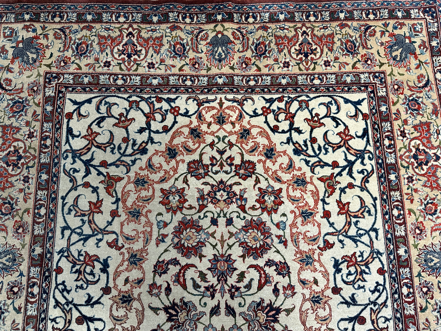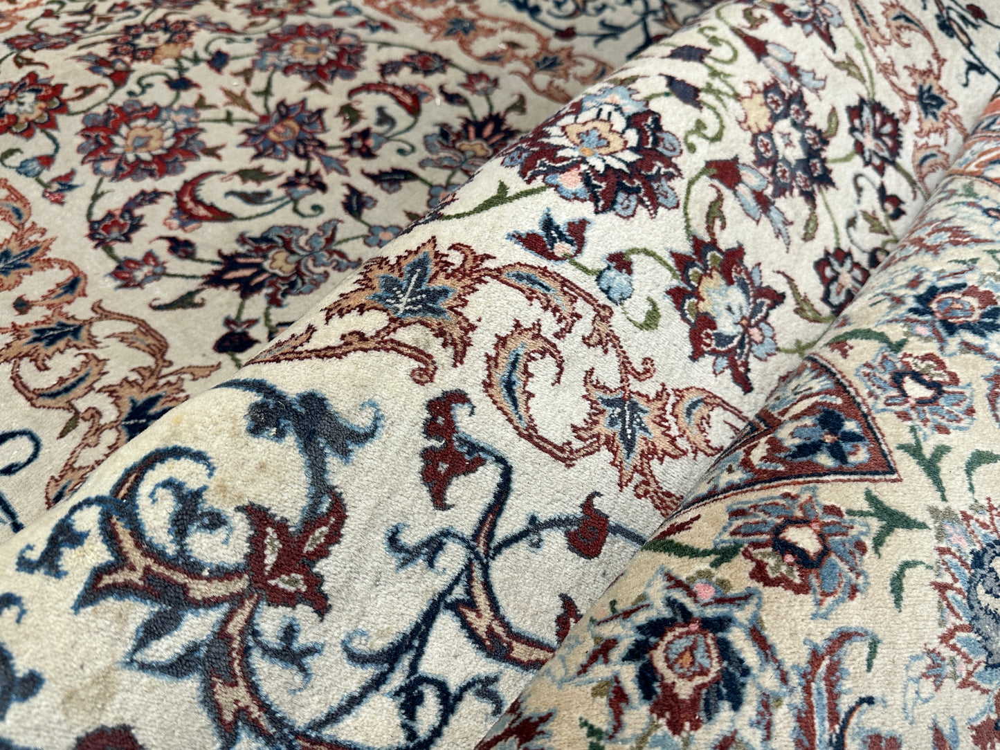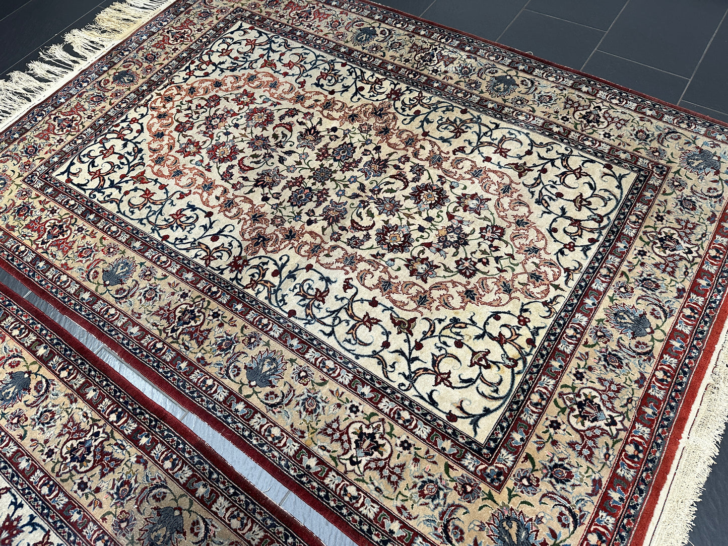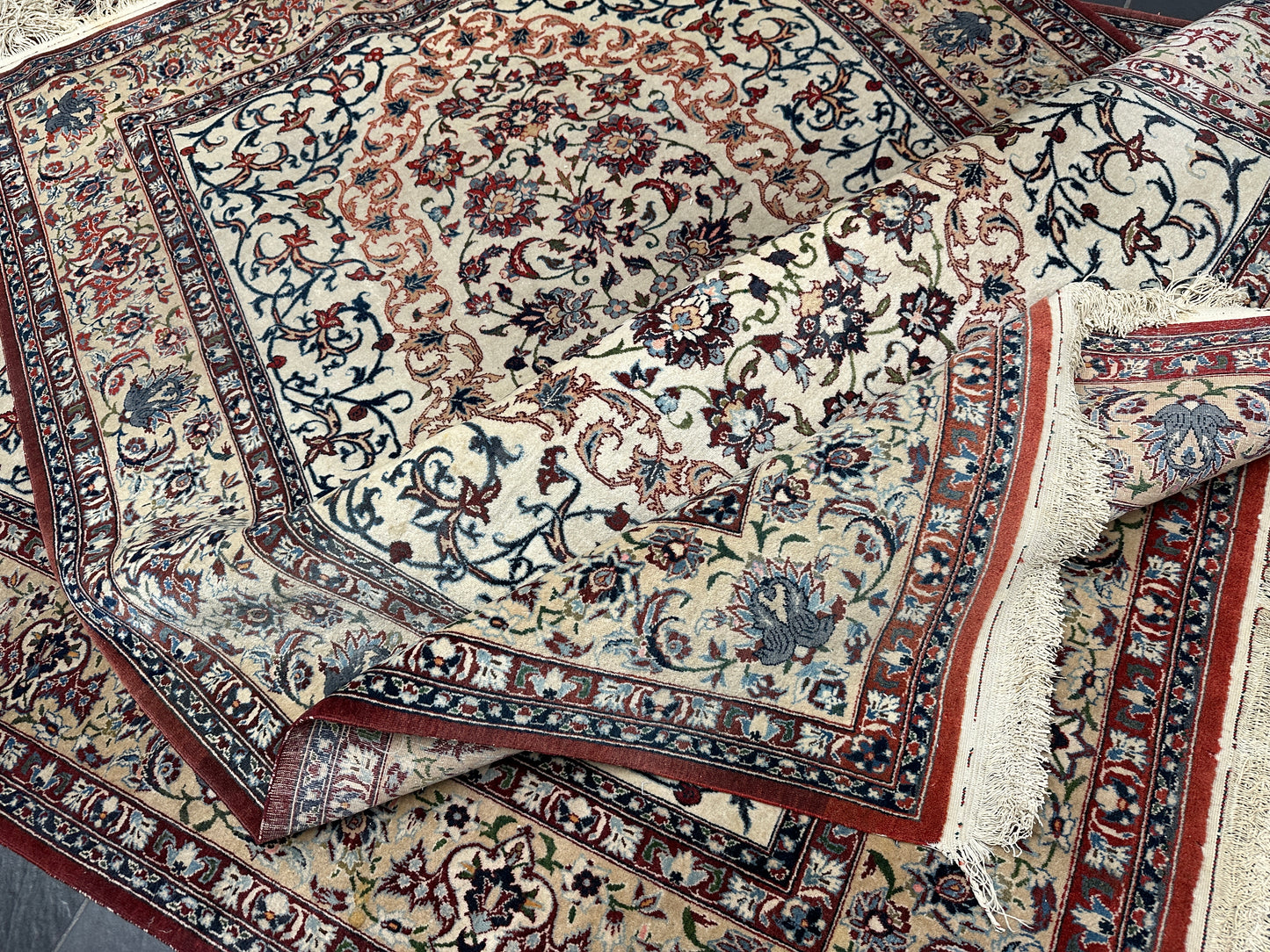 • Design: Das Design dieser Isfahan Teppiche ist ein Meisterwerk der traditionellen Teppichkunst. Die filigranen Muster und die prächtigen Farben erzählen Geschichten von jahrhundertealter Tradition.
