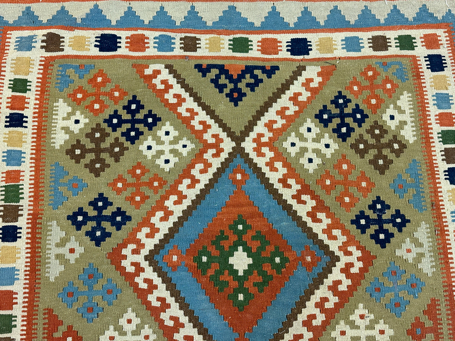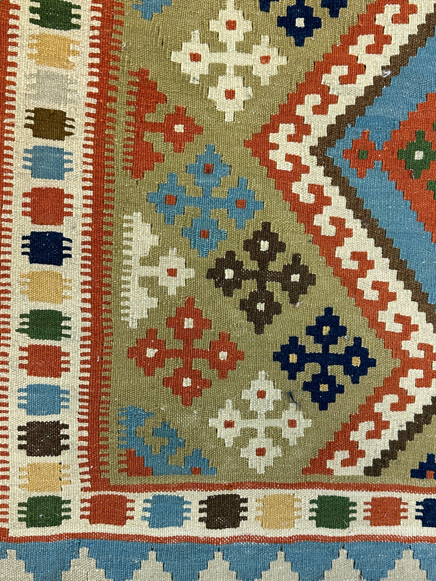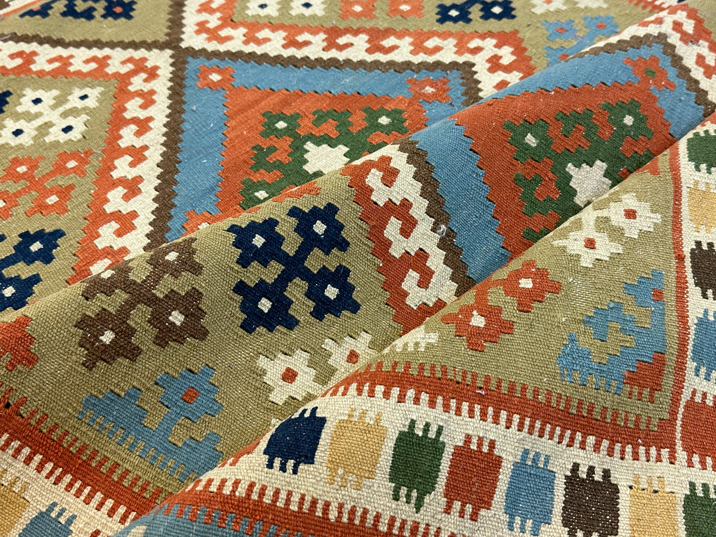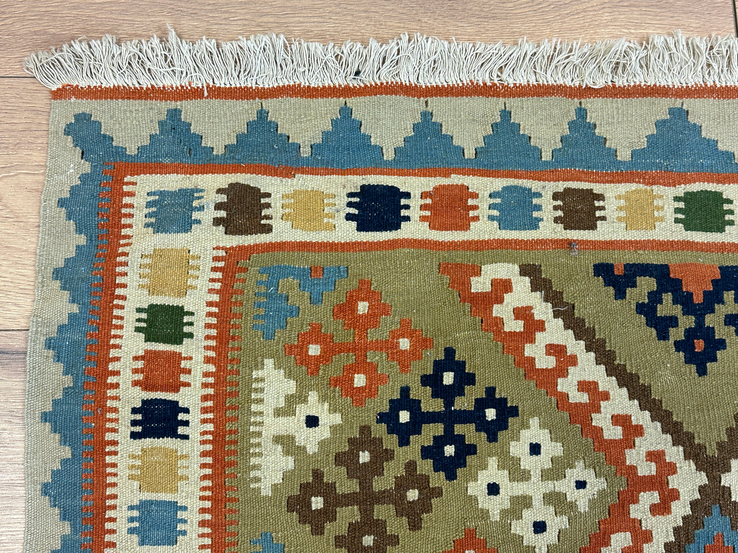 • Authentisches Kelim-Design: Die markanten Muster und lebendigen Farben dieses Kelim-Teppichs spiegeln die traditionelle Handwerkskunst der Gaschgai-Region wider.