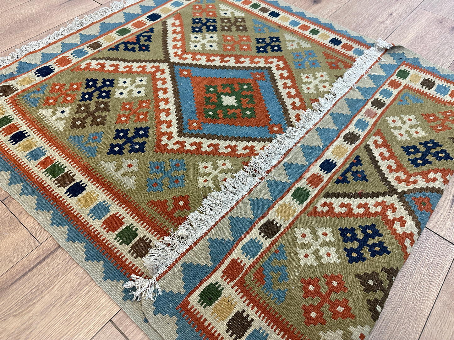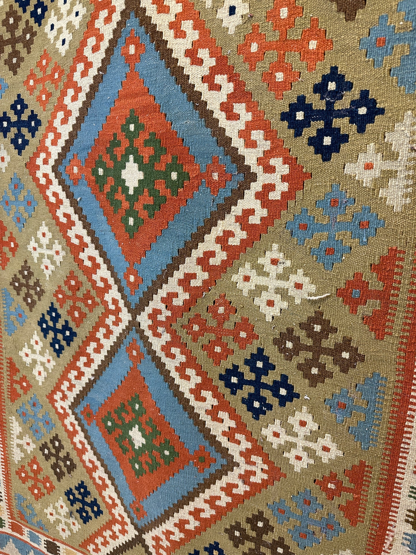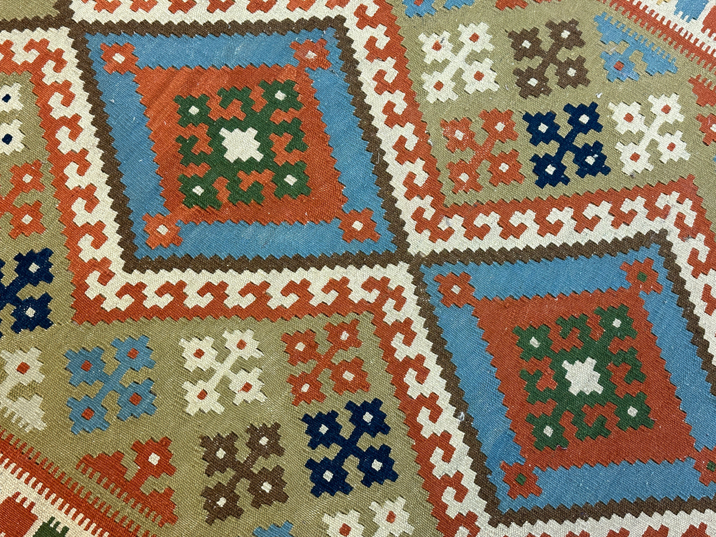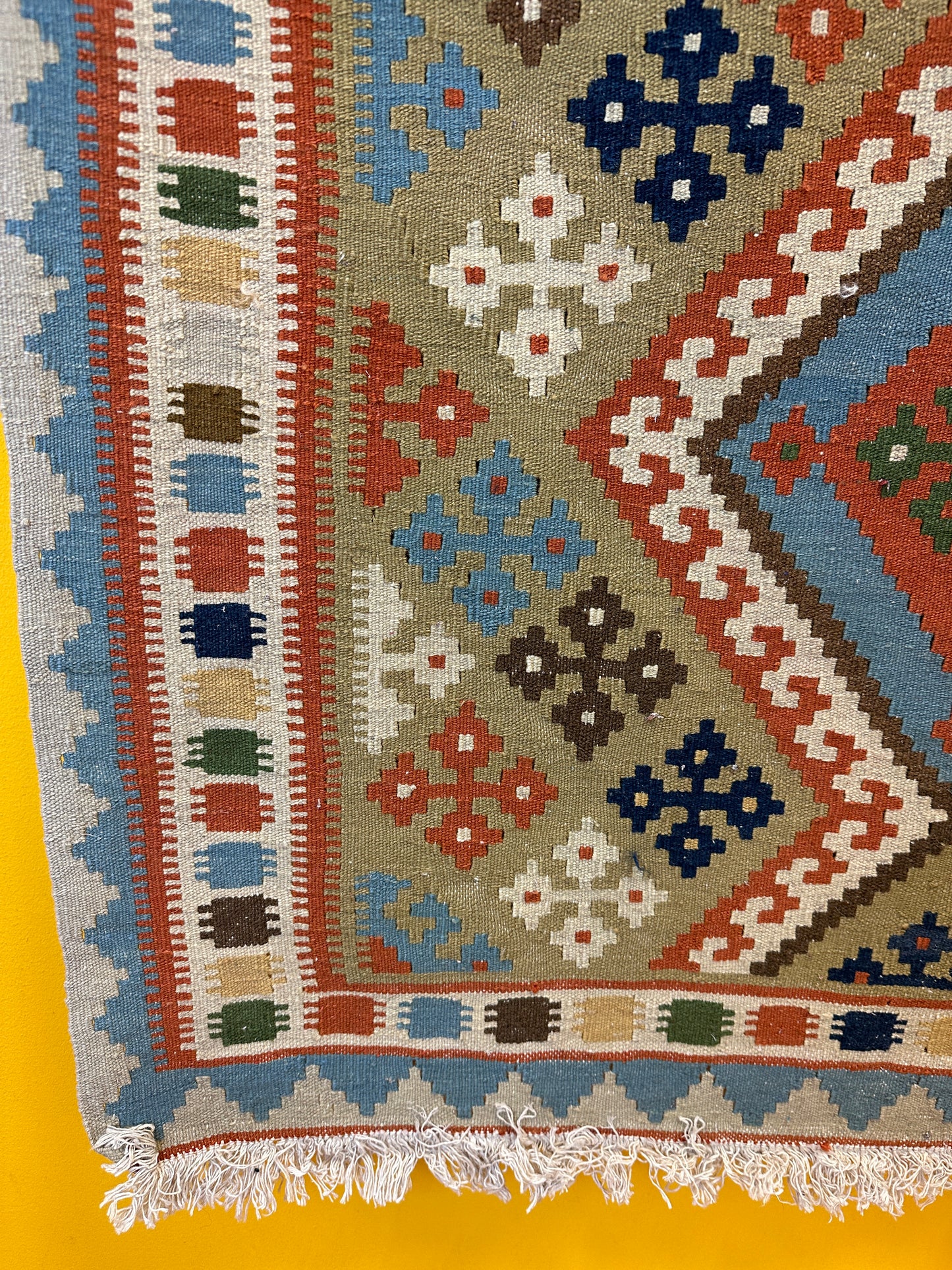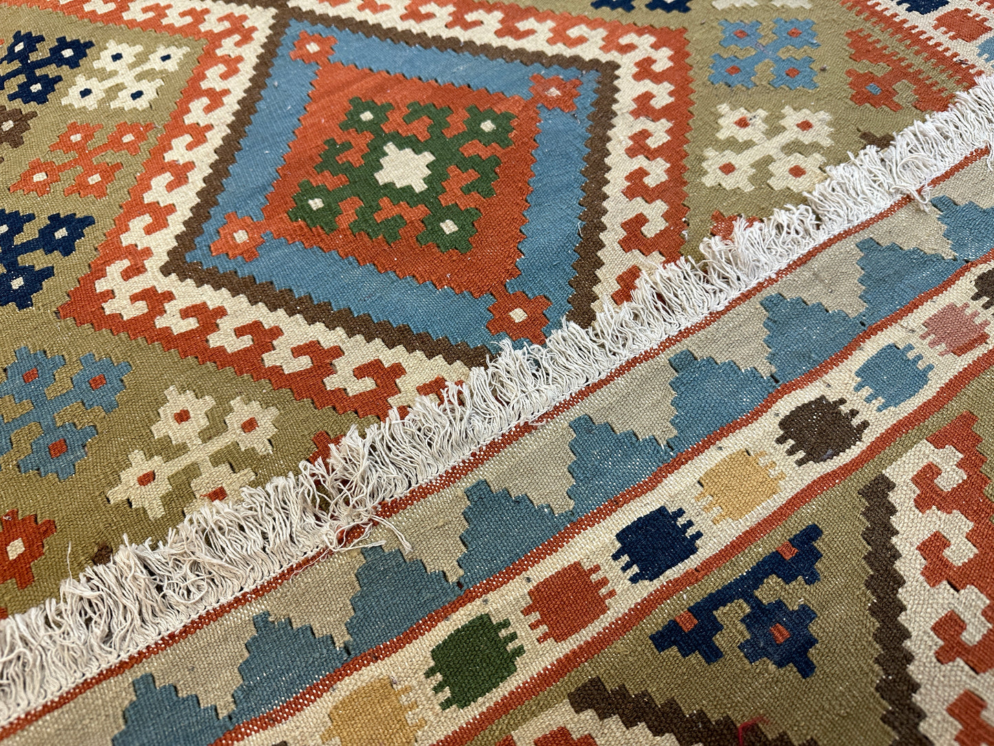 • Authentisches Kelim-Design: Die markanten Muster und lebendigen Farben dieses Kelim-Teppichs spiegeln die traditionelle Handwerkskunst der Gaschgai-Region wider.