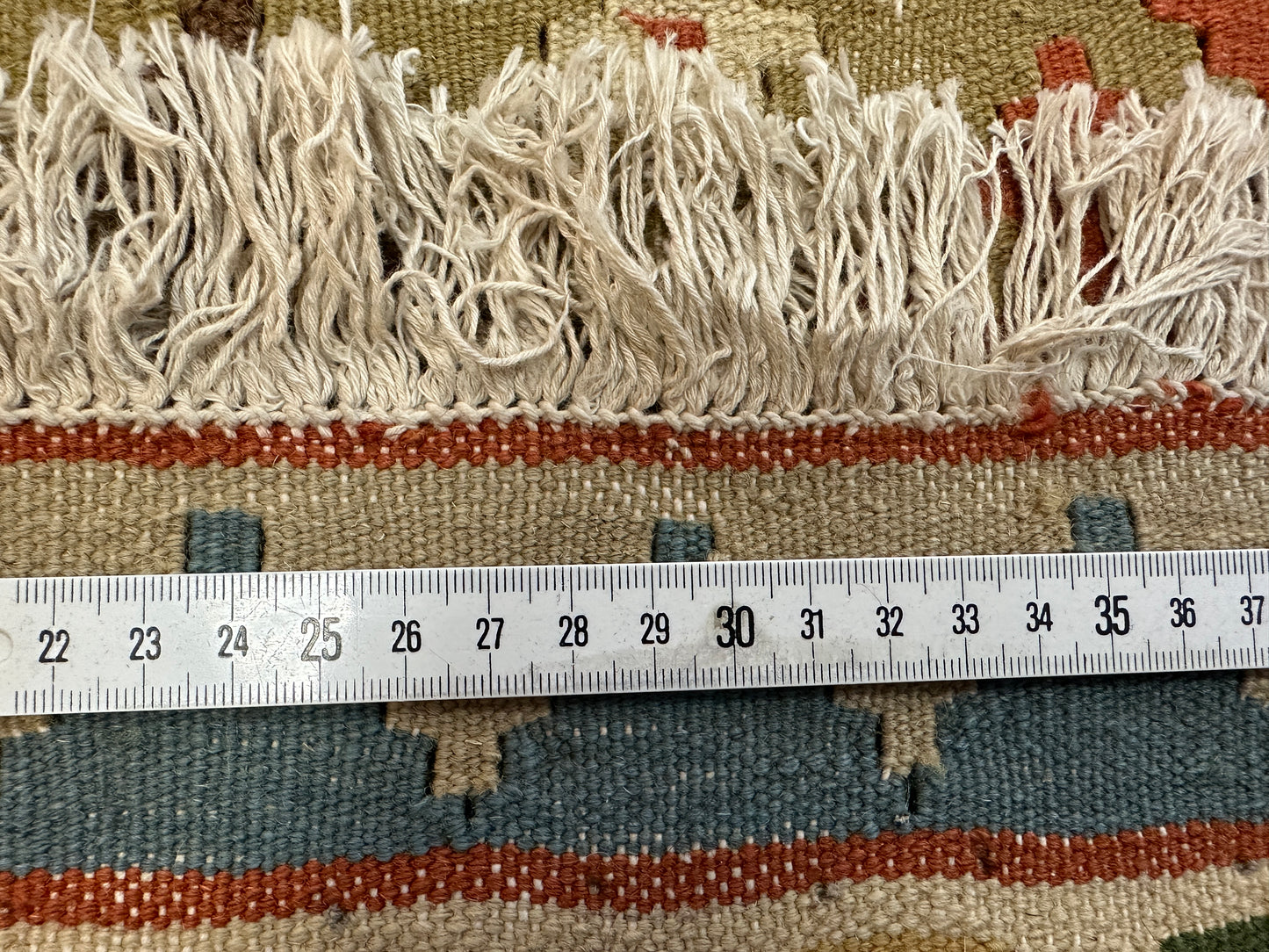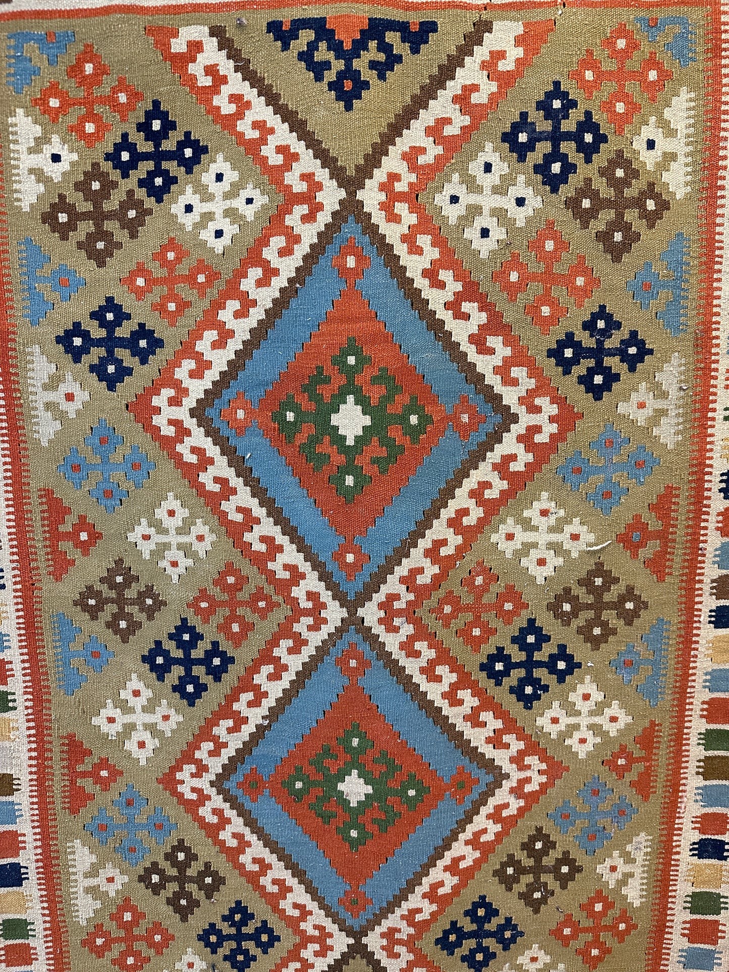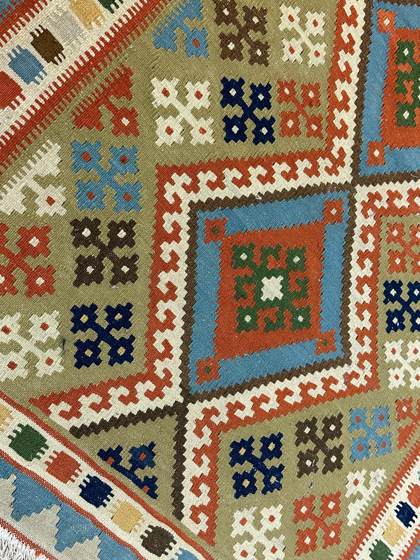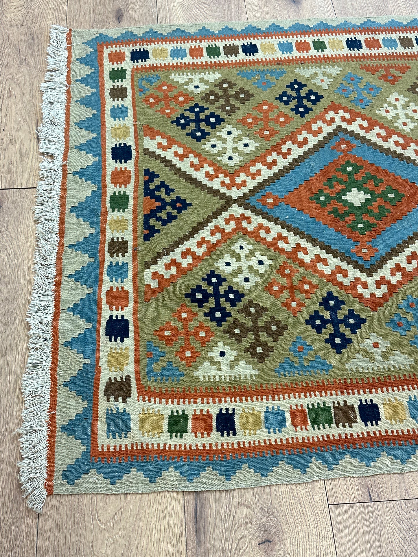 • Authentisches Kelim-Design: Die markanten Muster und lebendigen Farben dieses Kelim-Teppichs spiegeln die traditionelle Handwerkskunst der Gaschgai-Region wider.