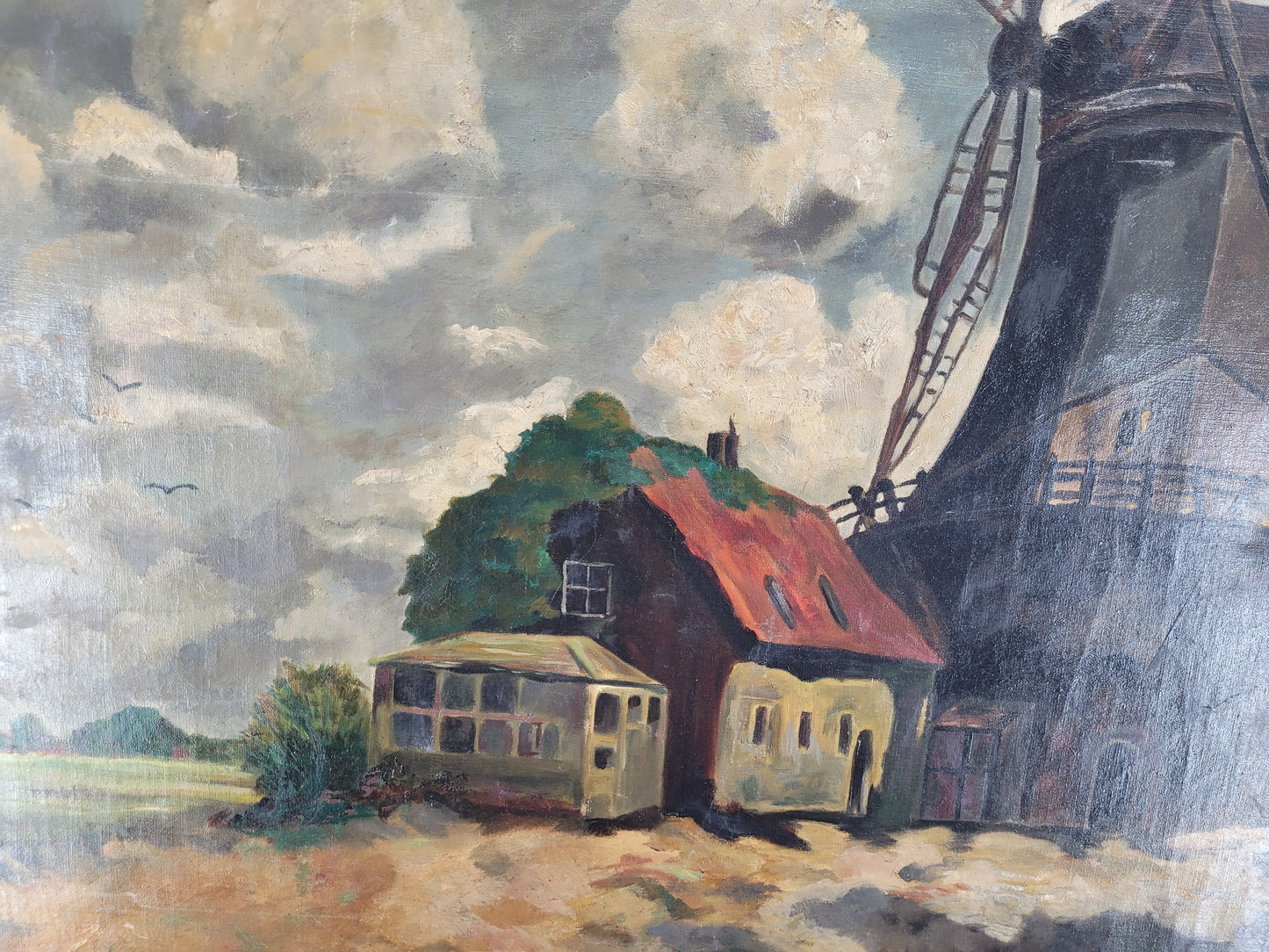 Beschreibung: Dieses fesselnde Ölgemälde der Holländischen Schule aus dem 19. Jahrhundert präsentiert die malerische Idylle einer alten Mühle inmitten einer klassischen holländischen oder norddeutschen Landschaft. Im Zentrum des Bildes steht eine imposante alte Mühle, umgeben von weiten Feldern und einem kleinen Haus. Die Szene wird durch einen wunderschönen Himmel mit dicken Wolken vervollständigt, der dem Gemälde eine atmosphärische Tiefe verleiht.