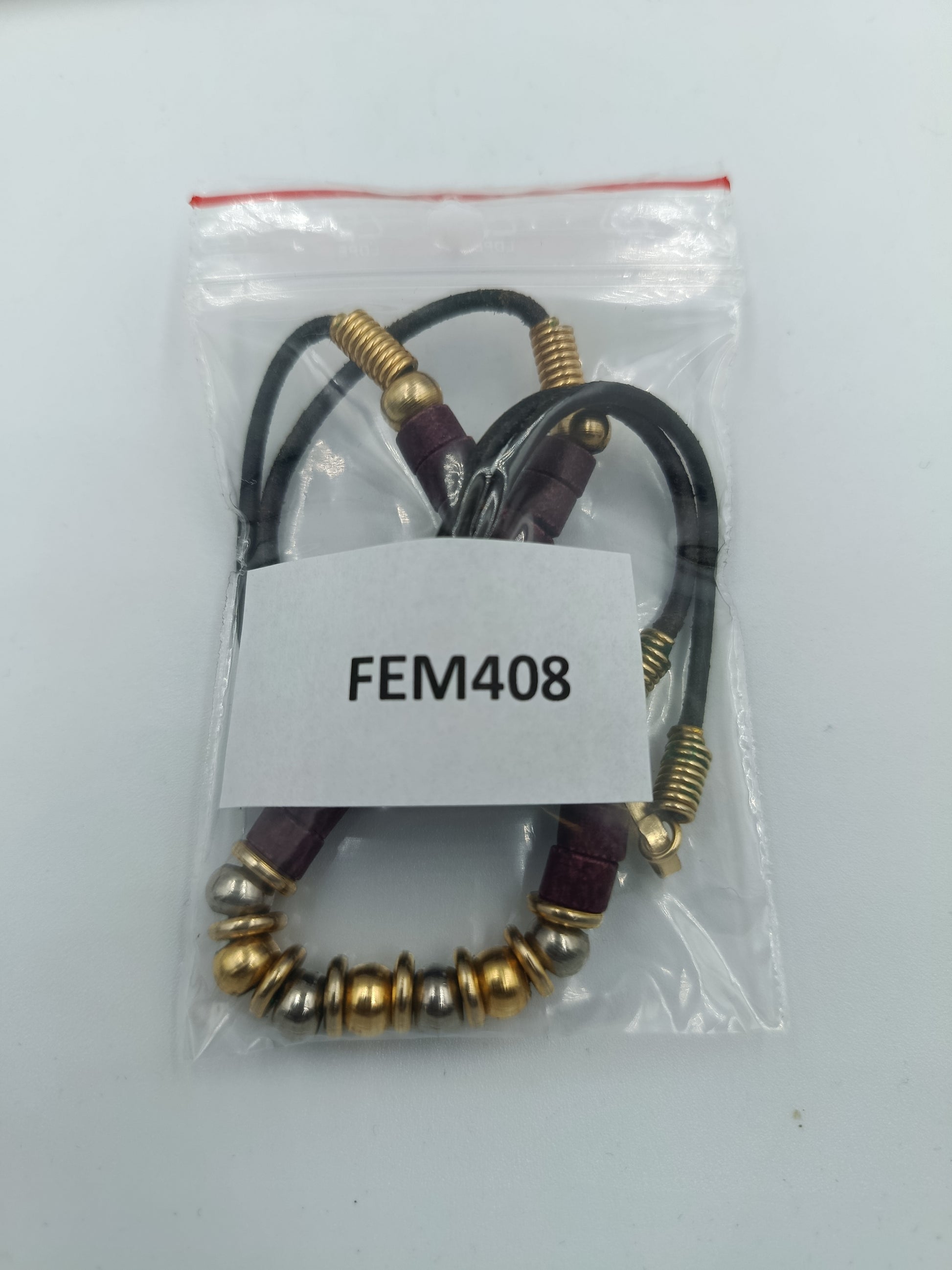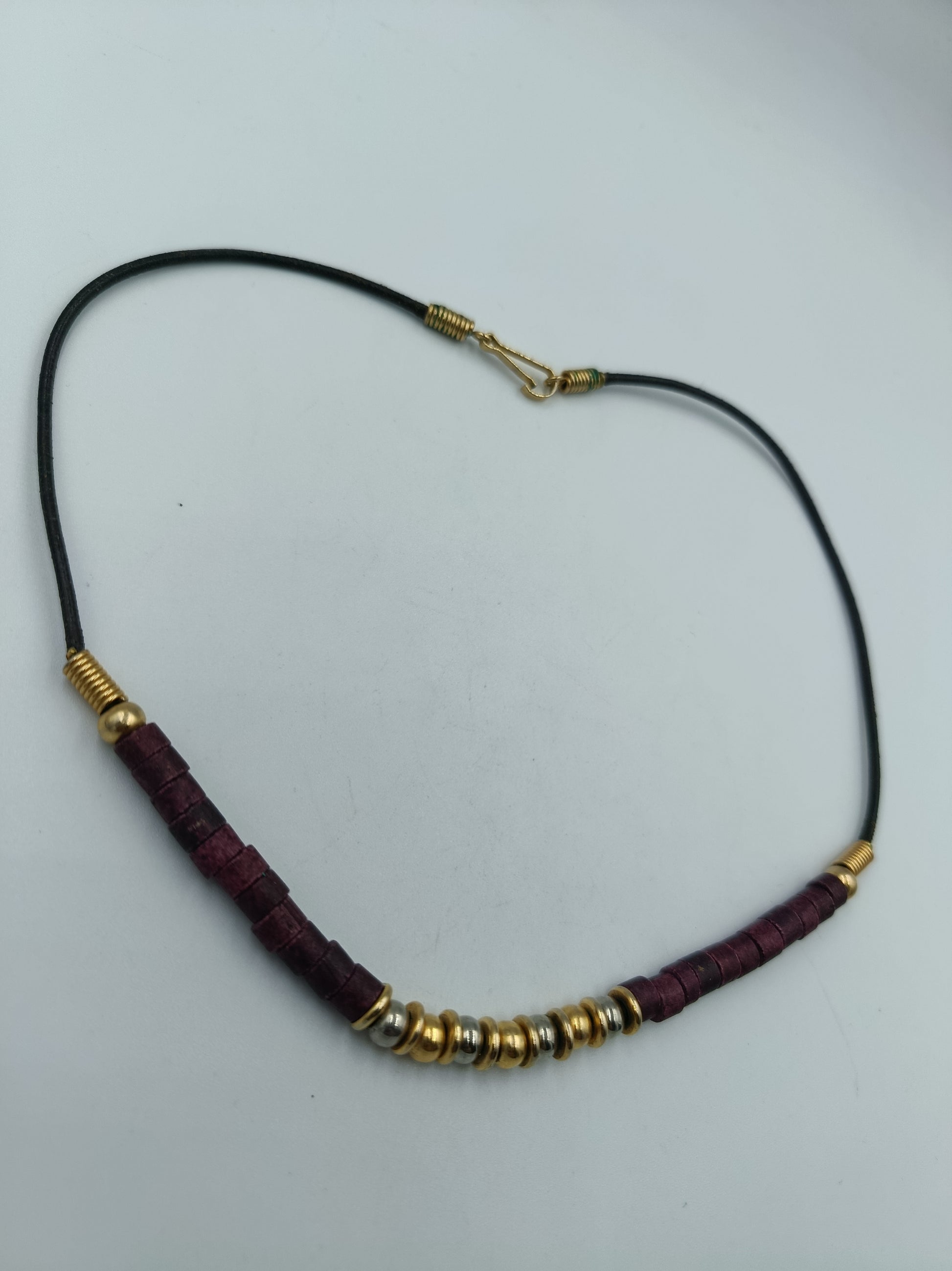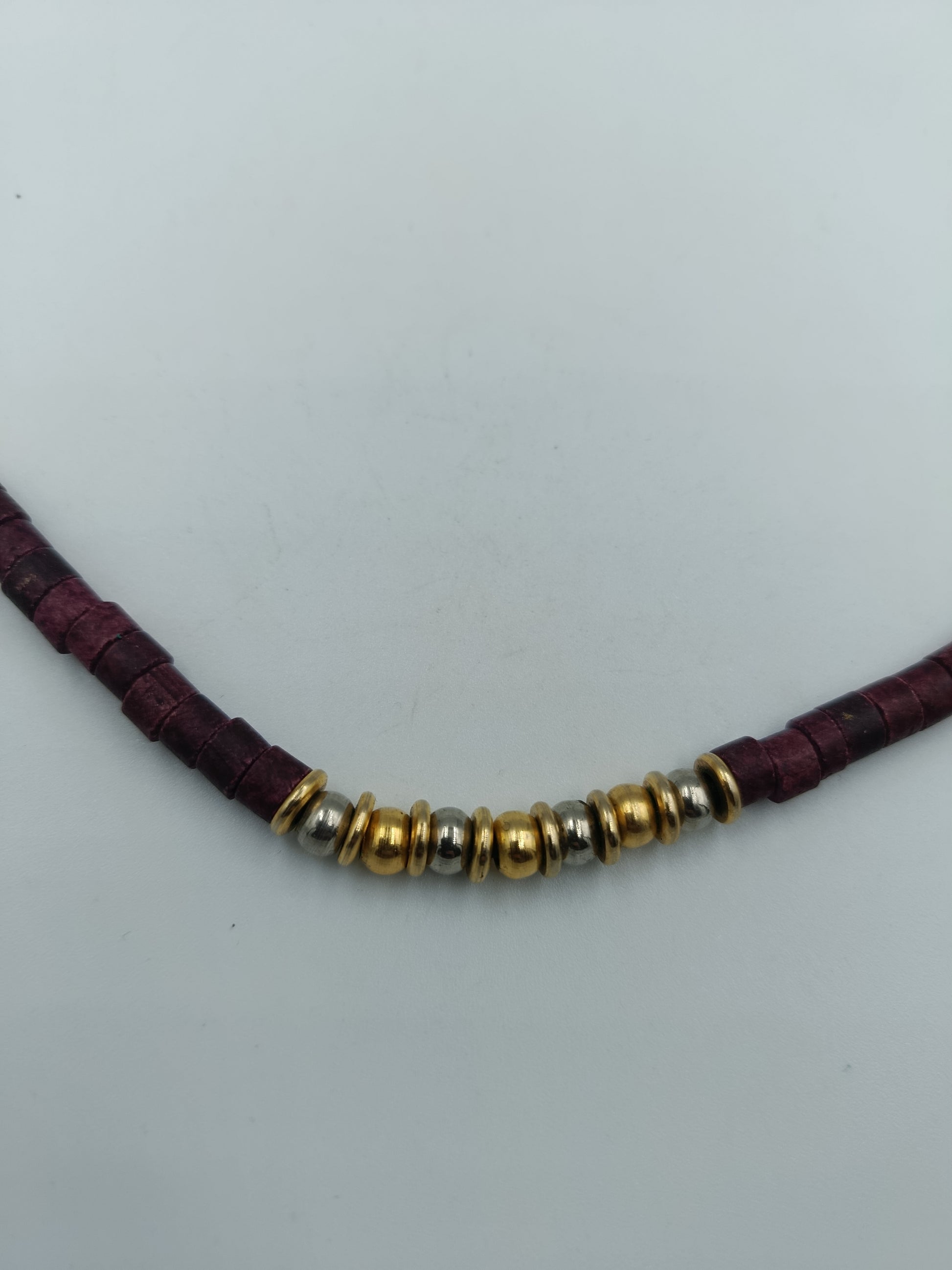 Schlichte und dennoch markante Halskette aus schwarzem Lederband, verziert mit einer Kombination aus gold- und silberfarbenen Zierelementen. Ergänzt wird das Design durch rötlich-violette Scheibenperlen, die der Kette einen farbigen Akzent und einen Hauch von Individualität verleihen.