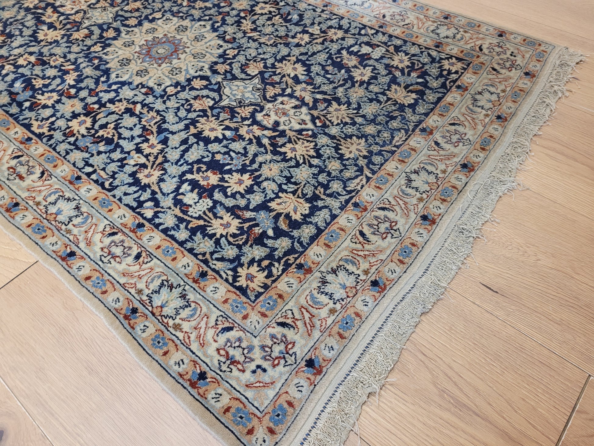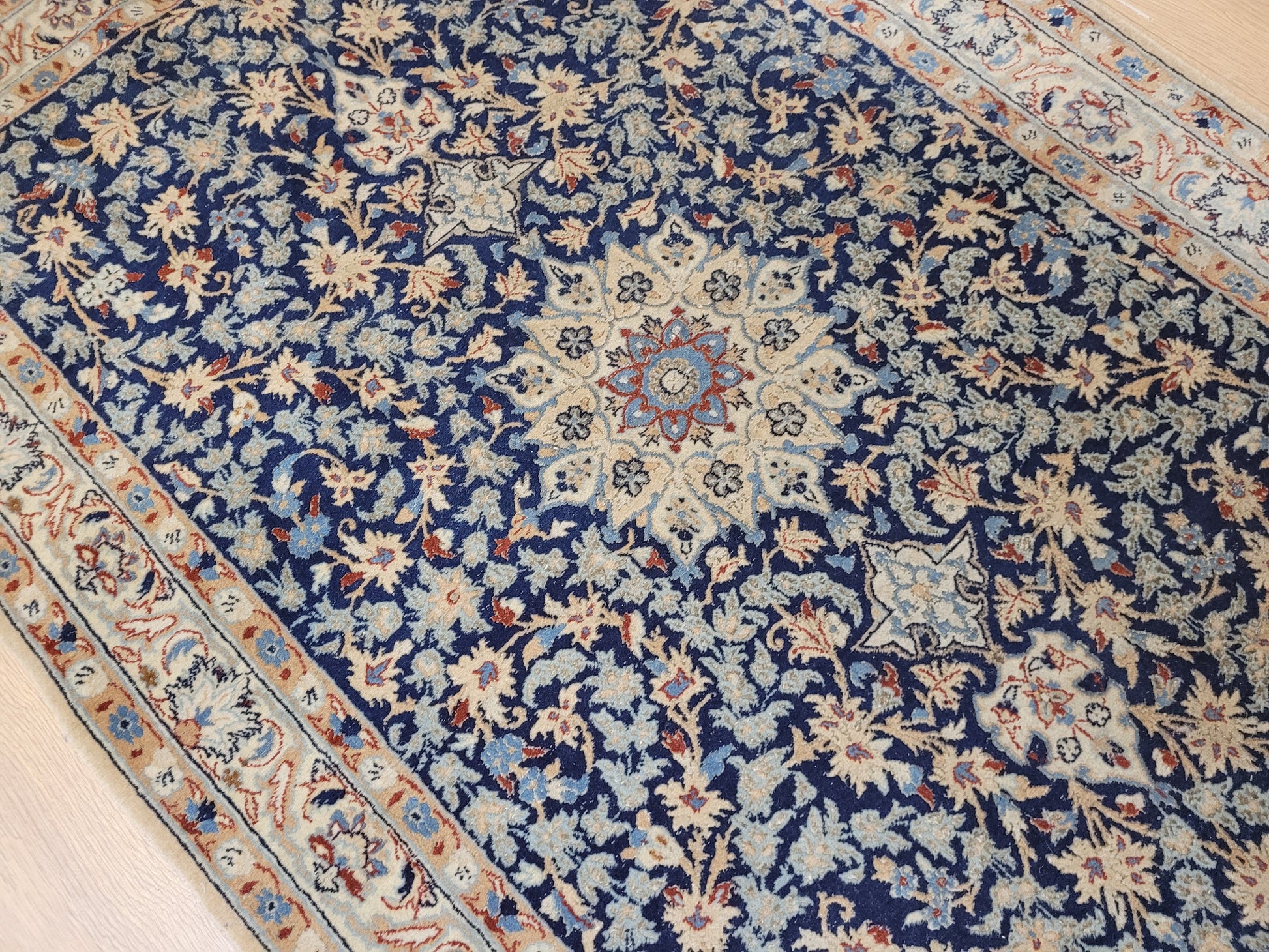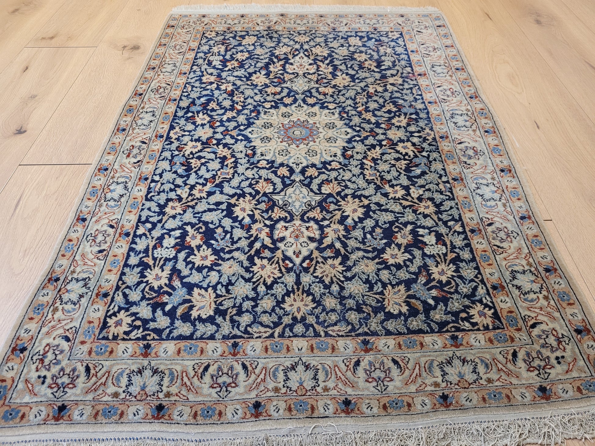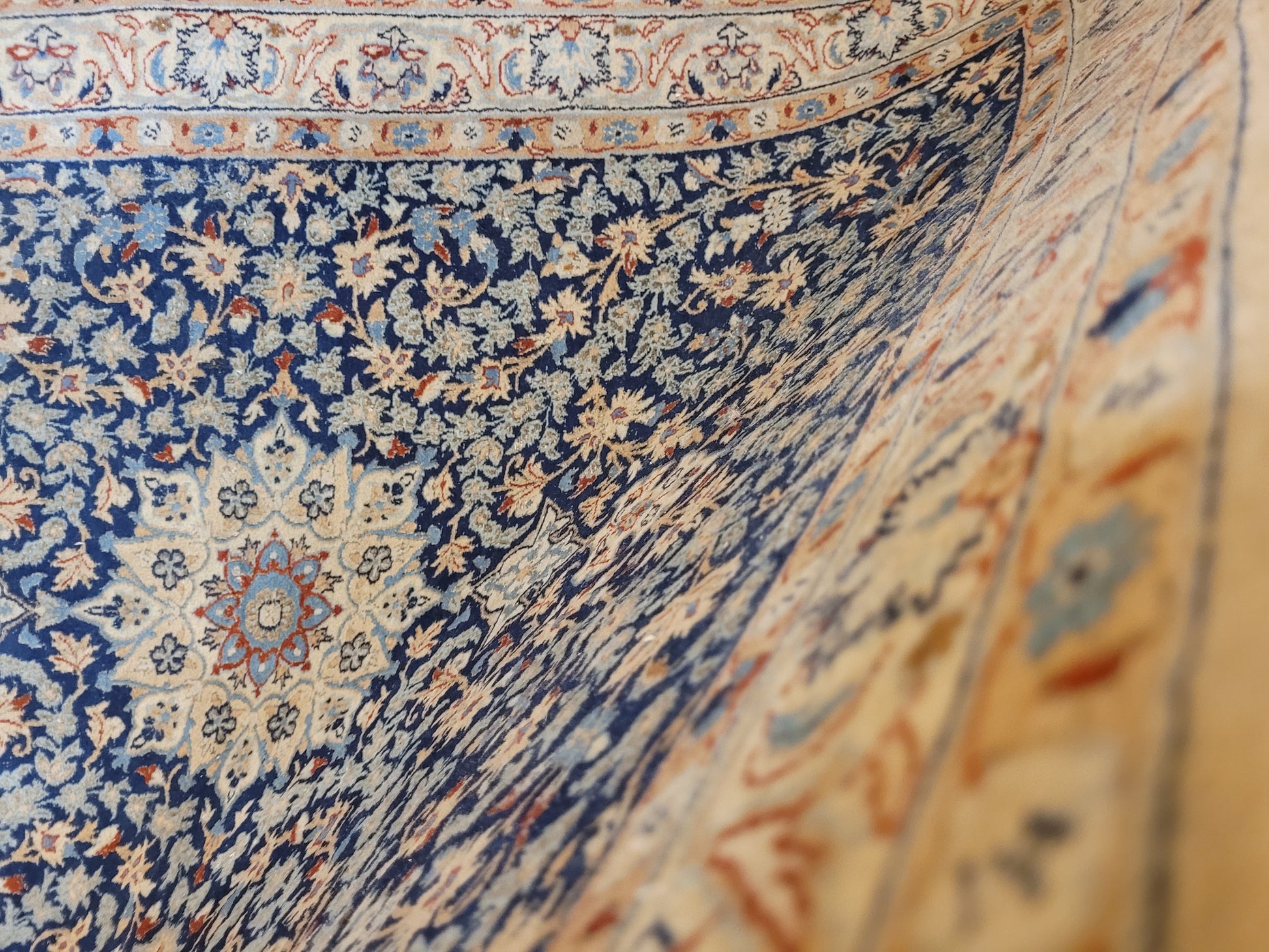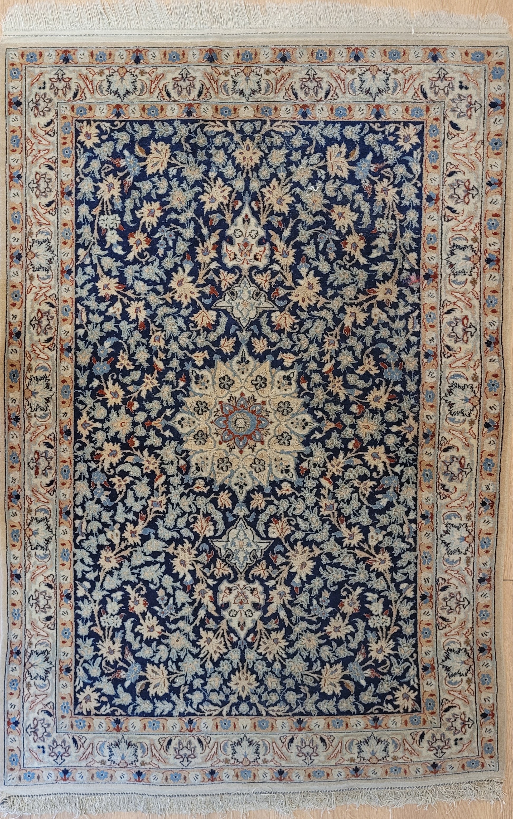 angeboten wird ein feiner Nain Teppich aus Korkwolle, handgeknüpft mit detailreicher Knüpfkunst. Das Zentrum ziert ein klassisches Medaillon, eingebettet in ein dichtes, florales Rankenmuster. Die harmonische Farbgebung in Blau, Beige und Akzenttönen verleiht diesem Stück eine zeitlose Eleganz.