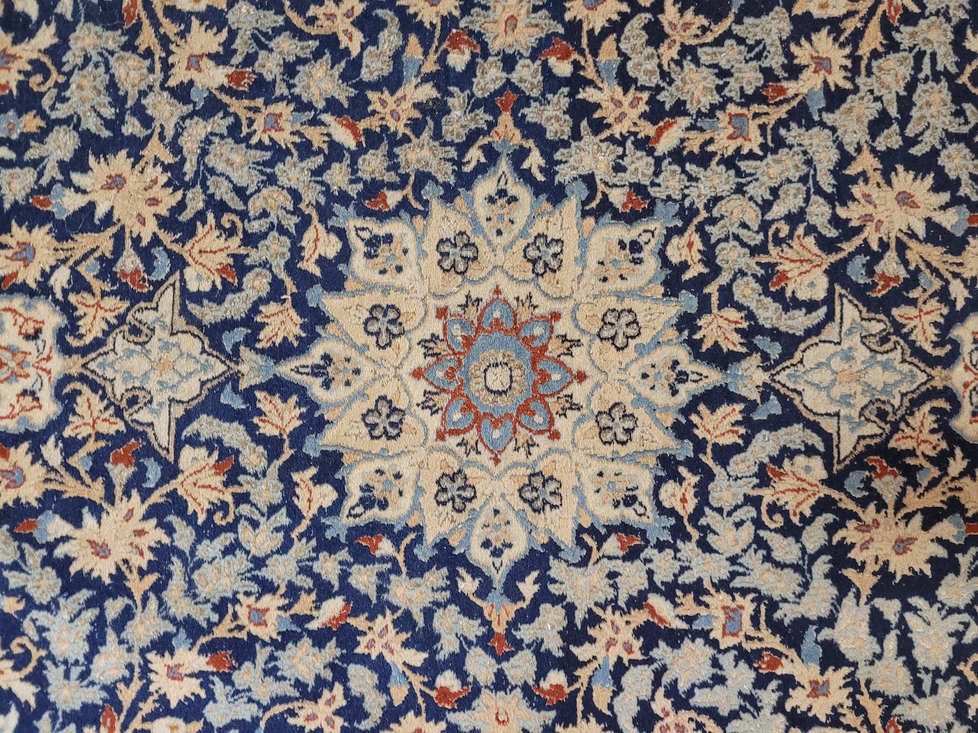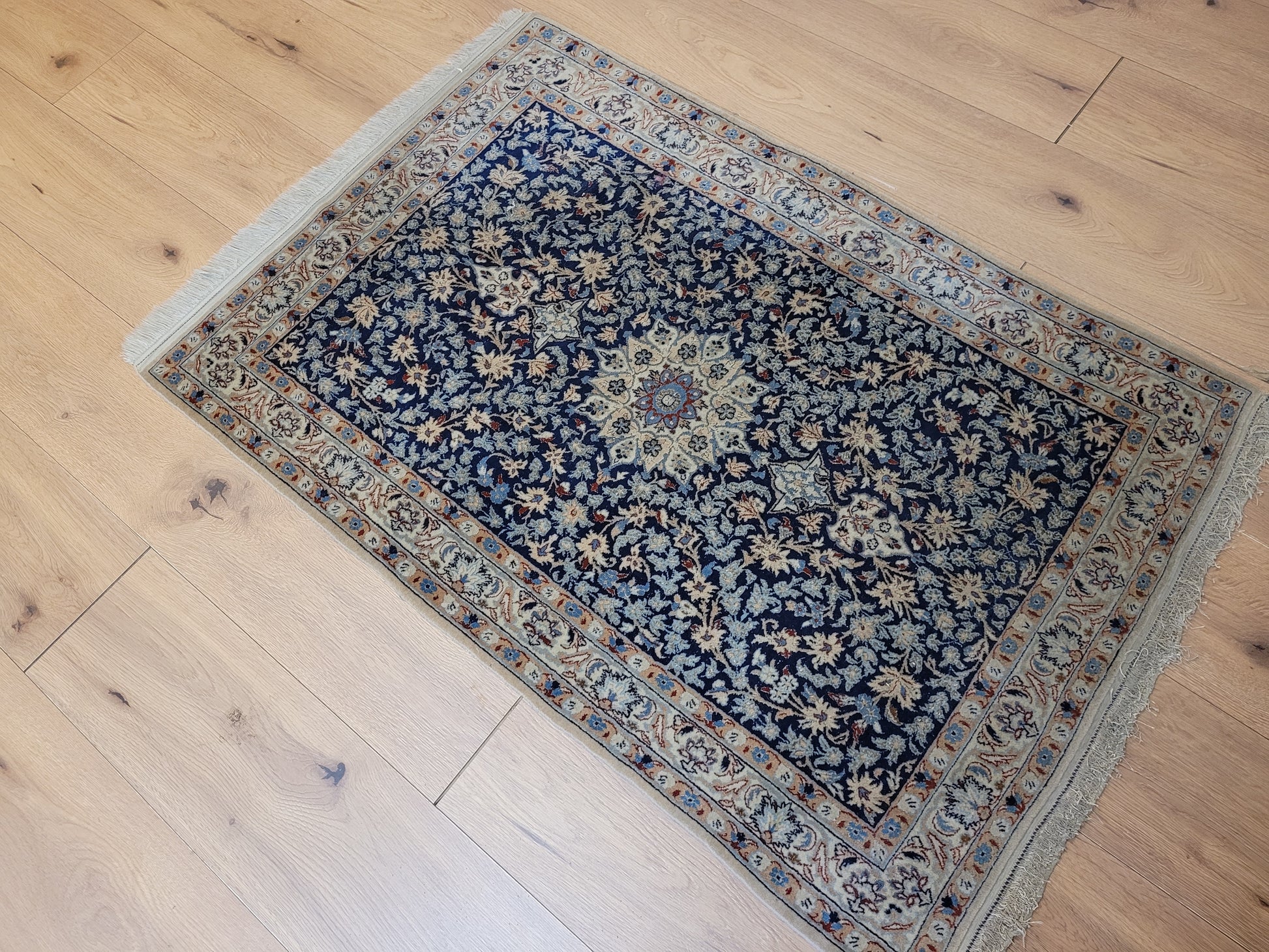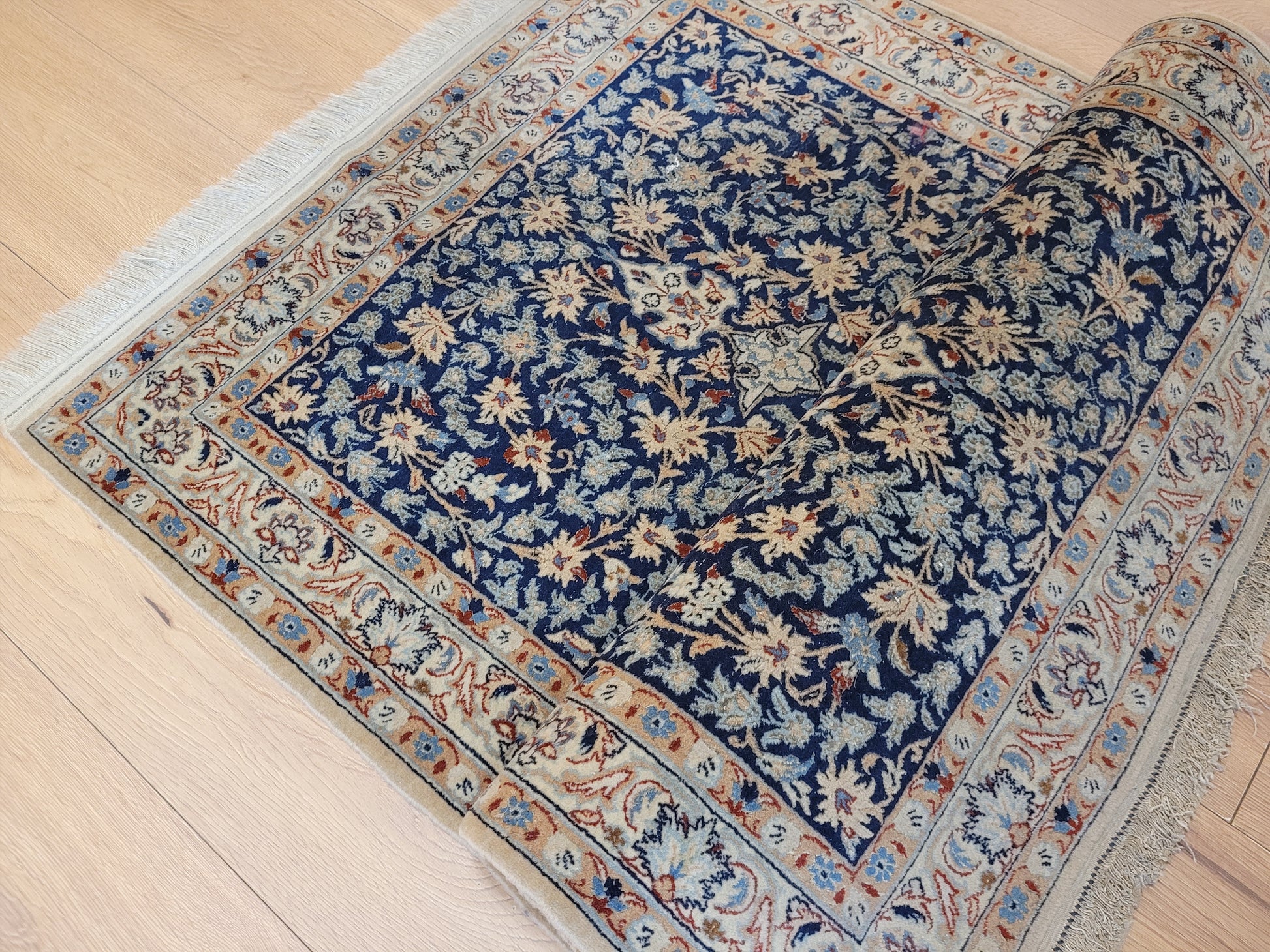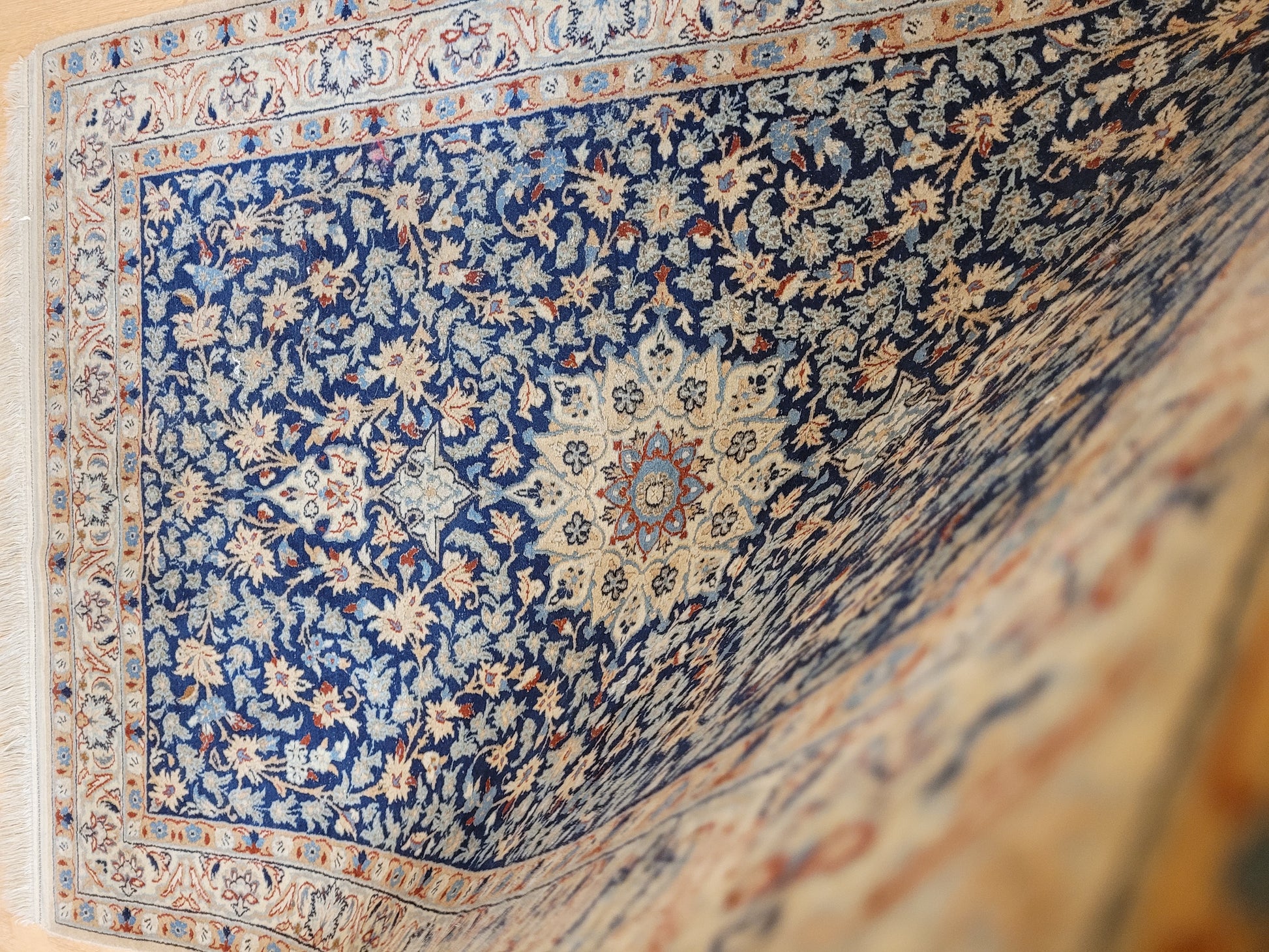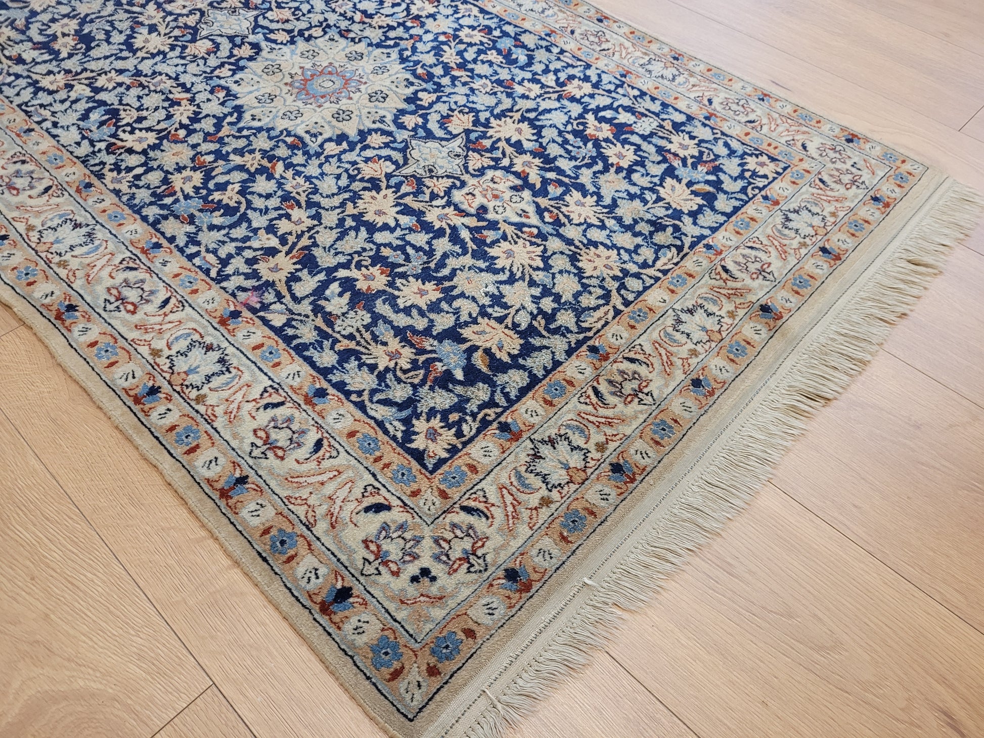 angeboten wird ein feiner Nain Teppich aus Korkwolle, handgeknüpft mit detailreicher Knüpfkunst. Das Zentrum ziert ein klassisches Medaillon, eingebettet in ein dichtes, florales Rankenmuster. Die harmonische Farbgebung in Blau, Beige und Akzenttönen verleiht diesem Stück eine zeitlose Eleganz.