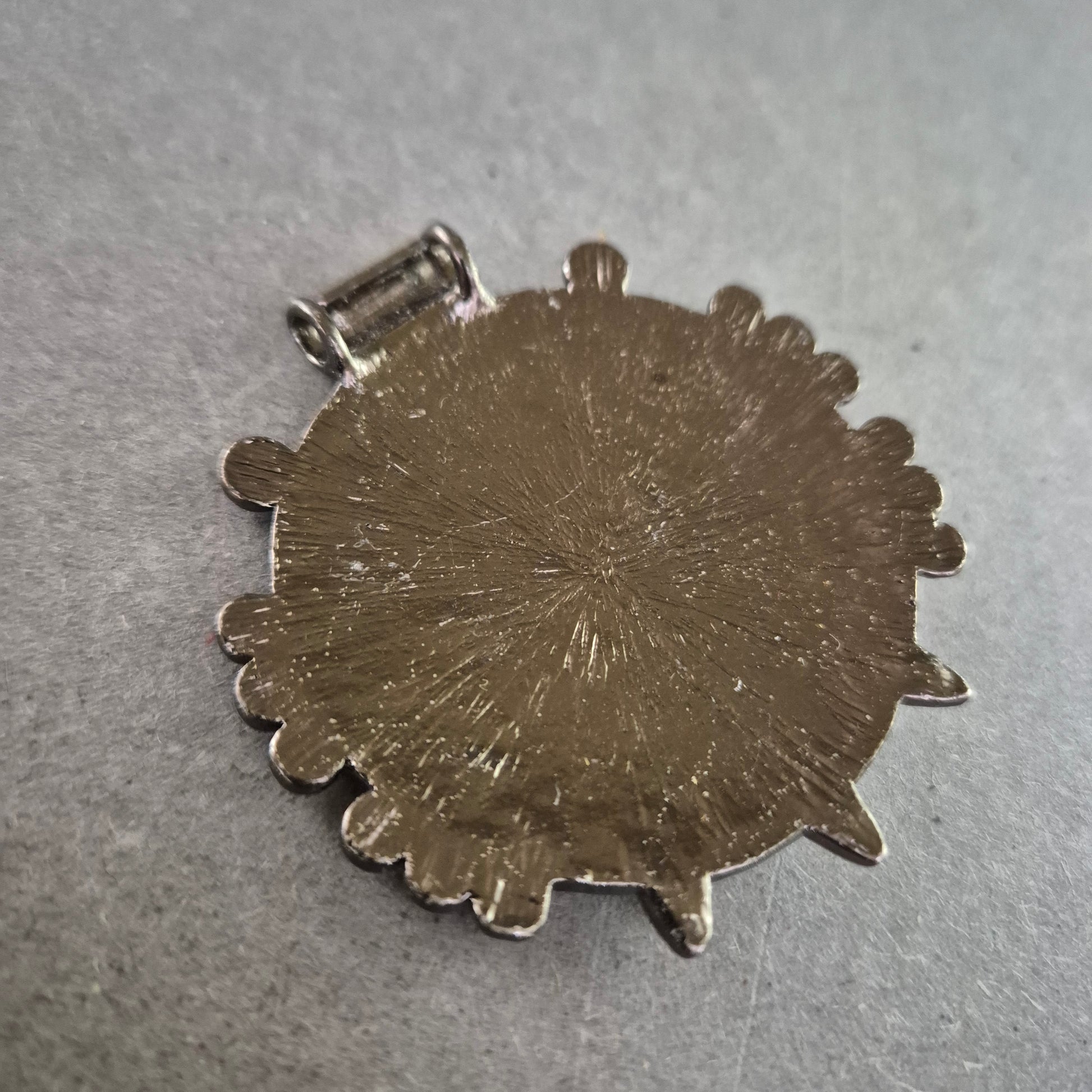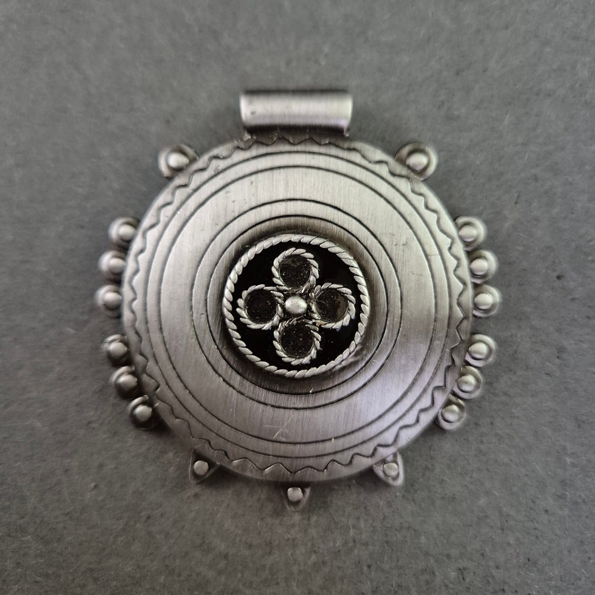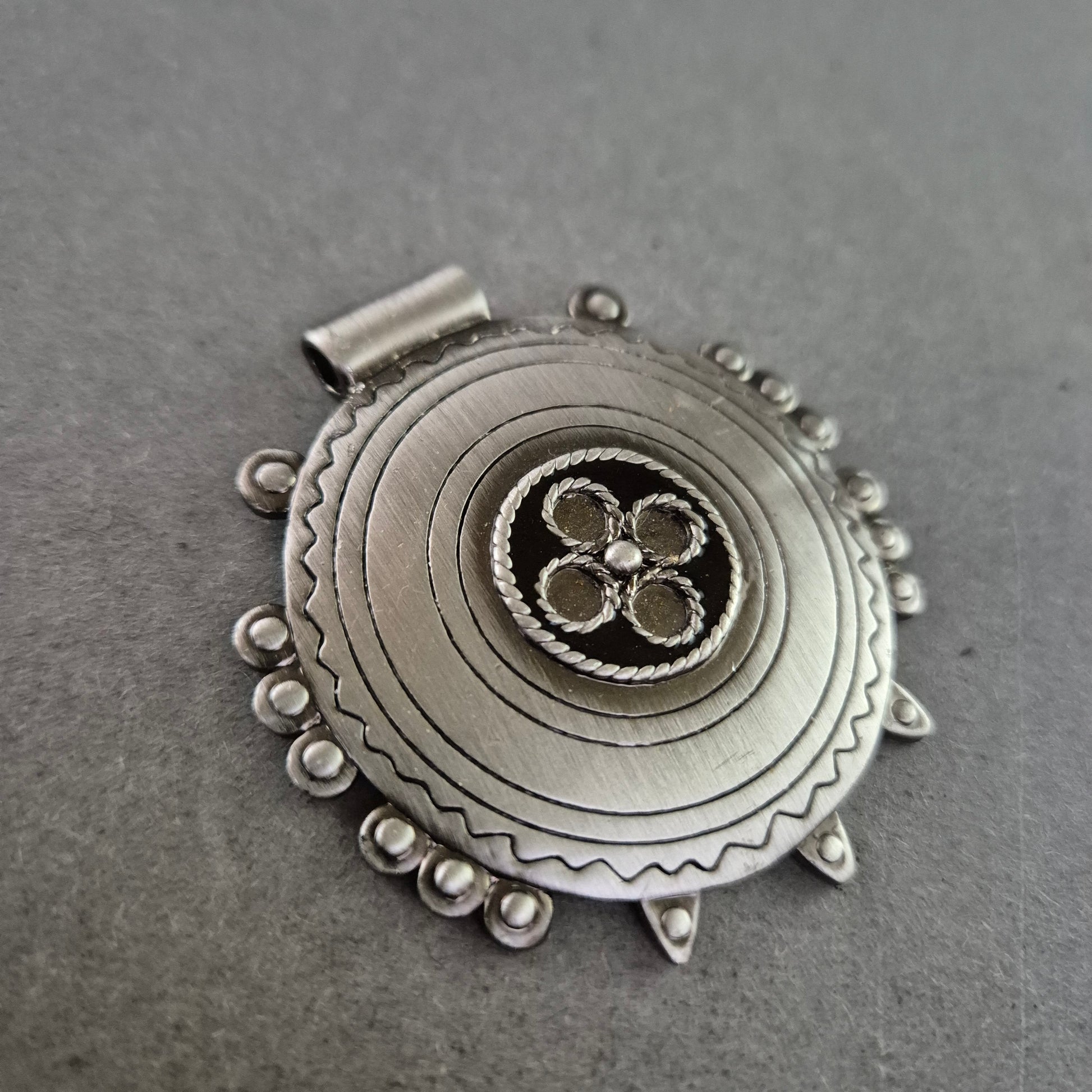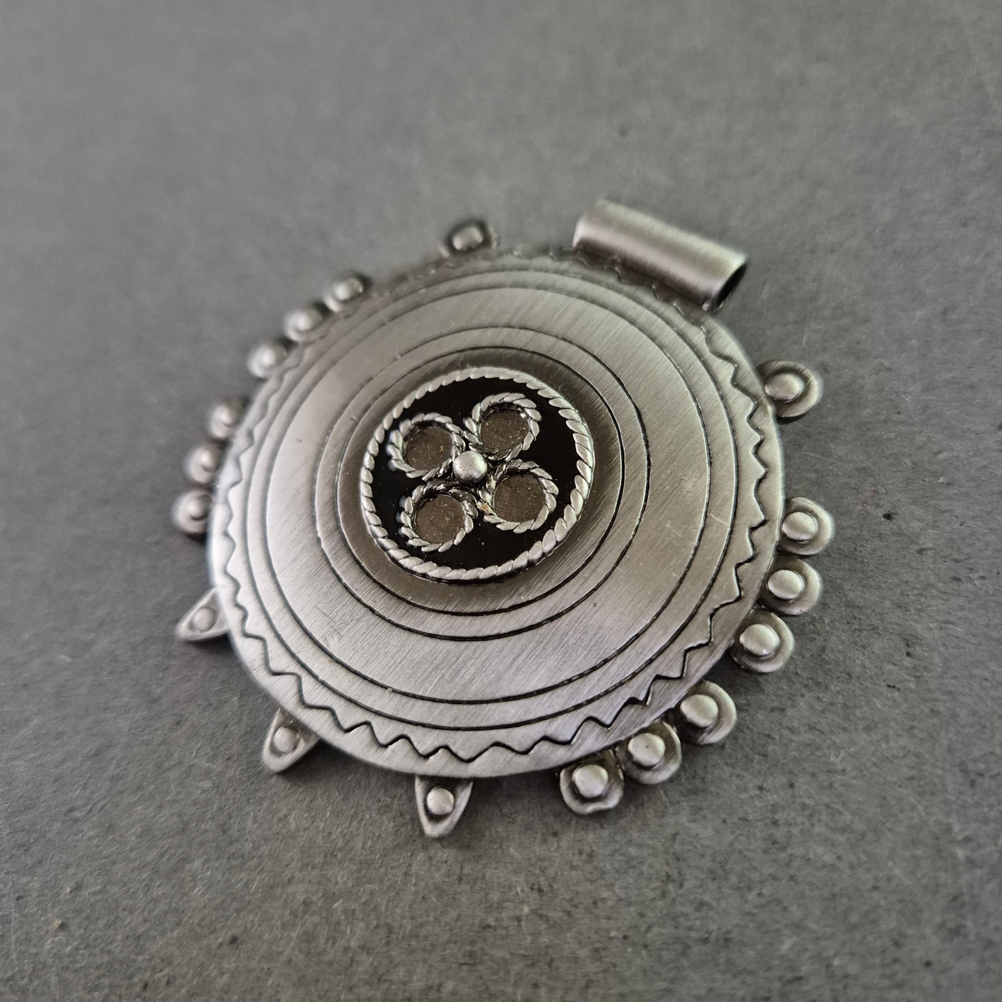 Dieser dekorative Anhänger im Ethnostil überzeugt mit einem auffälligen, orientalisch inspirierten Design. Die strukturierte Oberfläche und das florale Zierelement in der Mitte verleihen ihm eine handgearbeitete Anmutung. Die silberfarbene Optik wirkt edel, besteht jedoch nicht aus echtem Silber. Ideal für Modeschmuck-Liebhaber oder als Blickfang an einer langen Kette.