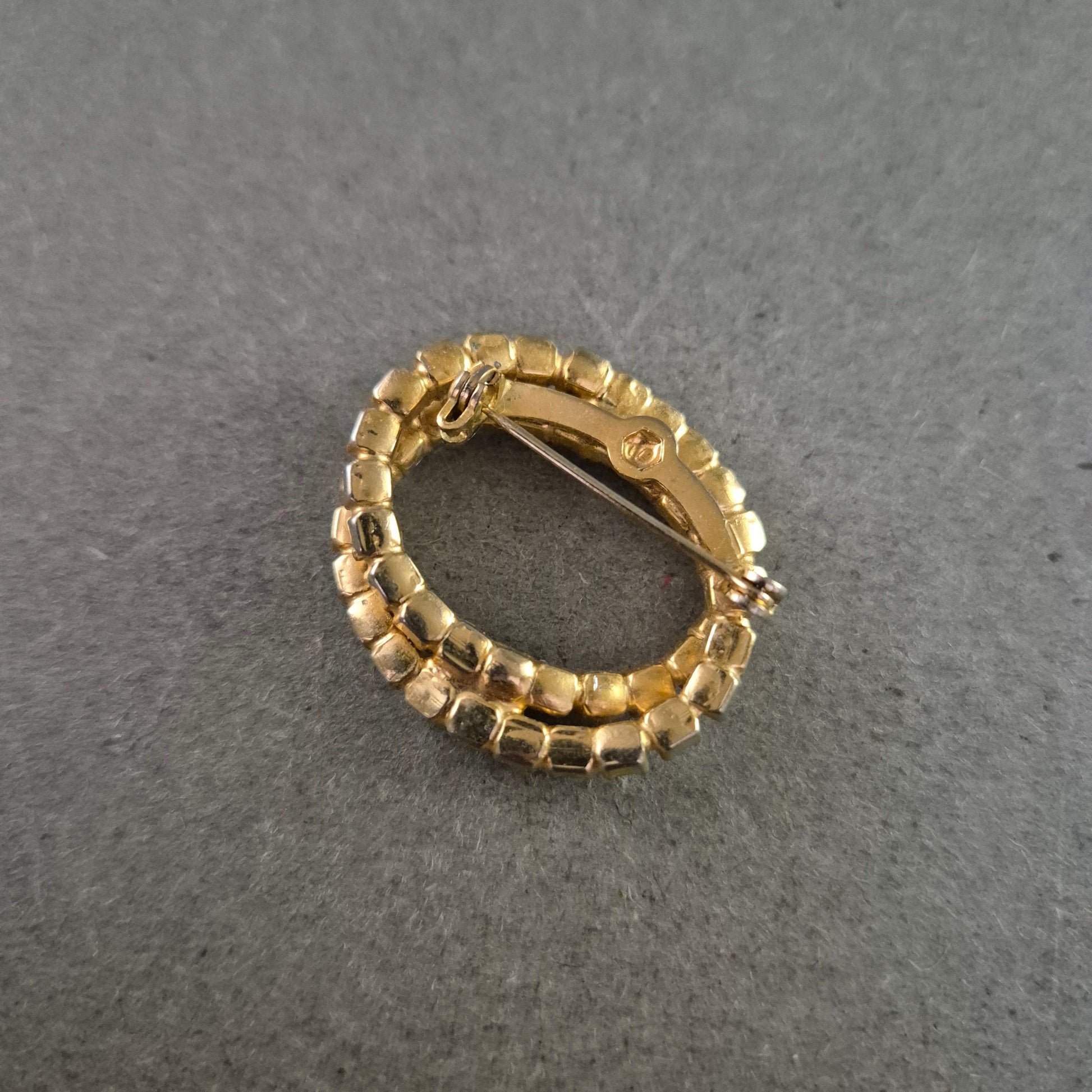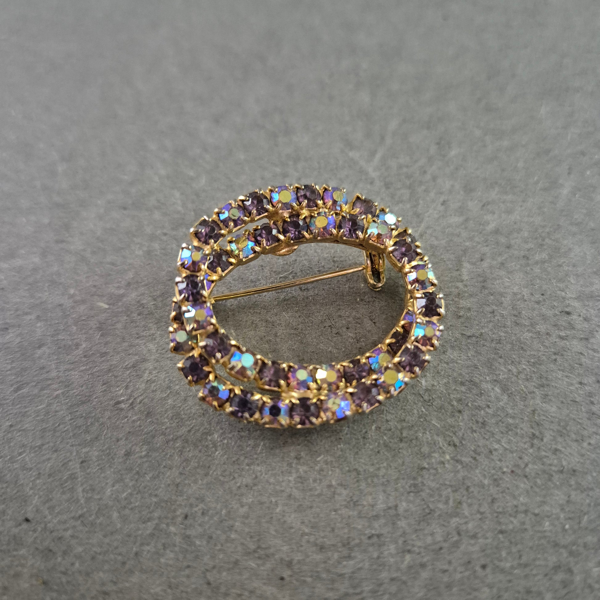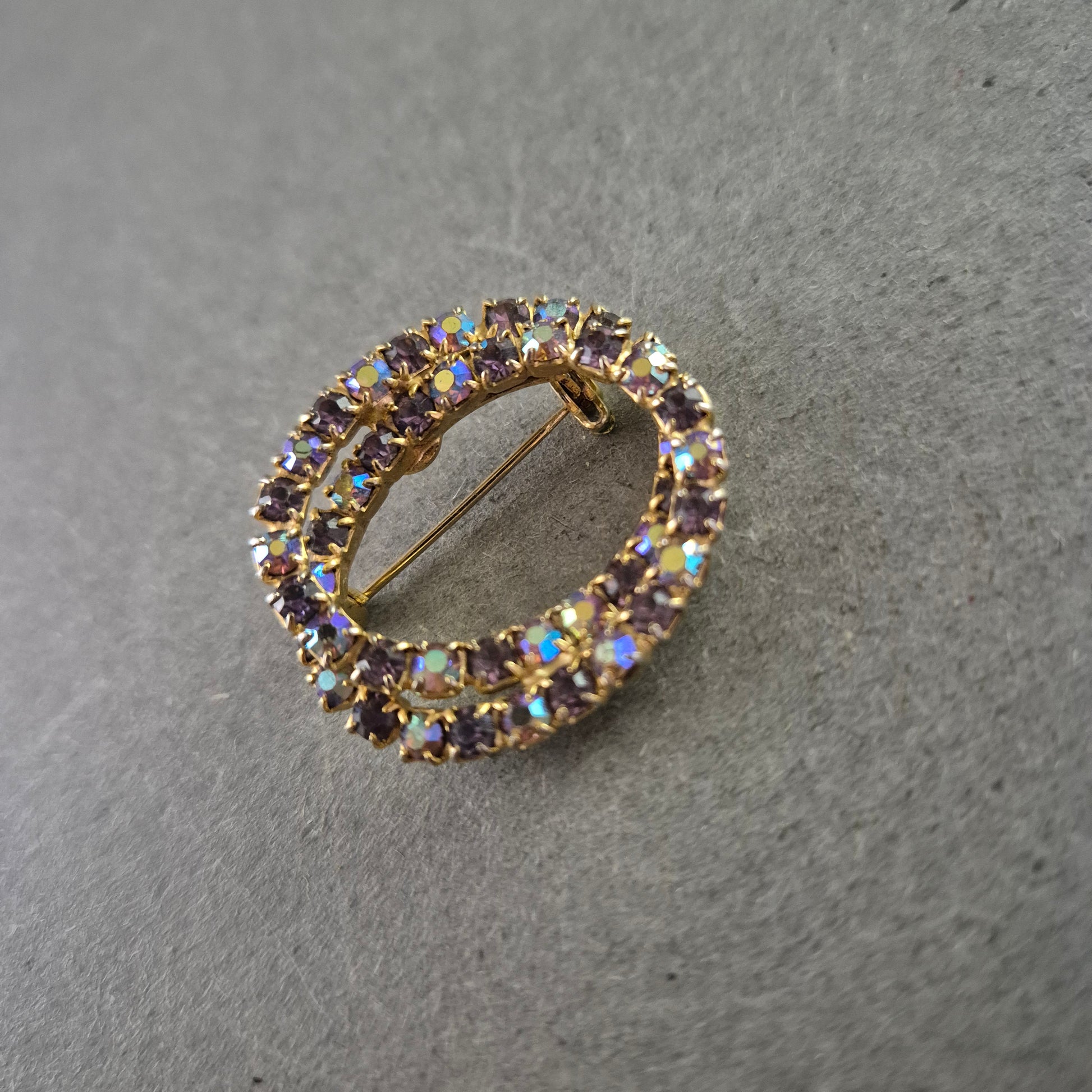 Diese auffällige Vintage-Brosche in ovaler Form beeindruckt durch ihre doppelreihige Besetzung mit lilafarbenen Strasssteinen, die bei Lichteinfall in schimmernden Tönen reflektieren. Die goldfarbene Rückseite ist solide verarbeitet und mit einem klassischen Sicherheitsverschluss versehen. Perfekt für stilvolle Outfits mit einem Hauch Retro-Glamour.