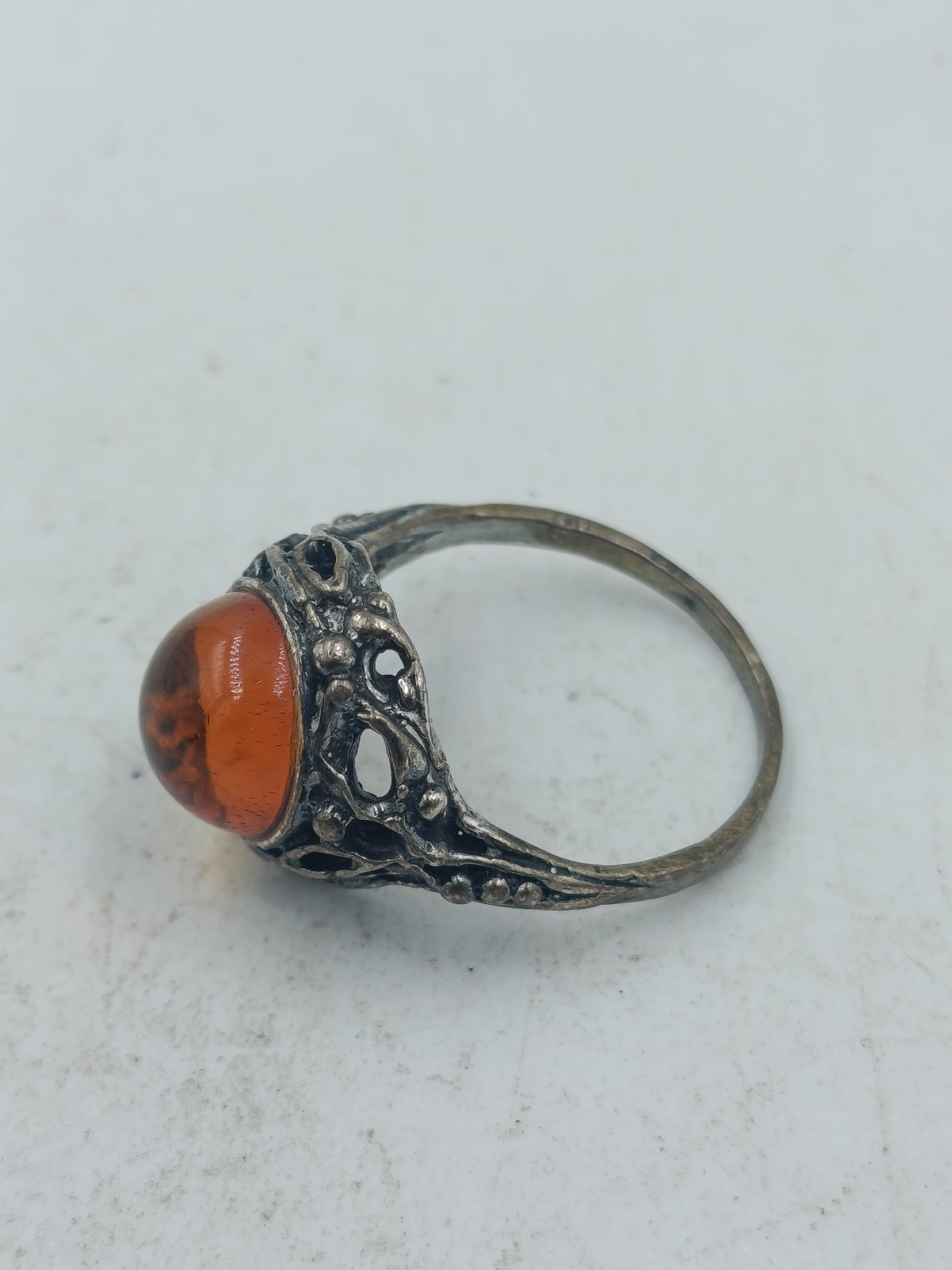 Ring mit bernsteinfarbenem Stein und kunstvoll durchbrochener Silberoptik im klassischen Design