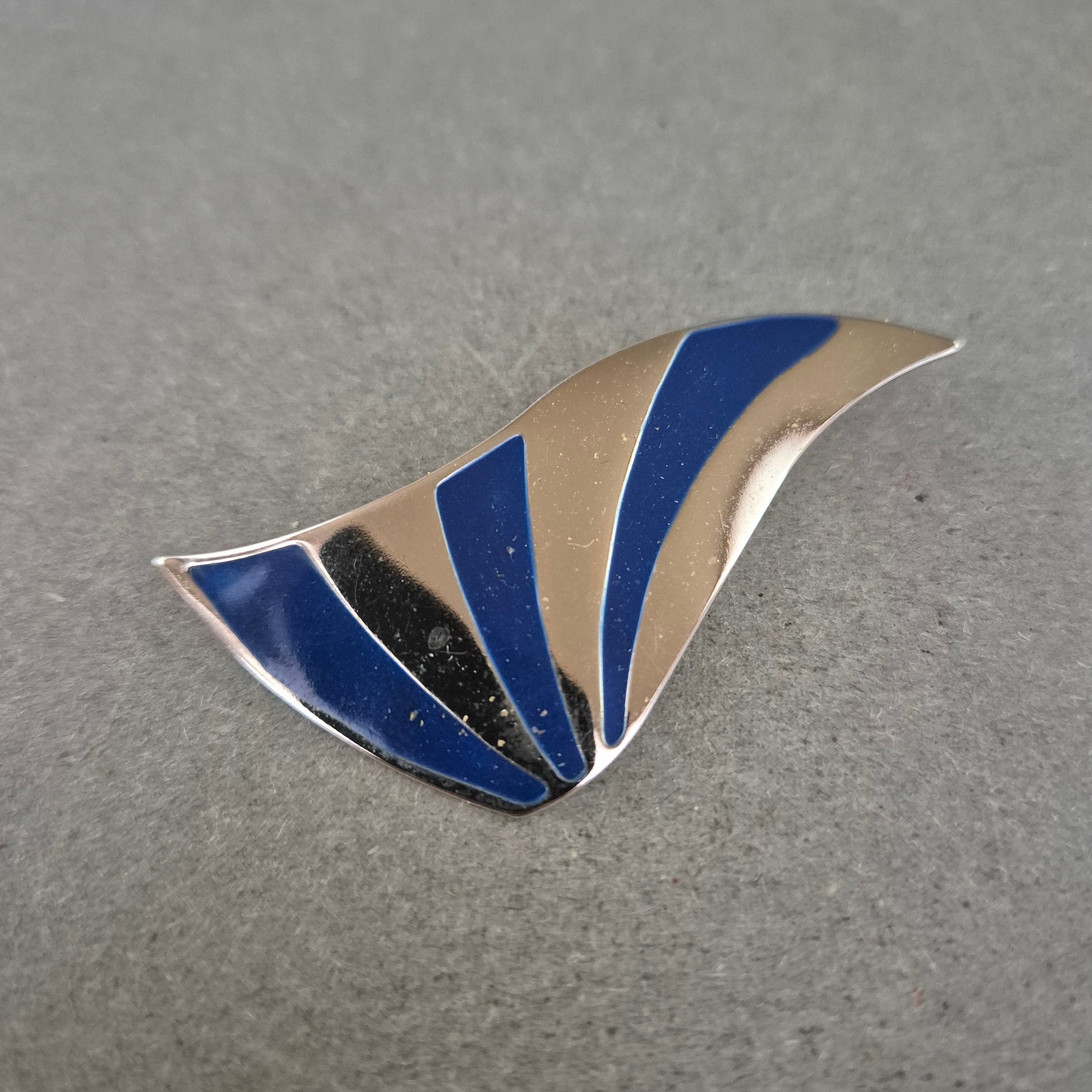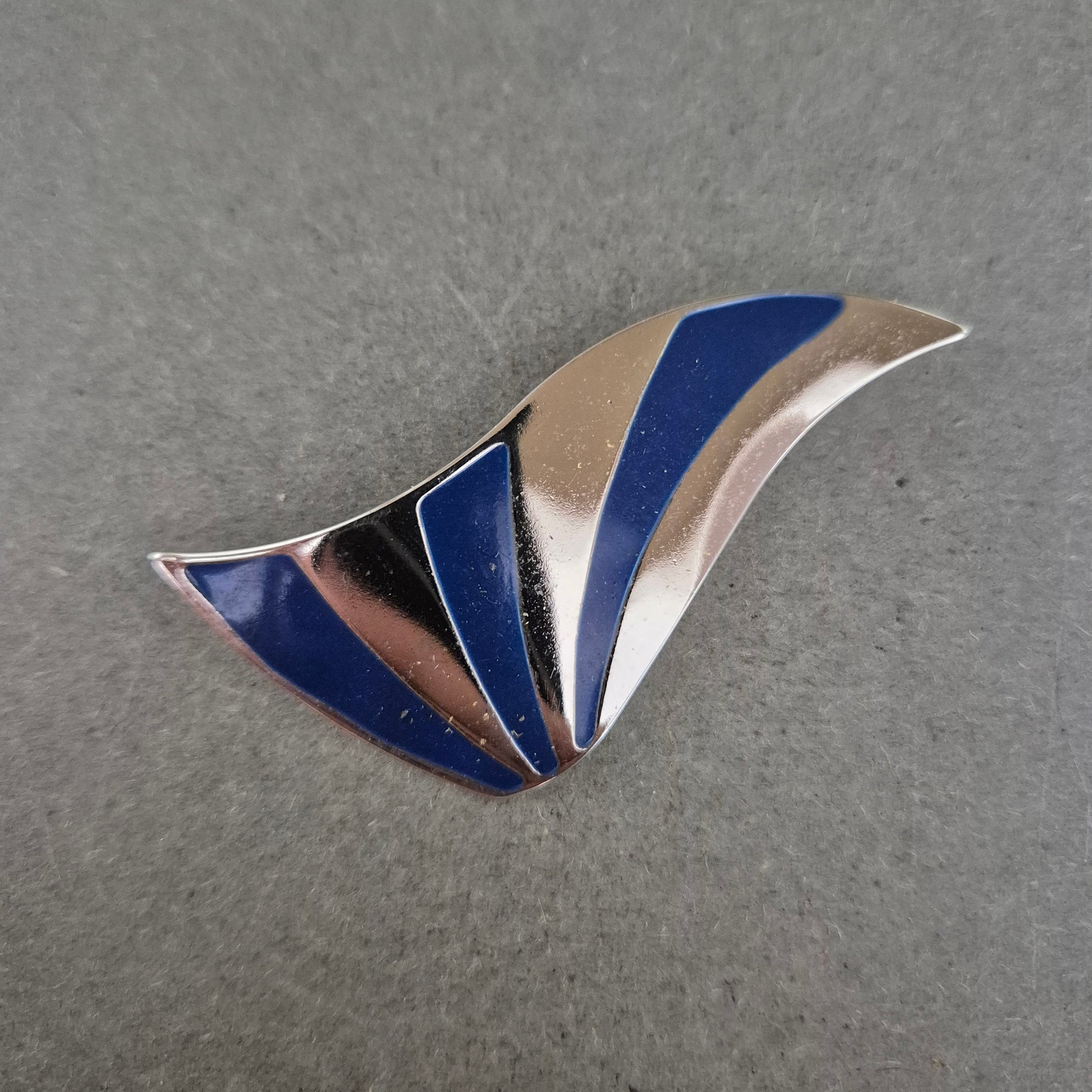 Diese elegante Brosche im geschwungenen Art-Déco-Stil kombiniert modernes Design mit klassischer Raffinesse. Das glänzend silberne Metall trifft auf tiefblaue Emaille-Akzente, die der Brosche eine ausdrucksstarke und gleichzeitig feminine Optik verleihen. Ideal als Hingucker an Bluse, Blazer oder Schal.