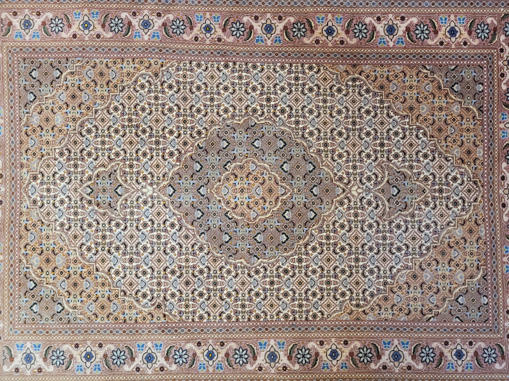 angeboten wird ein edler Täbriz Teppich aus feiner Korkwolle mit Seidenelementen, handgeknüpft in detailreicher Ausführung. Das Design besticht durch ein reiches Allover-Muster mit geometrisch-floraler Struktur und feinen Medaillonabstufungen, die dem Teppich Tiefe und Eleganz verleihen.