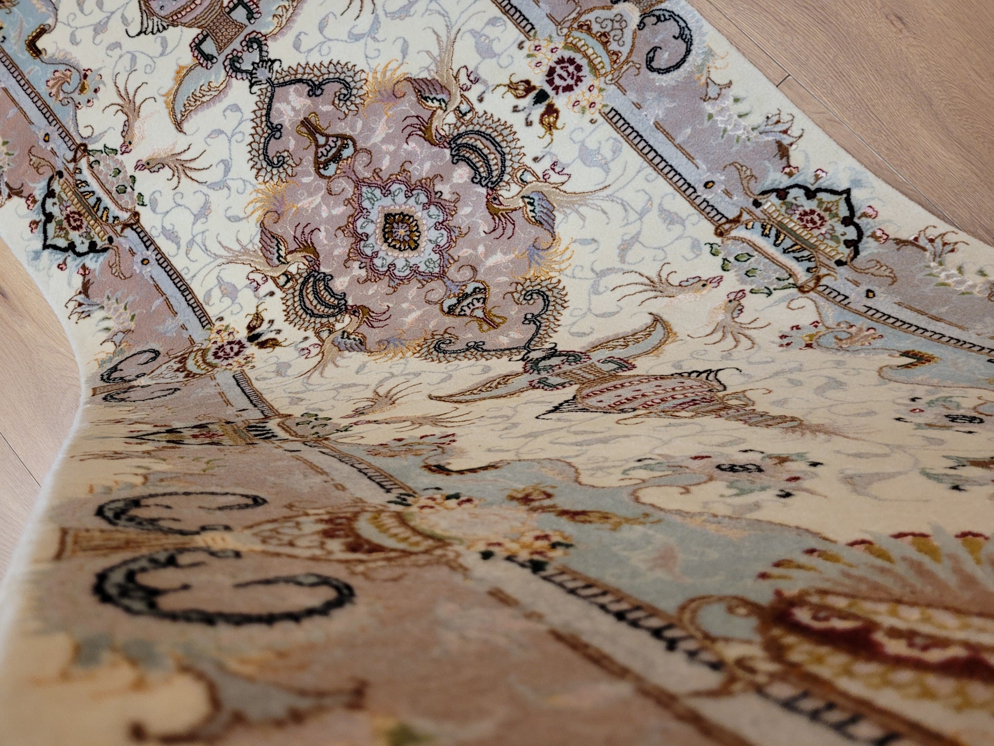 angeboten wird ein feiner Täbriz Teppich aus Korkwolle mit eingelegten Seidenelementen, handgeknüpft in meisterhafter Ausführung. Das Design zeigt ein reich verziertes Mittelmedaillon, eingebettet in ein symmetrisches Ornamentfeld mit floralen Details und dekorativen Vasenmotiven. Durch die Kombination von zarten Pastelltönen und seidigem Glanz entsteht eine elegante und harmonische Wirkung.