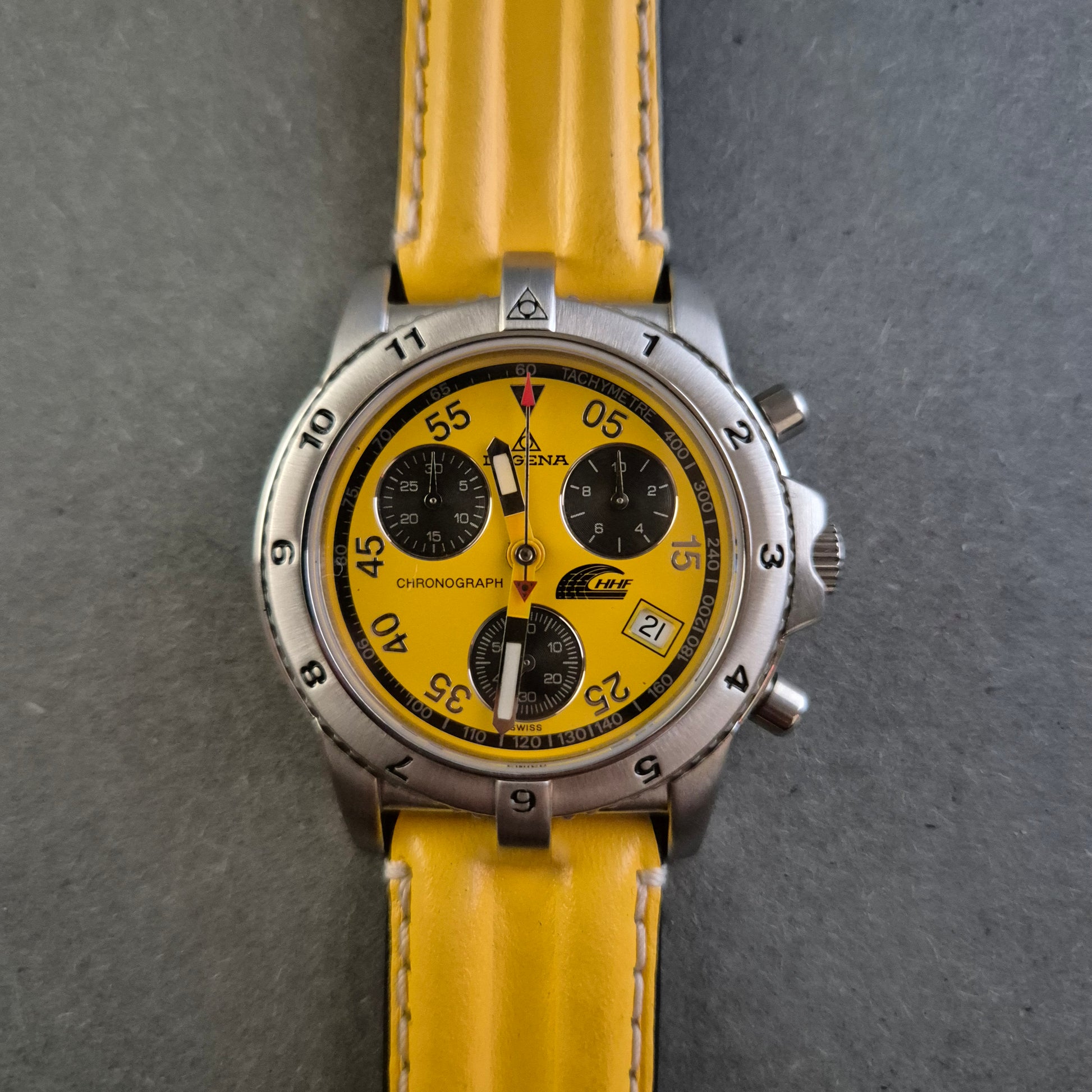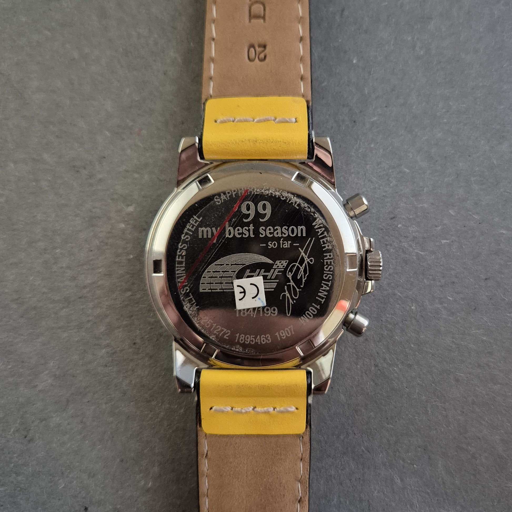 Diese Dugena Herrenarmbanduhr ist ein echter Blickfang und ideal für Sammler oder Liebhaber markanter Sportuhren. Mit ihrem kräftig gelben Zifferblatt, drei Totalisatoren und einem robusten Edelstahlgehäuse vereint sie sportliche Ästhetik mit funktionaler Präzision. Die Rückseite ist mit der Gravur „99 – my best season so far“ sowie einer Limitierungsnummer (184/199) versehen, was diese Uhr zu einem raren Sammlerstück macht.