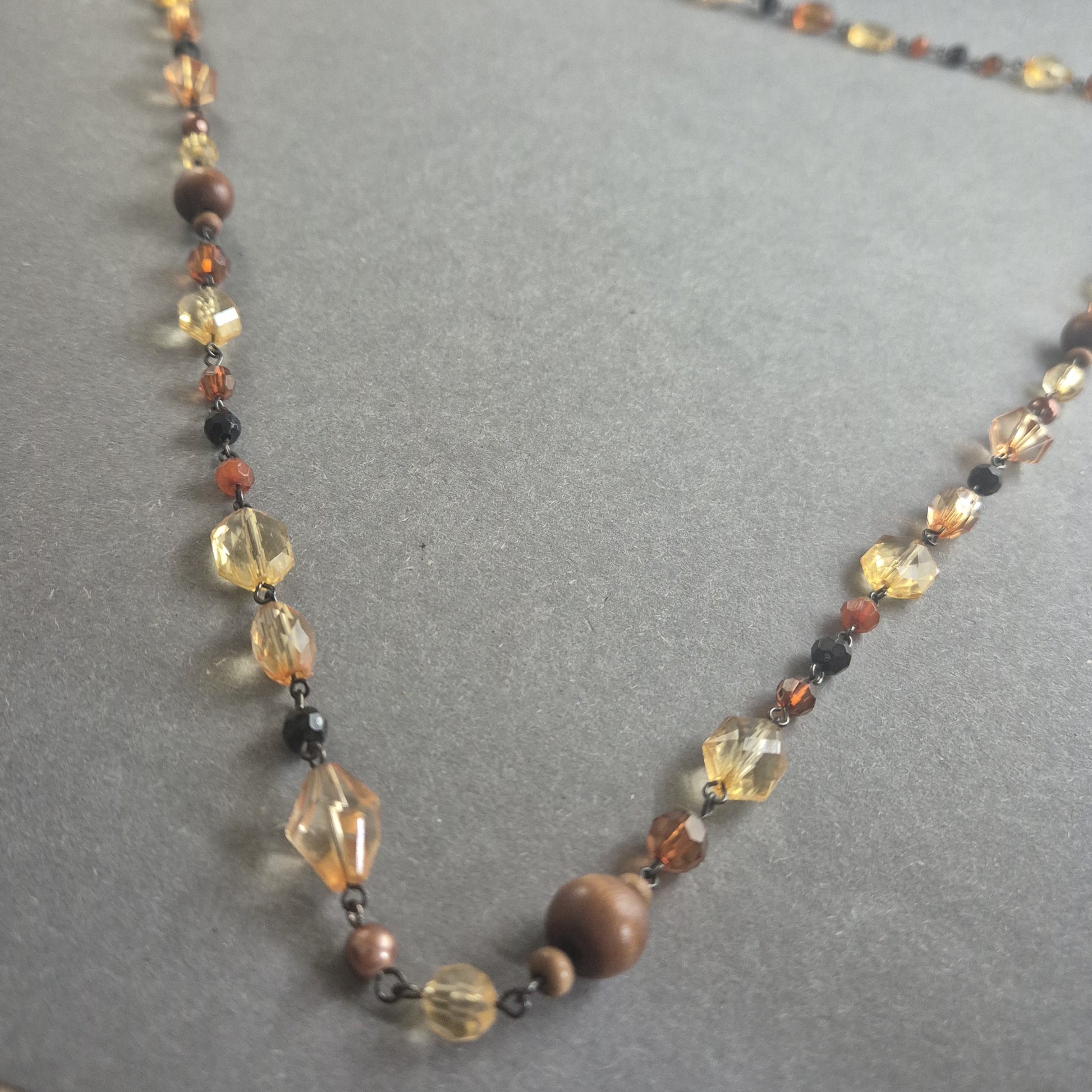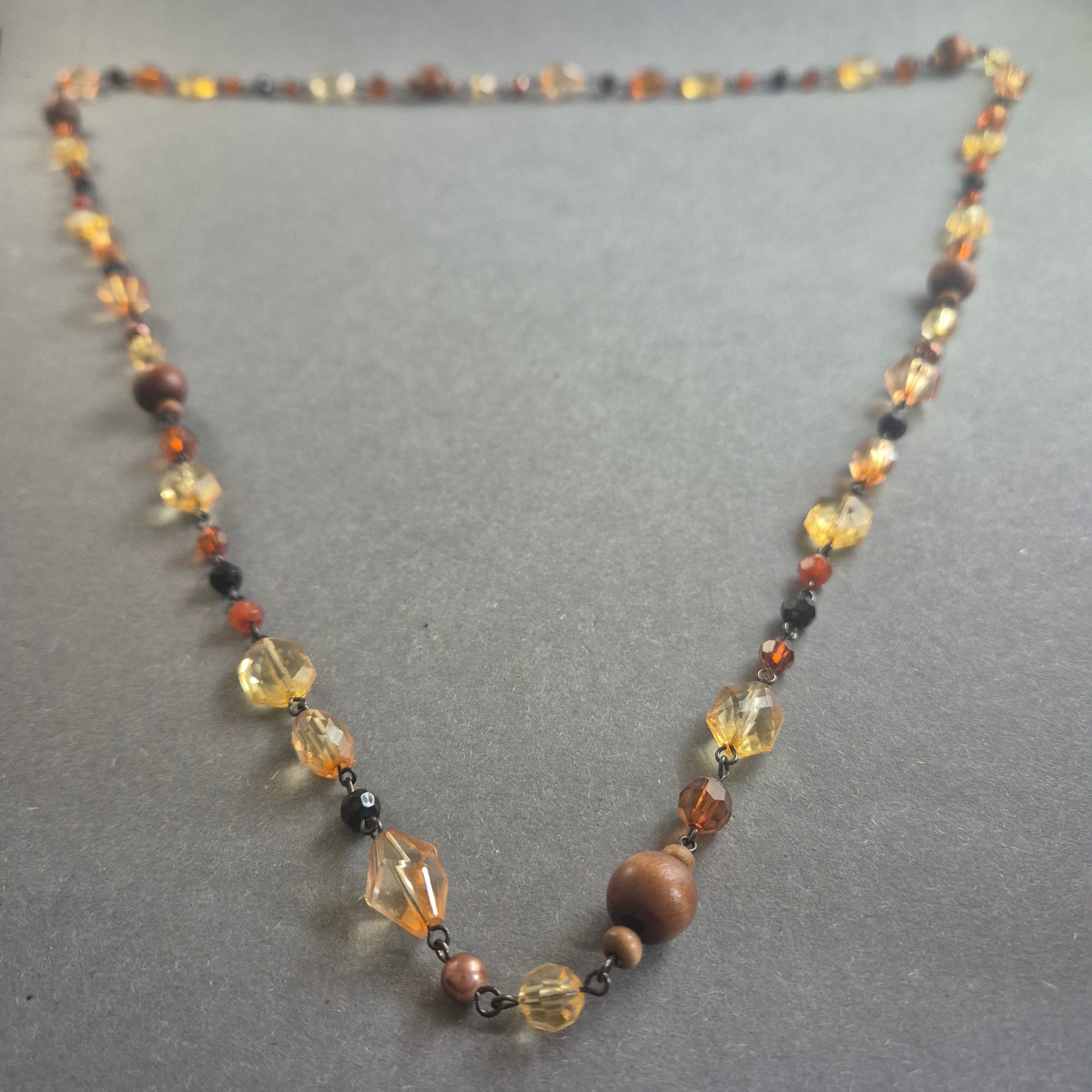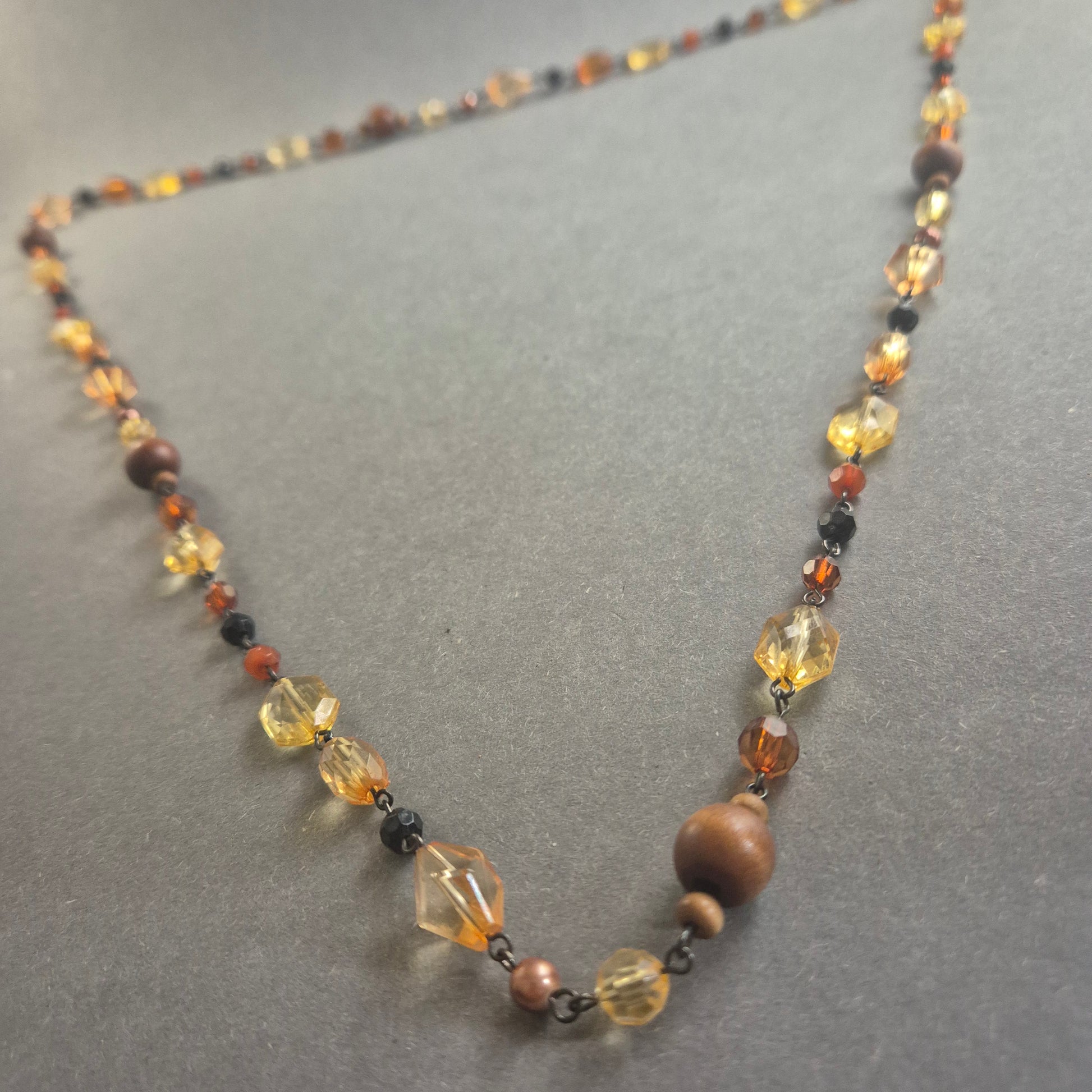 Diese einzigartige Vintage-Halskette kombiniert facettierte Glasperlen in warmen Bernstein- und Karamelltönen mit natürlichen Holzperlen. Das harmonische Zusammenspiel von transparenten, glänzenden Glasperlen und den matten, erdigen Holzelementen verleiht der Kette eine zeitlose und zugleich rustikale Eleganz. Perfekt für den Herbst oder um jedem Outfit eine warme, natürliche Note zu verleihen.