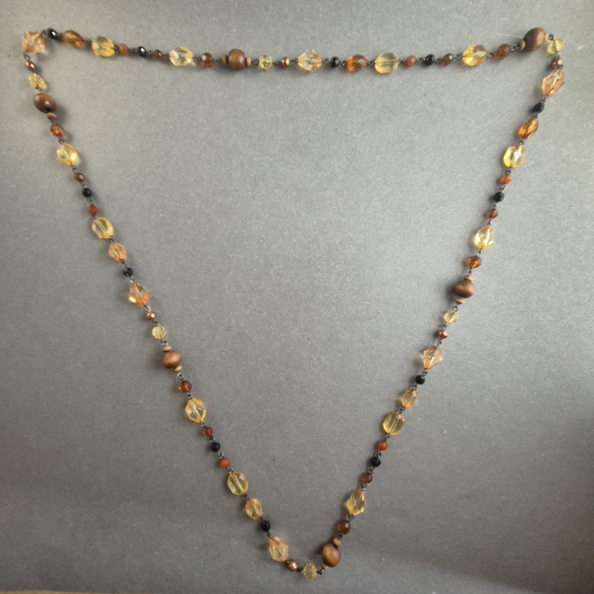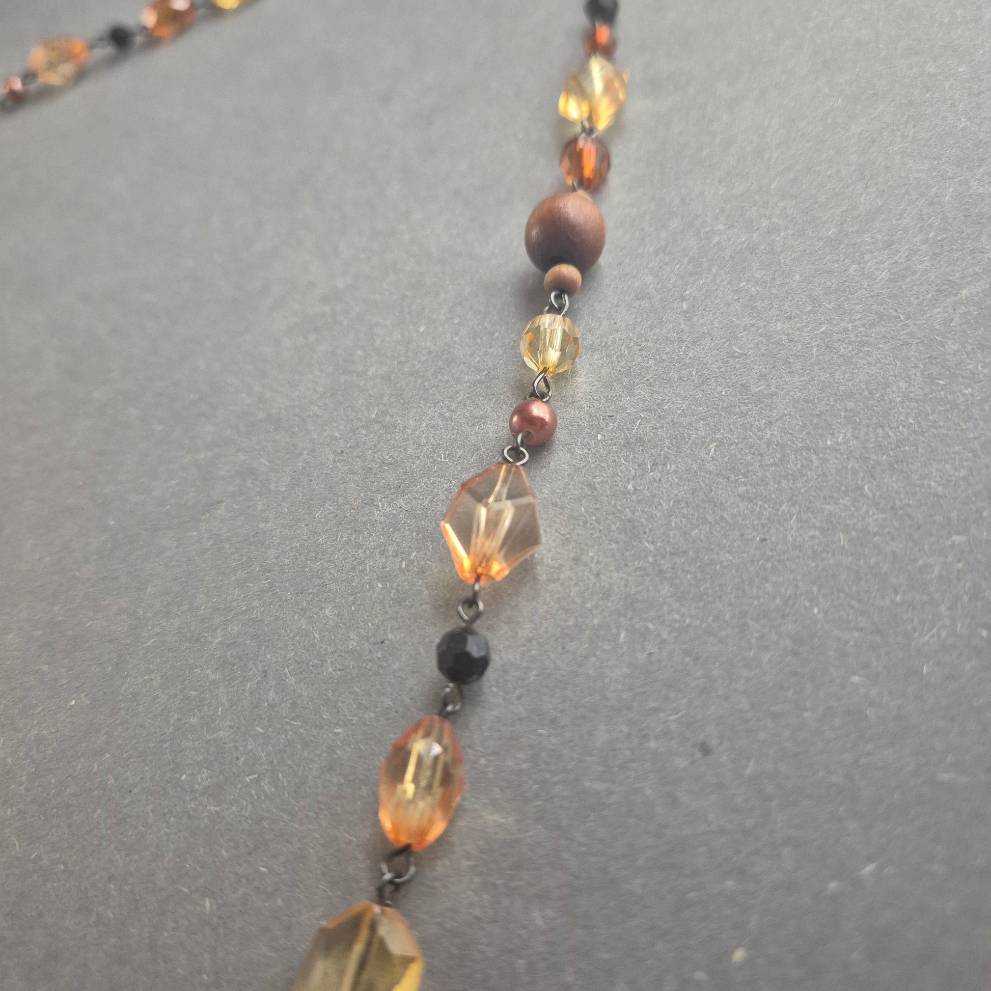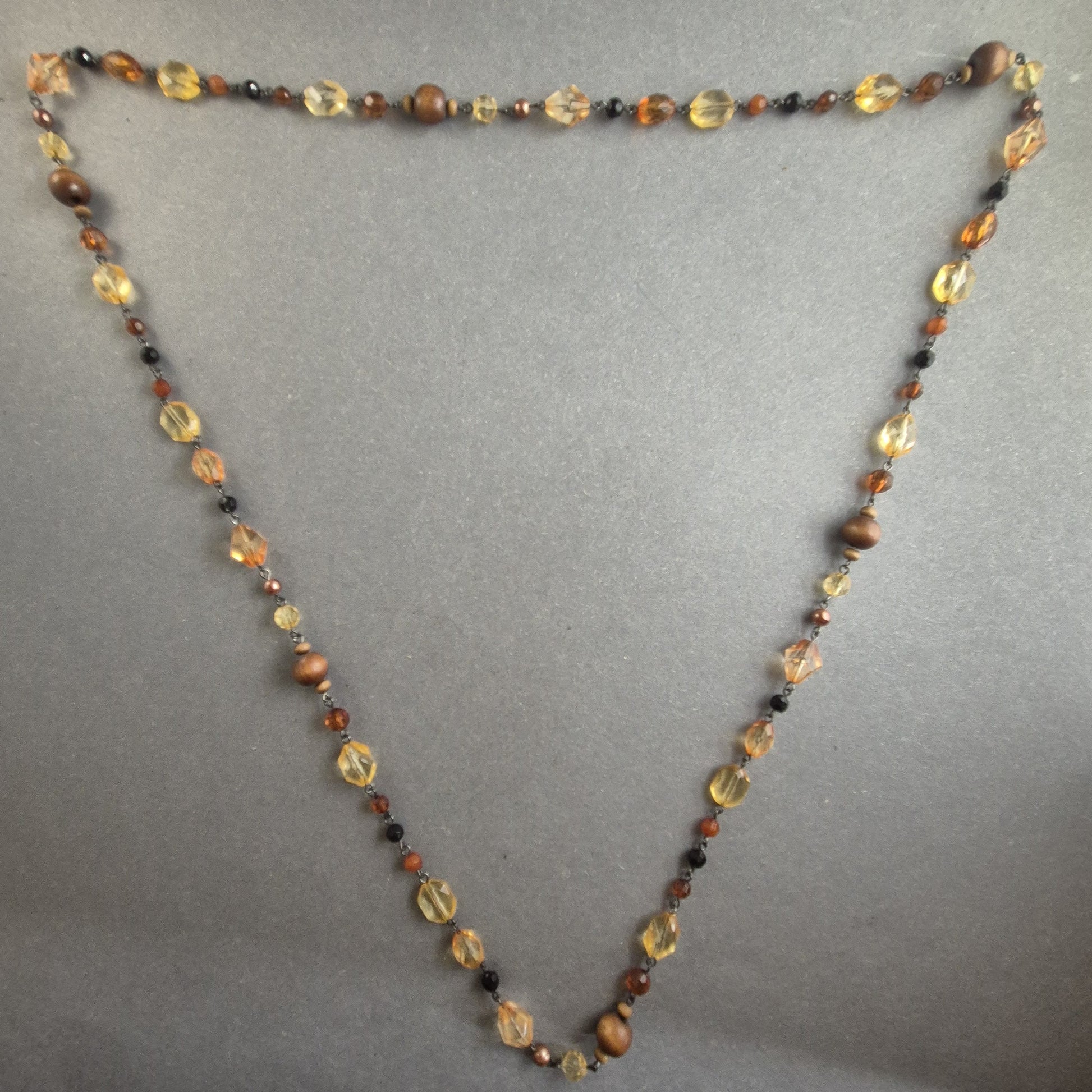 Diese einzigartige Vintage-Halskette kombiniert facettierte Glasperlen in warmen Bernstein- und Karamelltönen mit natürlichen Holzperlen. Das harmonische Zusammenspiel von transparenten, glänzenden Glasperlen und den matten, erdigen Holzelementen verleiht der Kette eine zeitlose und zugleich rustikale Eleganz. Perfekt für den Herbst oder um jedem Outfit eine warme, natürliche Note zu verleihen.